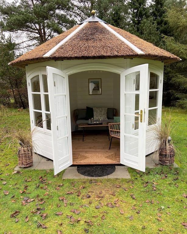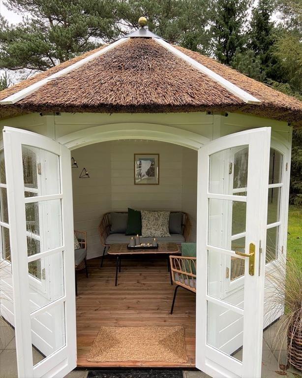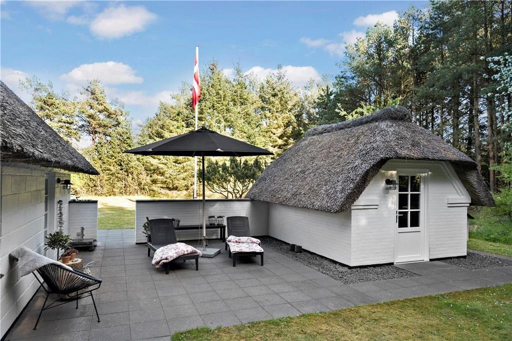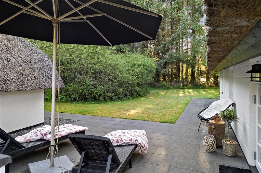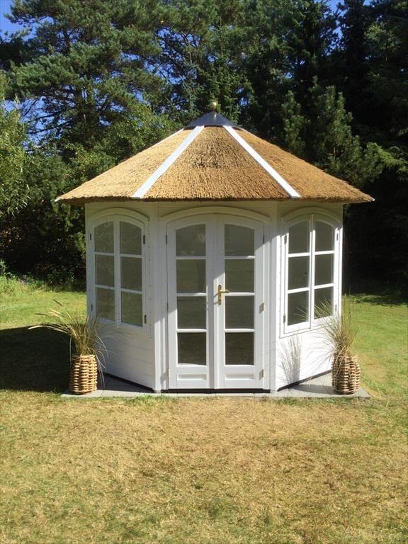 Der Garten deines Ferienhauses erweist sich als friedvolle Oase. Die umliegenden Bäume schaffen einen behaglichen Rahmen und sorgen für Ruhe und Privatsphäre. Alle Mitreisenden werden hier im Nu ihren ganz persönlichen Lieblingsplatz finden - sei es in der Hängematte, in der man mit Blick auf den Himmel die herrliche Stille genießt, oder auf der Terrasse, auf den komfortable Gartenmöbel, die zu entspannten und geselligen Stunden in der Sonne einladen. Ganz gleich, ob du dich mit deinem Lieblingsgetränk auf der Terrasse niederlässt, das Buch, das du schon immer einmal lesen wolltest, zur Hand nimmst oder den Tisch für ein geselliges Abendessen im Freien deckst, du spürst zu jeder Zeit, das dieser Garten beste Erholungsmöglichkeiten bietet. Deine Kinder werden es lieben, auf der Grasfläche umherzutollen und zu spielen. Außerordentlich schön und stimmungsvoll präsentiert sich der Gartenpavillon. Der Pavillon erweist sich als gemütlicher und geschützter Rückzugsort für lange Gespräche, kleine Pausen und ruhige Momente, die nur noch besser werden, wenn du sie mit deinen Lieben teilst.