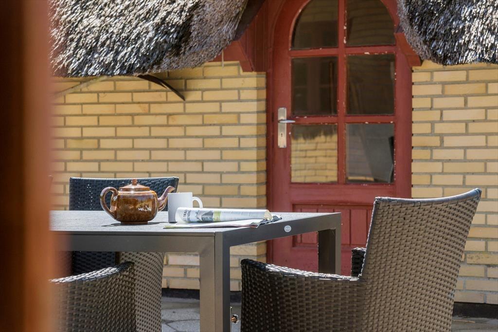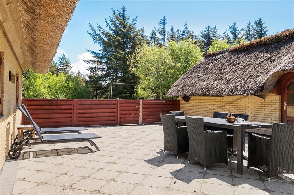 Vom Wohnraum genießen Sie einen direkten Zugang zum schönen großen geschlossenen Innenhof in Form einer Terrasse. Ein Sonnenschirm, Gartenmöbel und Liegestühle sind selbstverständlich vorhanden. Das Haus liegt auf einem schönen großen Naturgrundstück, das von Bäumen umgeben ist, die Ihnen angenehmen Windschutz spenden.
