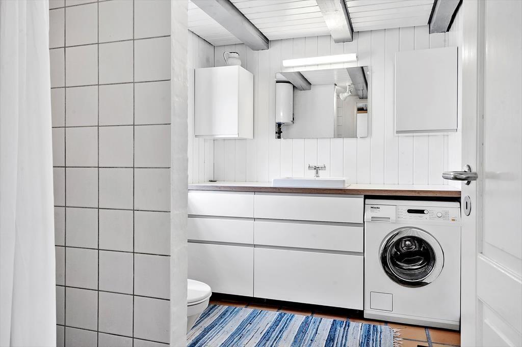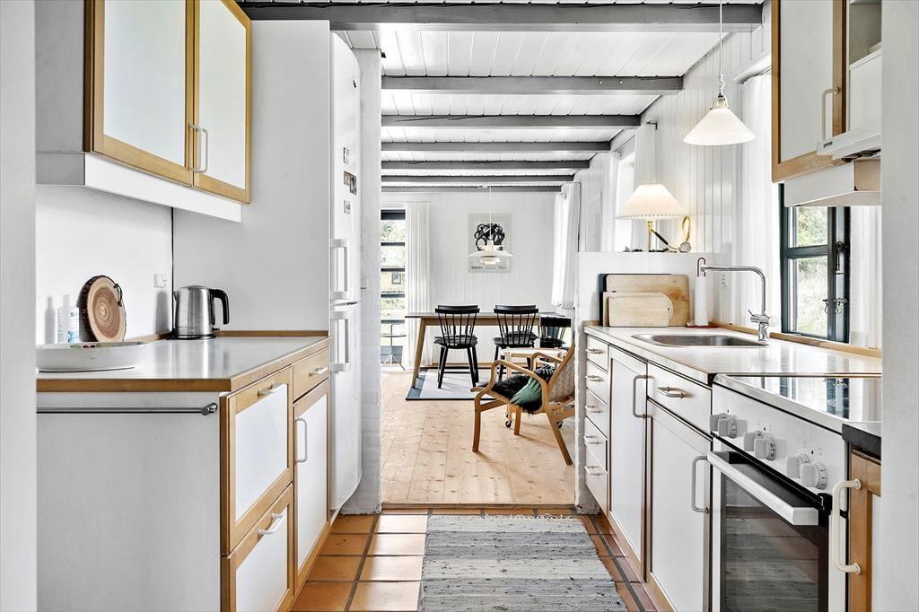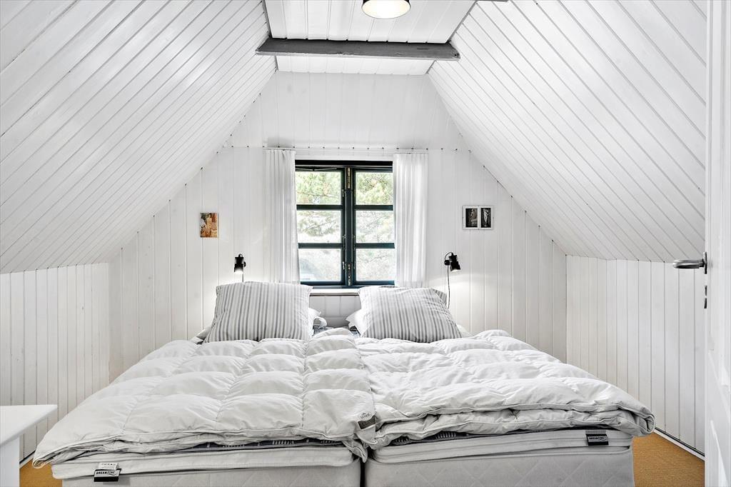 Dieses Ferienhaus ist hell und gemütlich mit guten Möbeln eingerichtet. Der Wohnraum besticht mit einem schönen Holzfußboden. Ein Kaminofen sorgt für behagliche Temperaturen an kühlen Sommerabenden und in der dunklen Jahreszeit. Das Haus beinhaltet eine gut ausgestattete Küche mit einem Fliesenboden, die teils offen mit dem Wohnraum verbunden ist. Ein schönes, helles Badezimmer mit einer Dusche und einer Waschmaschine ist vorhanden. Im Obergeschoss treffen Sie auf zwei Schlafräume, von denen einer mit einem Doppelbett (Boxmatratzen) eingerichtet ist. Im zweiten Schlafraum stehen zwei Einzelbetten (Boxmatratzen) für Sie bereit. Beide Räume sind mit einem Teppichboden versehen und verwöhnen mit einer schönen Aussicht über die Umgebung.