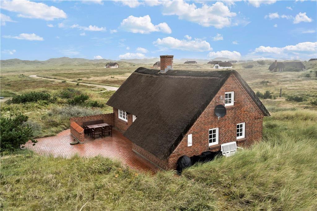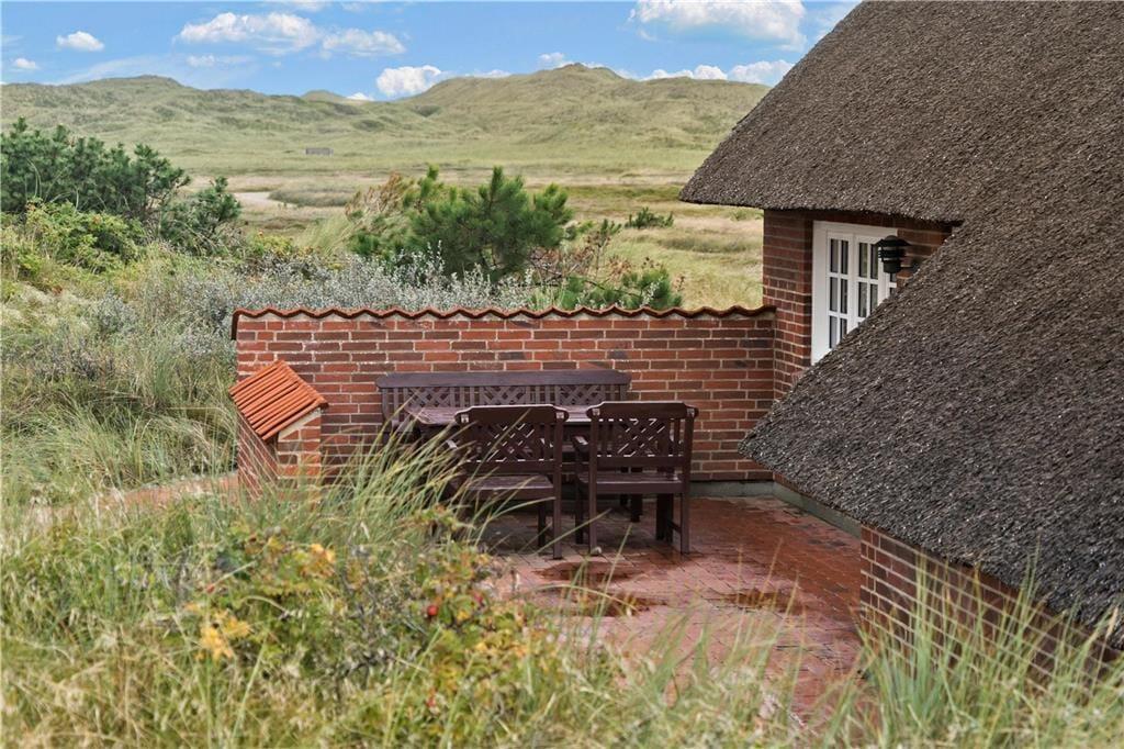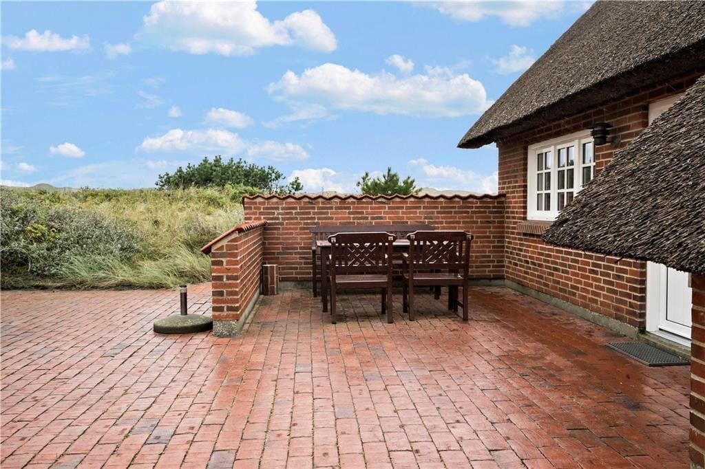 Feriehuset har en dejlig flisebelagt syd-østvendt terrasse med gode havemøbler. Herfra kan man nyde den skønne udsigt og blot slappe af fra hverdagens gøremål. På grunden bag huset er der en klit, hvorpå ejer har opsat en bænk og med hvilken udsigt. Herfra kan man sidde og se solen gå ned i vest bag klitterne.