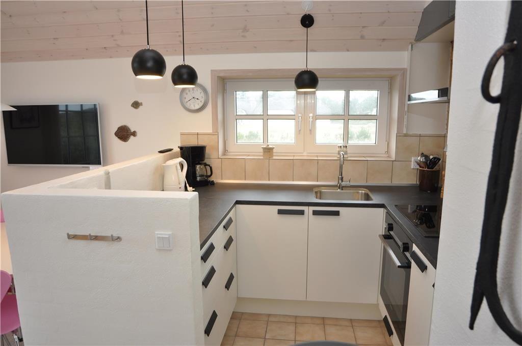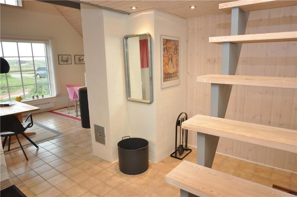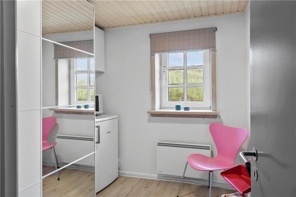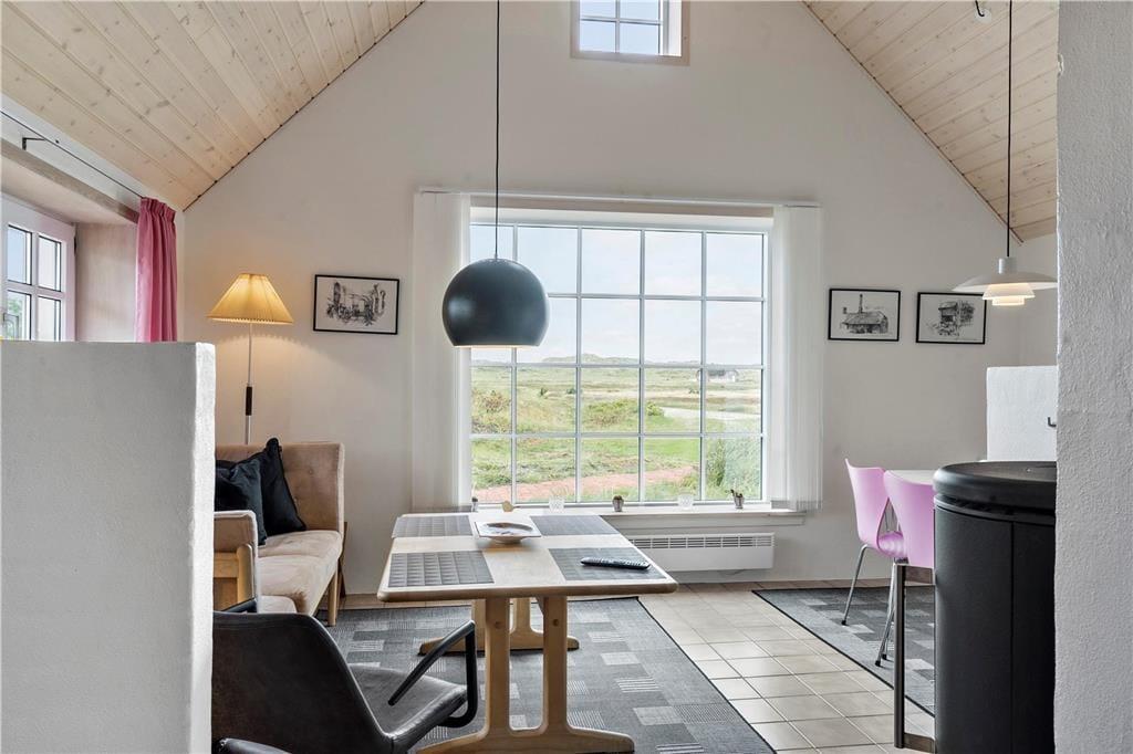 Et skønt og ny-renoveret feriehus i 2 etager med lys og venlig indretning. Feriehuset har en kombineret opholdsstue og spiseafdeling med åben forbindelse til et flot, nyt køkken. Fra opholdsstue og spiseafdeling har man en fantastisk udsigt til det skønne vestjyske klitlandskab. Stueetagen er ligeledes indrettet med et soverum med dobbeltseng og pænt badeværelse med bruser og en mini-vaskemaskine. Et værelse med skabsplads, fryser og mikroovn og med god plads til bagagen. På 1. sal er der en repoe, hvorfra man kan kigge ned i stuen og køkkenet. Et soverum med 2 enkeltsenge