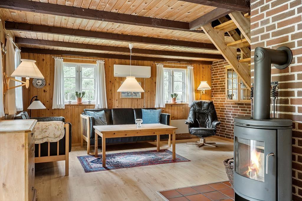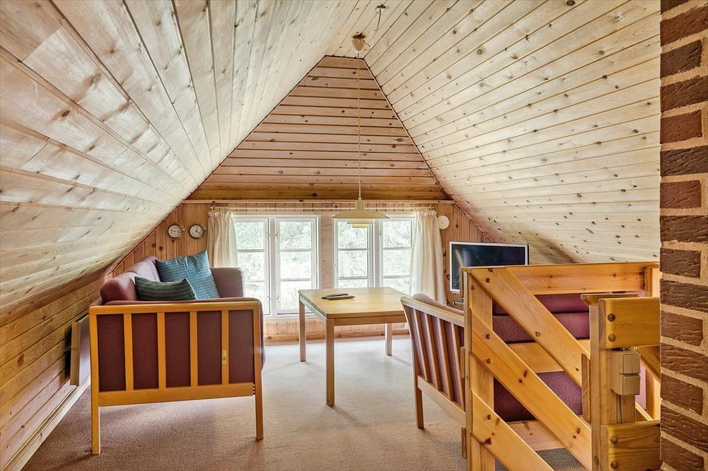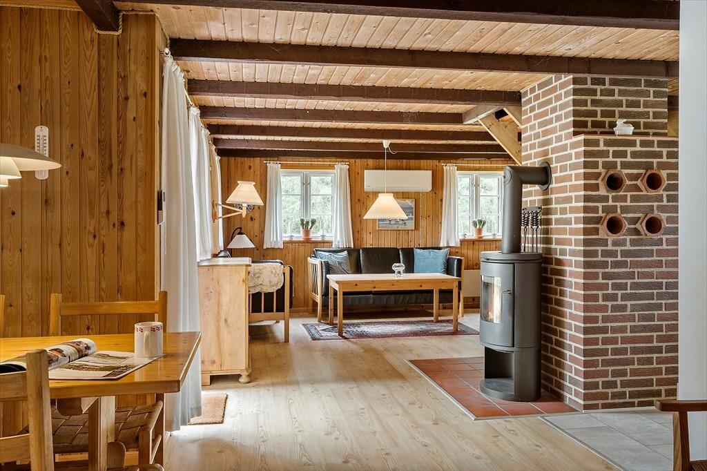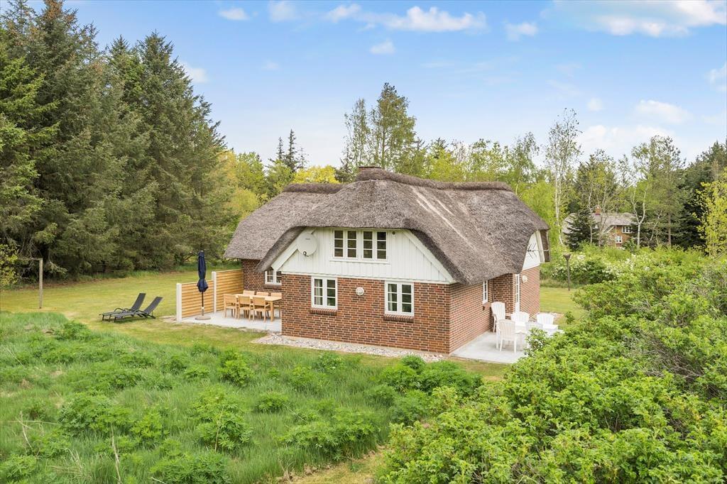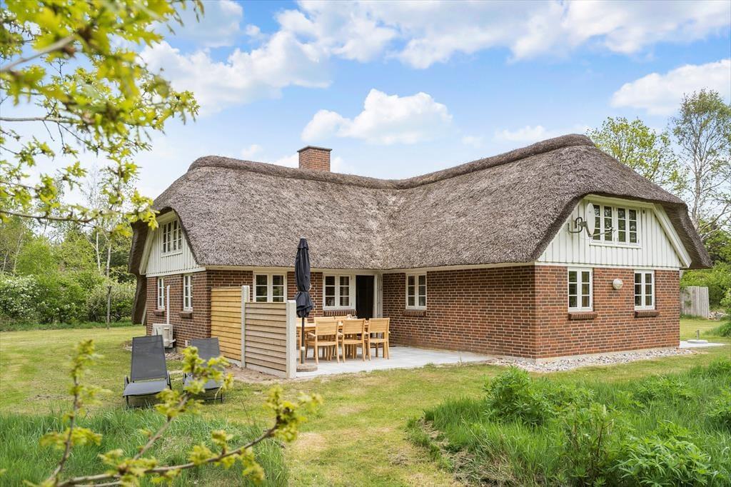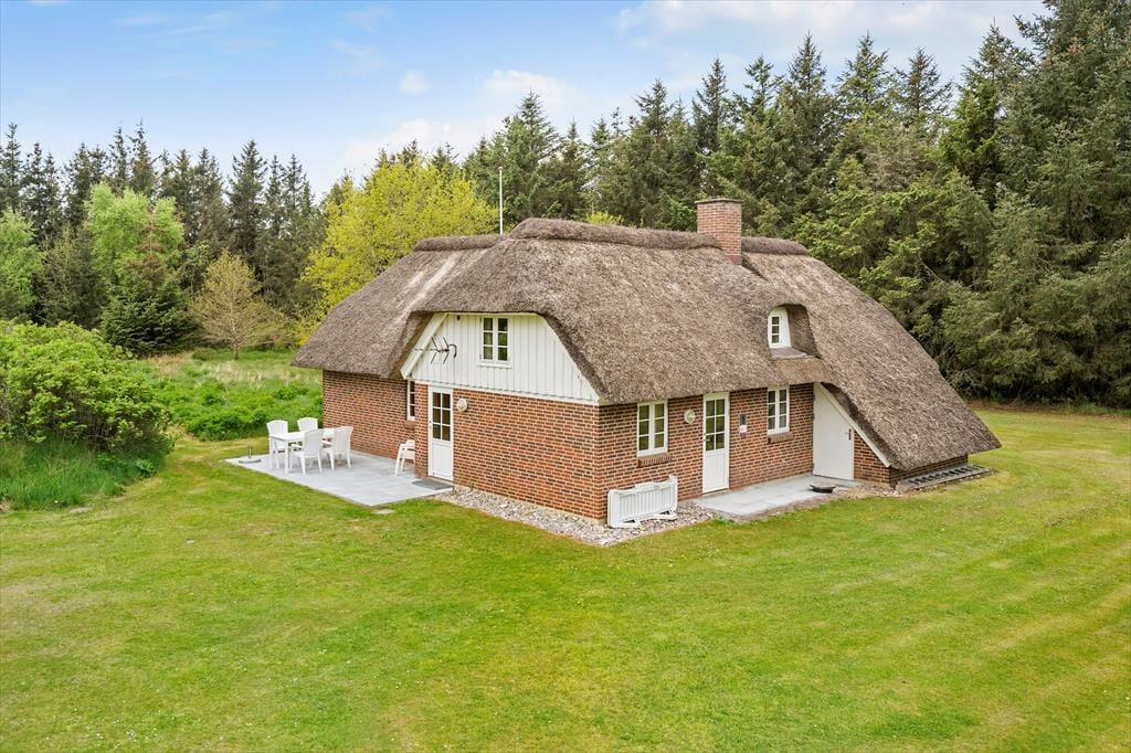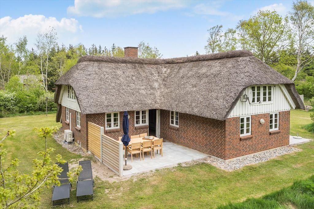 Schönes strohgedecktes Ferienhaus mit zwei Wohnzimmern. Das Haus ist gemütlich eingerichtet. Das Wohnzimmer hat eine offene Verbindung zu Esstimmer und Küche. Im Wohnzimmer können Sie sich in der kalten Jahreszeit am Kaminofen wärmen. Die Küche ist mit einer Geschirrspülmaschine, einer Mikrowelle und einem kleineren Gefrierfach ausgestattet. Im Erdgeschoss befinden sich drei Schlafzimmer, von denen eines mit einem Doppelbett, das zweite mit zwei Einzelbetten und das dritte mit einem Etagenbett eingerichtet ist. Das Badezimmer liegt ebenfalls im Erdgeschoss. Im Obergeschoss finden Sie das vierte, mit einem Doppelbett eingerichtete Schlafzimmer sowie ein zweites Wohnzimmer mit Fernseher.