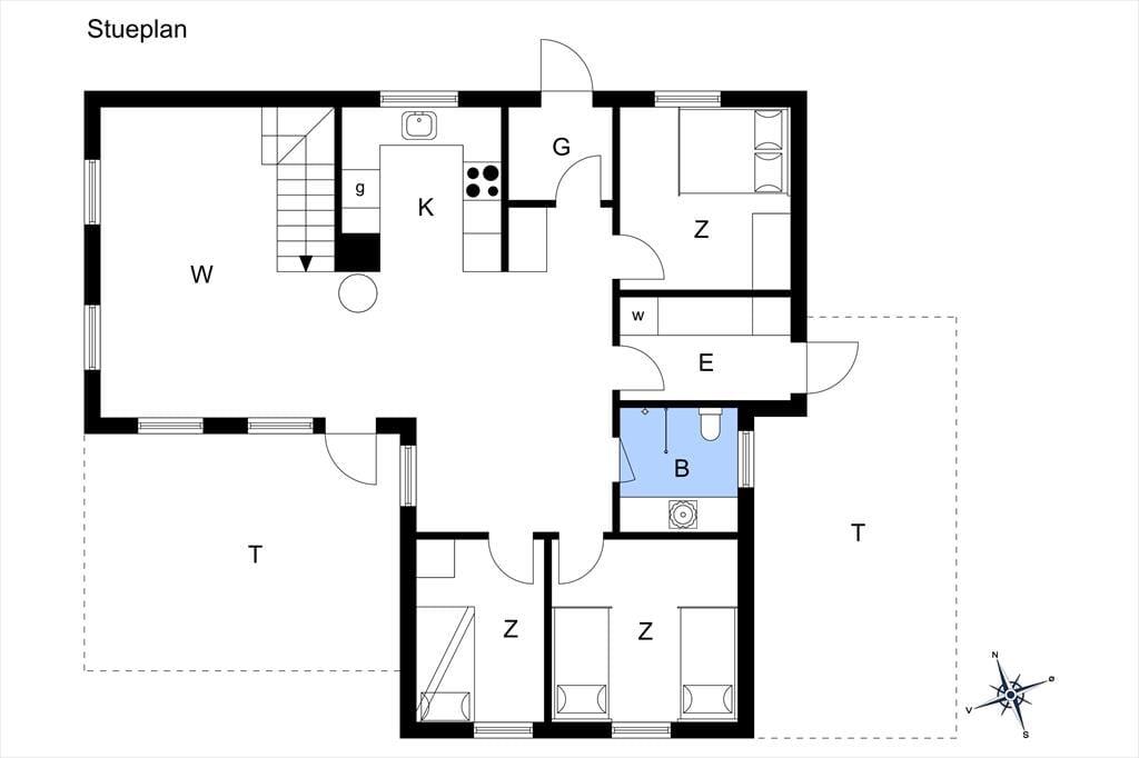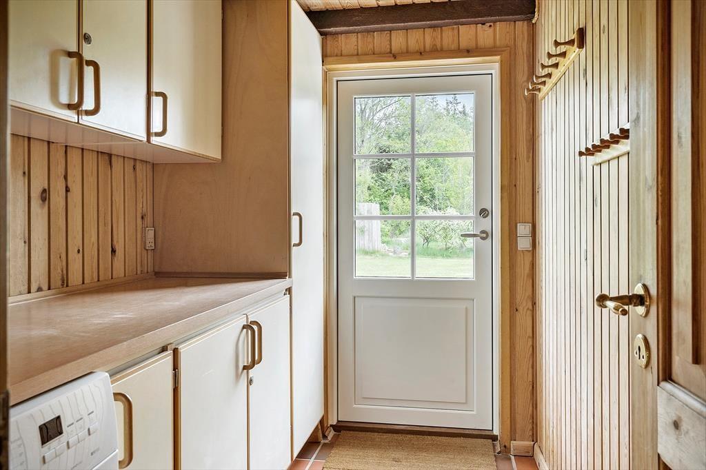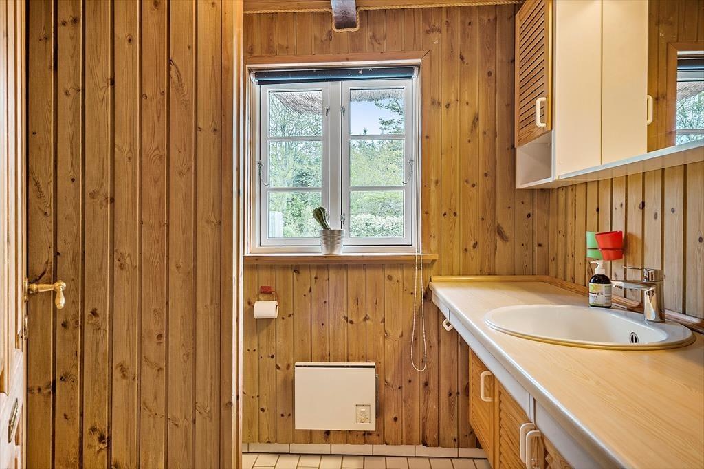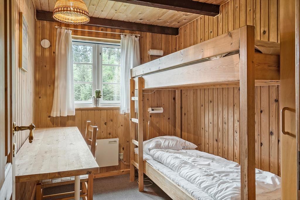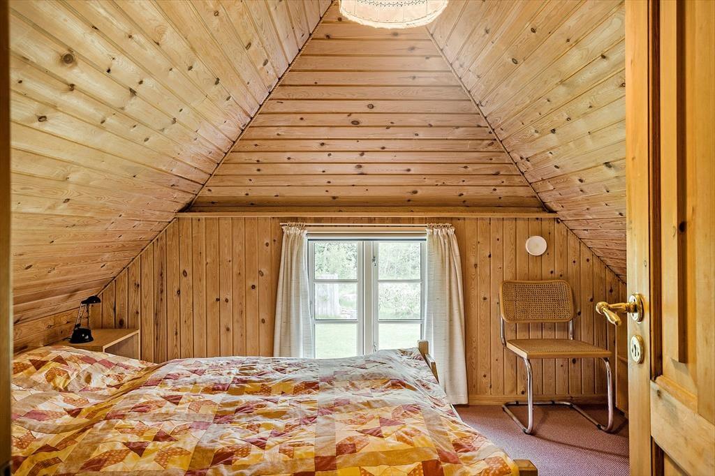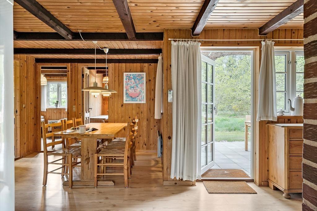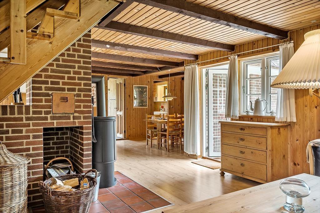 Schönes strohgedecktes Ferienhaus mit zwei Wohnzimmern. Das Haus ist gemütlich eingerichtet. Das Wohnzimmer hat eine offene Verbindung zu Esstimmer und Küche. Im Wohnzimmer können Sie sich in der kalten Jahreszeit am Kaminofen wärmen. Die Küche ist mit einer Geschirrspülmaschine, einer Mikrowelle und einem kleineren Gefrierfach ausgestattet. Im Erdgeschoss befinden sich drei Schlafzimmer, von denen eines mit einem Doppelbett, das zweite mit zwei Einzelbetten und das dritte mit einem Etagenbett eingerichtet ist. Das Badezimmer liegt ebenfalls im Erdgeschoss. Im Obergeschoss finden Sie das vierte, mit einem Doppelbett eingerichtete Schlafzimmer sowie ein zweites Wohnzimmer mit Fernseher.