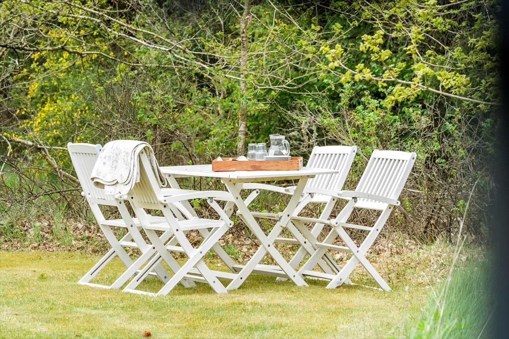 Zum Ferienhaus gehören zwei Terrassen, von denen eine nach Süden und die andere nach Osten weist. Die eine Terrasse wird von einem Windschutzzaun abgeschirmt und ist mit Gartenmöbeln ausgestattet. Das Haus liegt auf einem großen, von Bäumen und Büschen umgebenen Naturgrundstück.