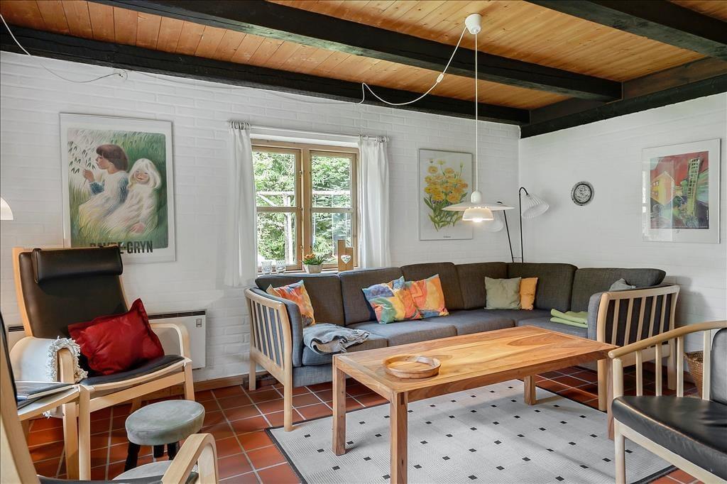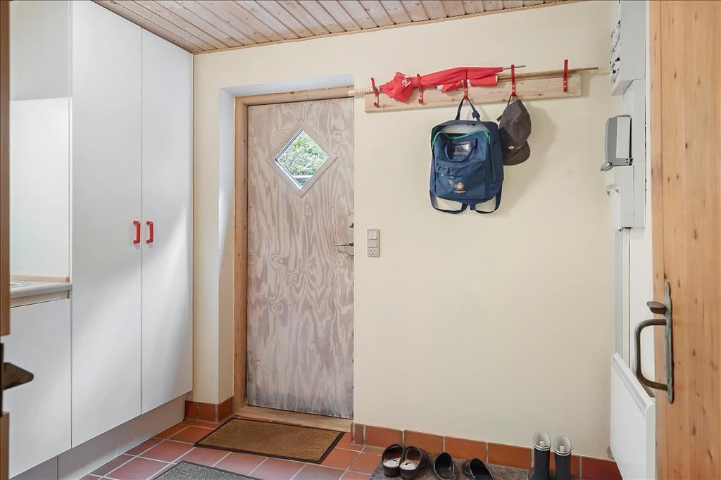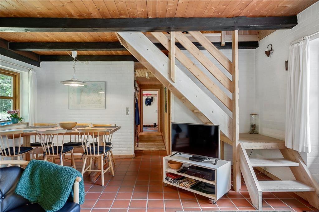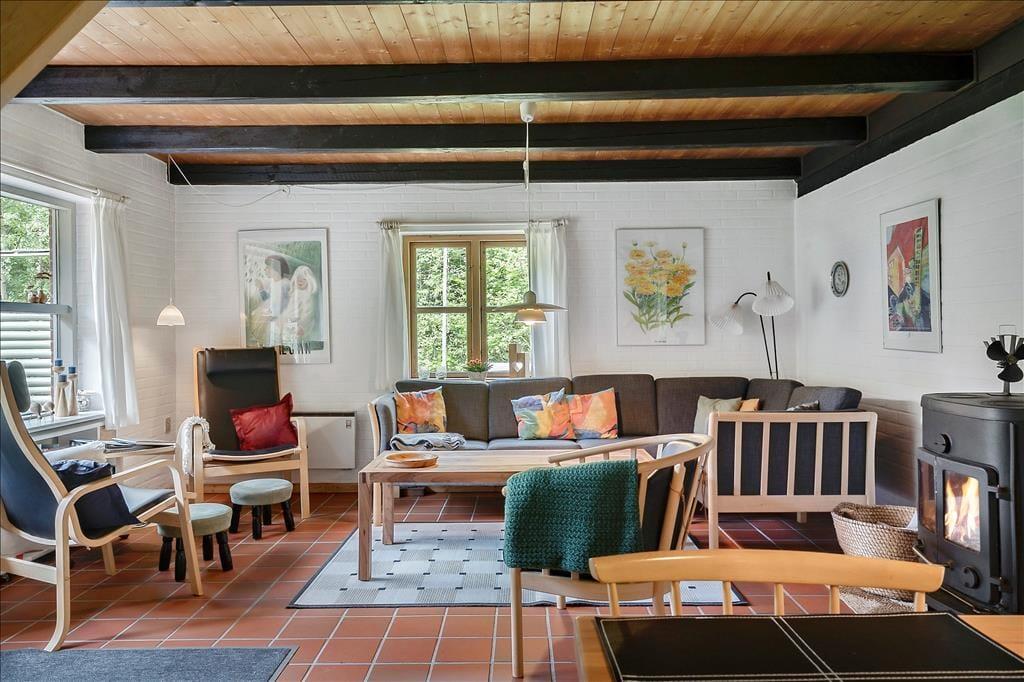 Ein schönes, helles und gemütlich eingerichtetes Ferienhaus in Vester Husby. Die Wohnfläche dieses ansprechenden Urlaubsdomizils erstreckt sich über zwei Stockwerke. Das Erdgeschoss empfängt Sie mit einem Wohnraum, in dem gute Möbel rund um den Kaminofen zu entspannten und gemütlichen Stunden einladen. Vom Wohnraum genießen Sie einen direkten Zugang auf die schöne, gen Süden gerichtete Terrasse. Außerdem ist dort die Treppe platziert, über die Sie hinauf in das obere Stockwerk gelangen, in dem Sie ein Schlafraum mit einem Doppelbett erwartet. In teilweise offener Verbindung zum Wohnraum lockt die gut ausgestattete Küche, in der Ihnen unter anderem ein Geschirrspüler und ein Herd bei der Erledigung Ihrer alltäglichen Aufgaben behilflich sind. Das Erdgeschoss beherbergt darüber hinaus drei Schlafräume mit Einzelbetten. Besondere Erwähnung verdient außerdem der wunderbar große Hauswirtschaftsbereich, der mit einer Waschmaschine und einem direkten Zugang zur teilweise geschlossenen Terrasse zu überzeugen weiß.