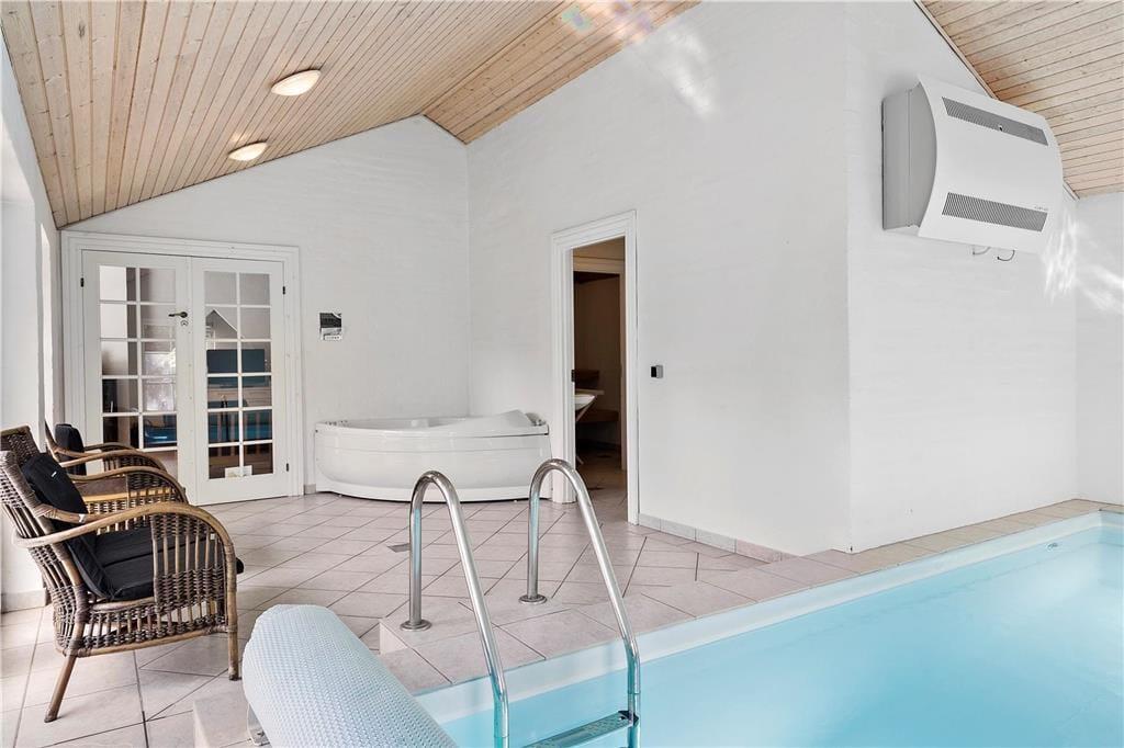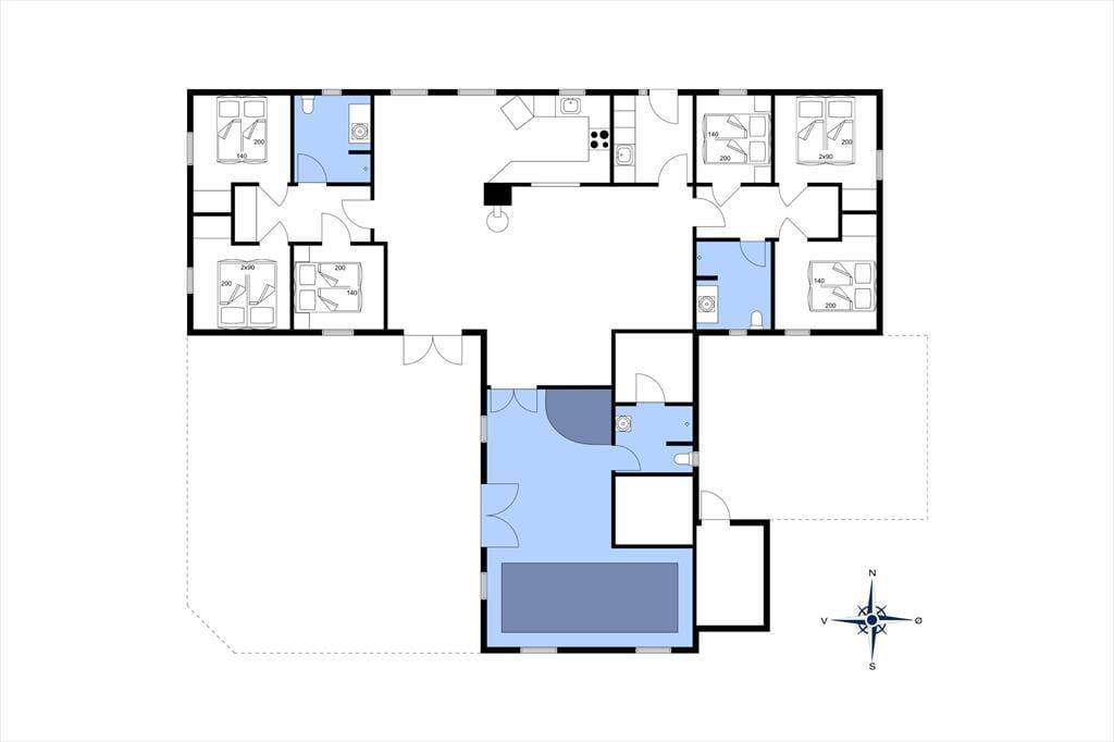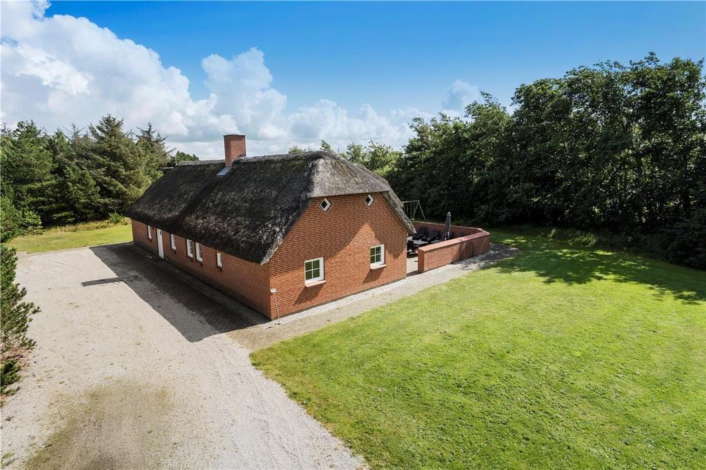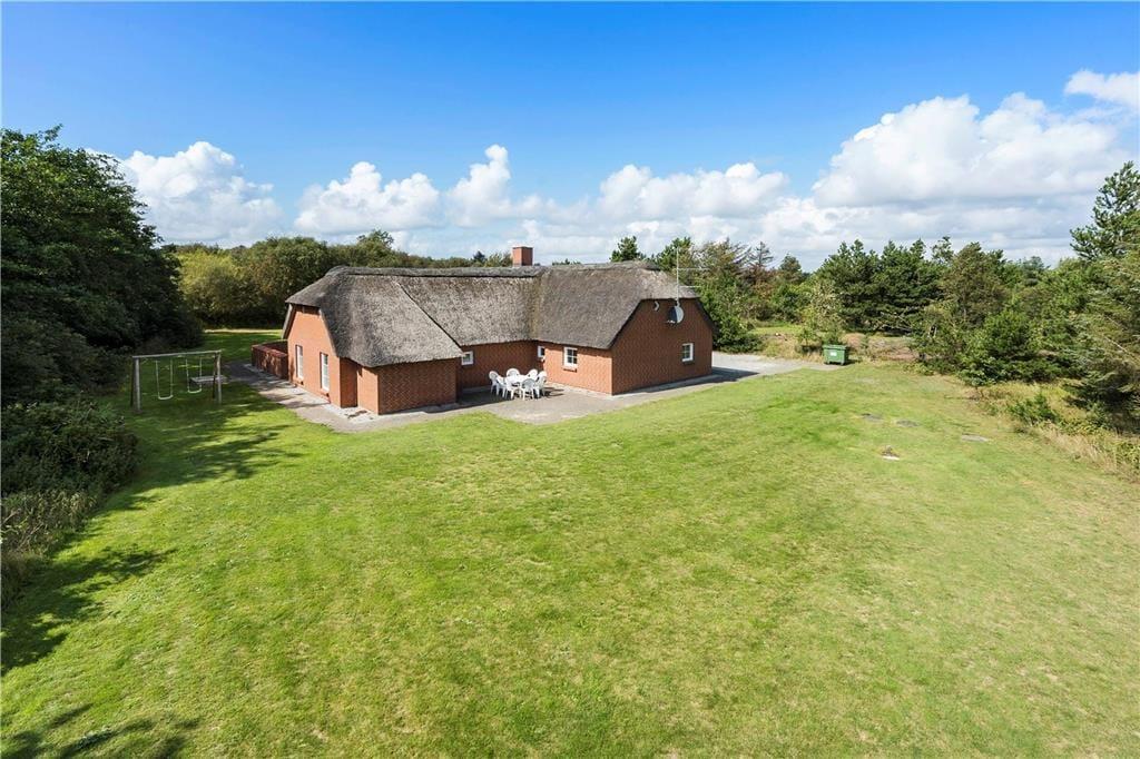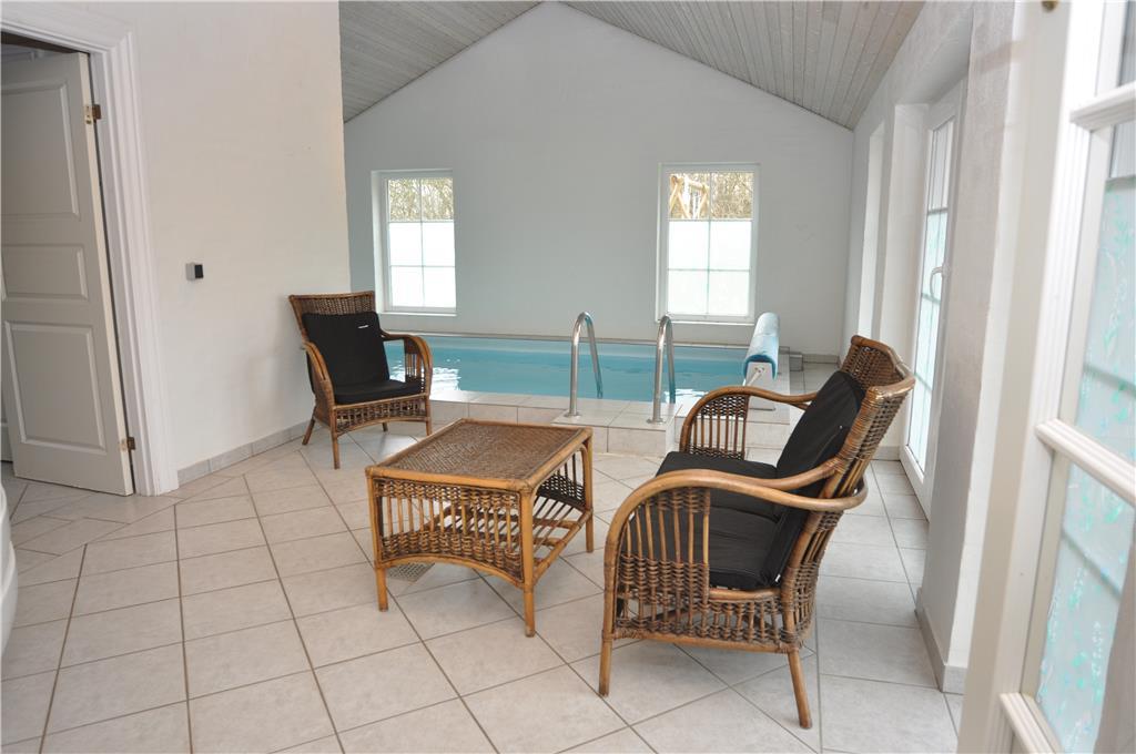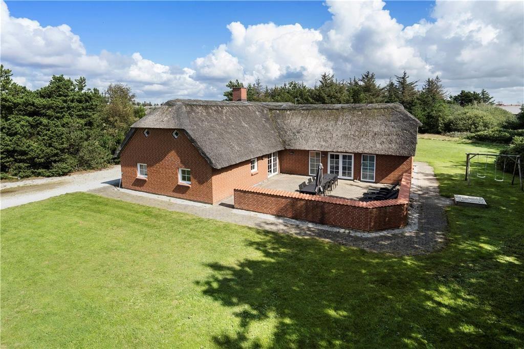 Ein schönes, großes reetgedecktes Ferienhaus mit insgesamt sechs Schlafzimmern für 12 Personen. Die Schlafzimmer sind in zwei Abschnitte unterteilt, mit Bad und Toilette in jedem Abschnitt. Alle Schlafzimmer haben Doppelbetten. Das Ferienhaus hat einen schönen kombinierten Wohn- und Essbereich und eine schöne Küche, die teilweise zum Essbereich hin offen ist. Das Haus ist hell und freundlich eingerichtet. Vom Wohnzimmer und vom Poolbereich aus hat haben Sie Zugang zu einer umzäunten und nach Südwesten ausgerichteten Terrasse mit Gartenmöbeln, Liegestühlen und einem Grill. Alle drei Bäder sind mit einer Dusche ausgestattet - und eines zusätzlicher mit einer Sauna. Der Pool ist etwa 5 x 2,5 m groß und hat eine Wassertiefe von 1,40 m. Ebenfalls verfügt dieser auch über einen Schwimmtrainer. Haustiergebühr 28 Euro.