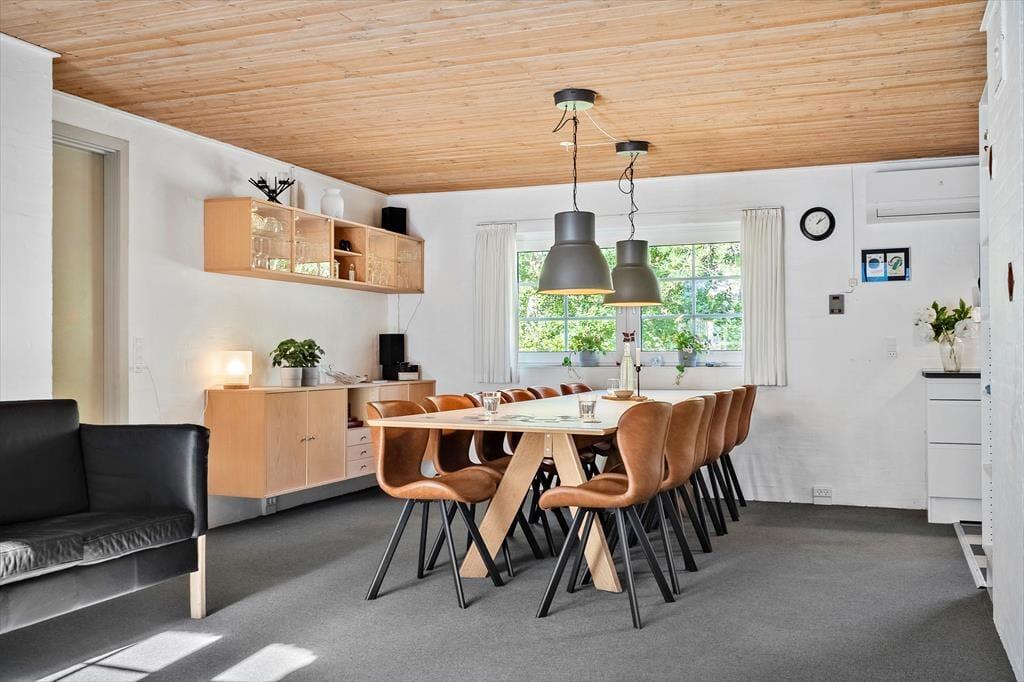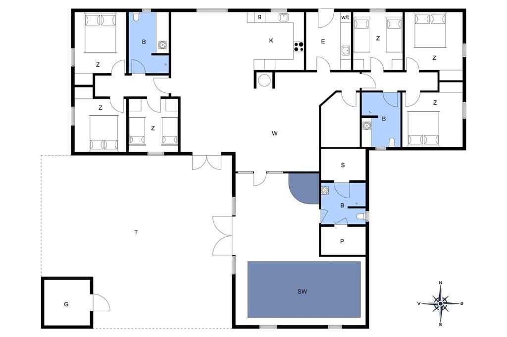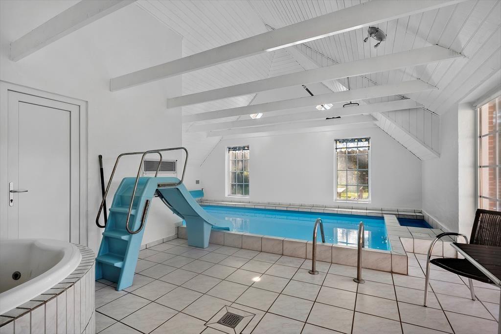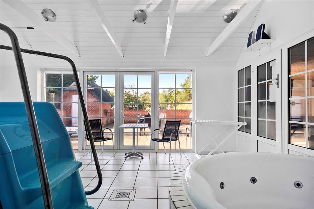 Freuen Sie sich auf dieses gut eingerichtete und schön möblierte Poolhaus mit Reetdach. Das Herzstück des Hauses bildet die zentral platzierte, offene, große Kombination aus Wohnraum und Küche. In der gut ausgestatteten, schönen und neueren Küche stehen Ihnen unter anderem eine Mikrowelle und ein Geschirrspüler hilfreich zur Seite. Neben der Küche ist der Essplatz eingerichtet, an dem alle Mitreisenden Platz finden. Der Wohnraum lädt mit seiner großen Sofagruppe, dem behaglich knisternden Kaminofen und dem Fernseher mit einigen dänischen Sendern und deutschen Parabolkanälen zu wunderbar gemütlichen Stunden im Kreise Ihrer Lieben ein. Vom Wohnraum aus genießen Sie direkten Zugang zum Poolbereich, wo Sie neben einem Swimmingpool auch eine Sauna und ein Whirlpool erwarten. Der Pool verfügt über eine Wassertiefe von 133 Zentimetern und ist mit einer Wasserrutsche und einer Gegenstromanlage ausgestattet. Zur Poolabteilung gehört auch ein Badezimmer mit einer Dusche, einem WC und einem Zugang zur Sauna. Die Schlafräume sind auf zwei unterschiedliche Abteilungen verteilt, die jeweils an einem Ende des Hauses platziert sind. Vier Schlafräume begrüßen Sie mit je einem höhenverstellbaren Doppelbett. Zwei Schlafräume sind mit je zwei Einzelbetten ausgestattet. Insgesamt bietet dieses herrliche Ferienhaus also Platz für bis zu 12 übernachtende Urlauber. Glasfaser-Internet ist im Haus vorhanden. Der Hauswirtschaftsbereich beinhaltet praktischerweise eine Waschmaschine und einen Wäschetrockner. Haustiergebühr 28 Euro pro Hund.