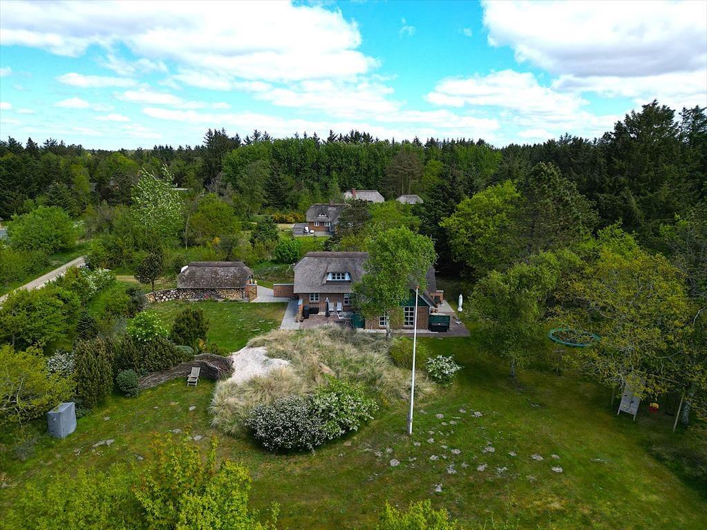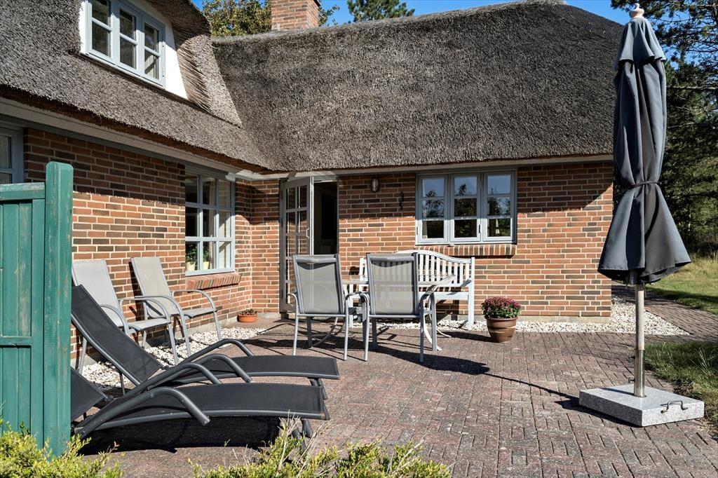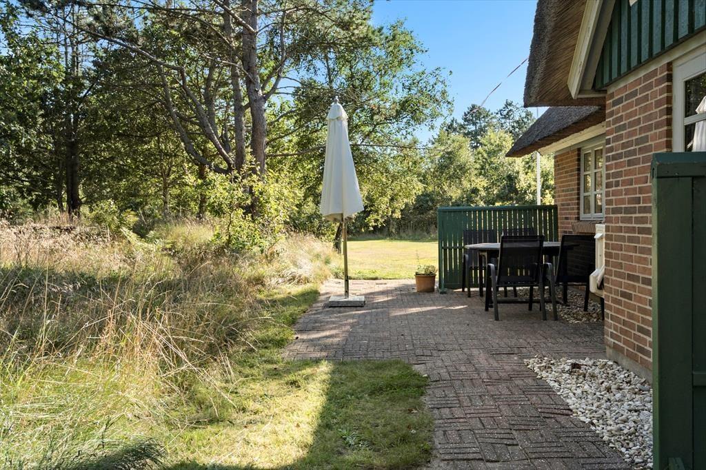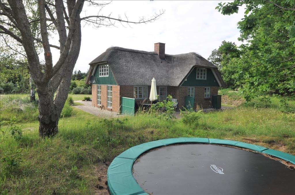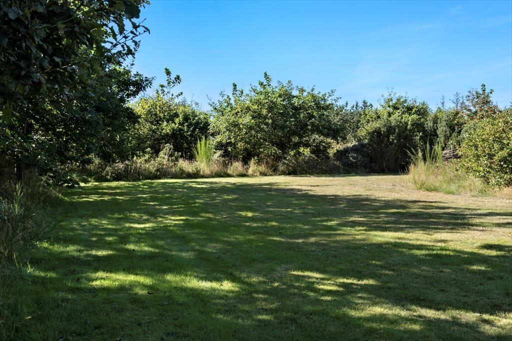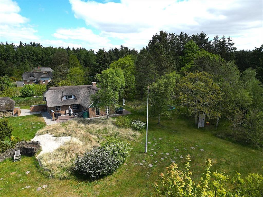 Das Ferienhaus befindet sich auf einem 5.000 m² großen, gepflegten Naturgrundstück in ruhiger Umgebung. Auf dem Grundstück gibt es mehrere lauschige Ecken und eine kleine Sanddüne nicht weit von der Terrasse entfernt, die nach Südwesten ausgerichtet ist und Schutz bietet. Zusätzlich ist eine weitere Terrasse nach Osten ausgerichtet. Die Terrassen sind mit Gartenmöbeln, Liegestühlen und einem Grill ausgestattet. Für Kinder gibt es eine Schaukel und einen Sandkasten sowie viel Platz zum Spielen auf dem Rasen. Parkplätze sind direkt am Ferienhaus vorhanden.