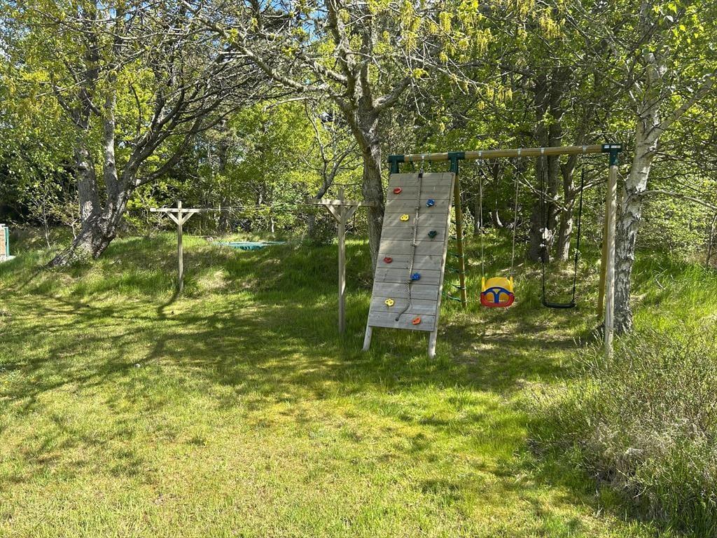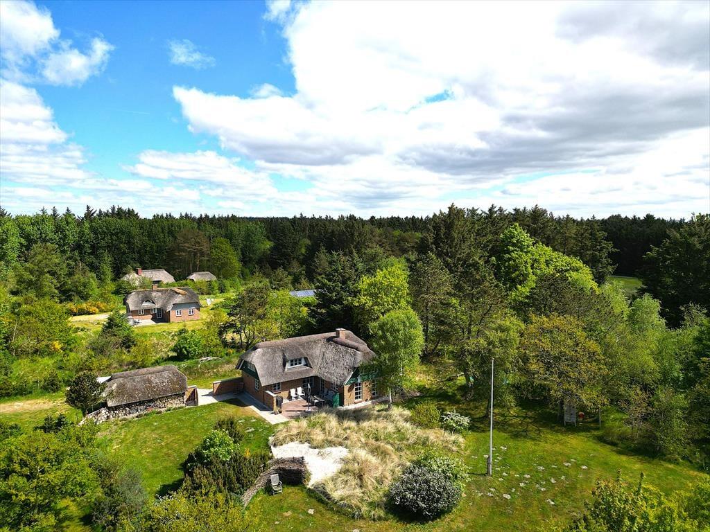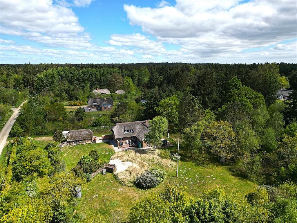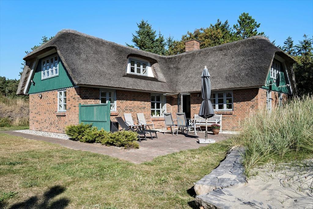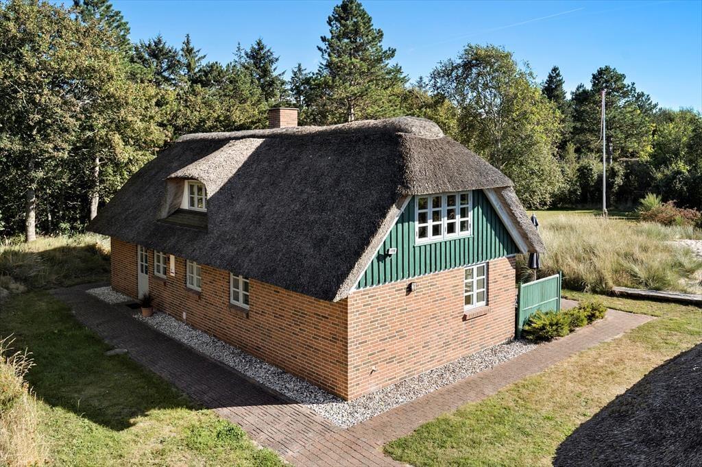 Das Ferienhaus befindet sich auf einem 5.000 m² großen, gepflegten Naturgrundstück in ruhiger Umgebung. Auf dem Grundstück gibt es mehrere lauschige Ecken und eine kleine Sanddüne nicht weit von der Terrasse entfernt, die nach Südwesten ausgerichtet ist und Schutz bietet. Zusätzlich ist eine weitere Terrasse nach Osten ausgerichtet. Die Terrassen sind mit Gartenmöbeln, Liegestühlen und einem Grill ausgestattet. Für Kinder gibt es eine Schaukel und einen Sandkasten sowie viel Platz zum Spielen auf dem Rasen. Parkplätze sind direkt am Ferienhaus vorhanden.