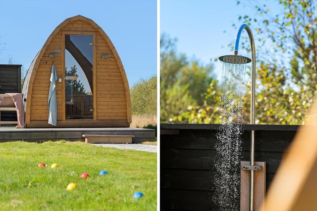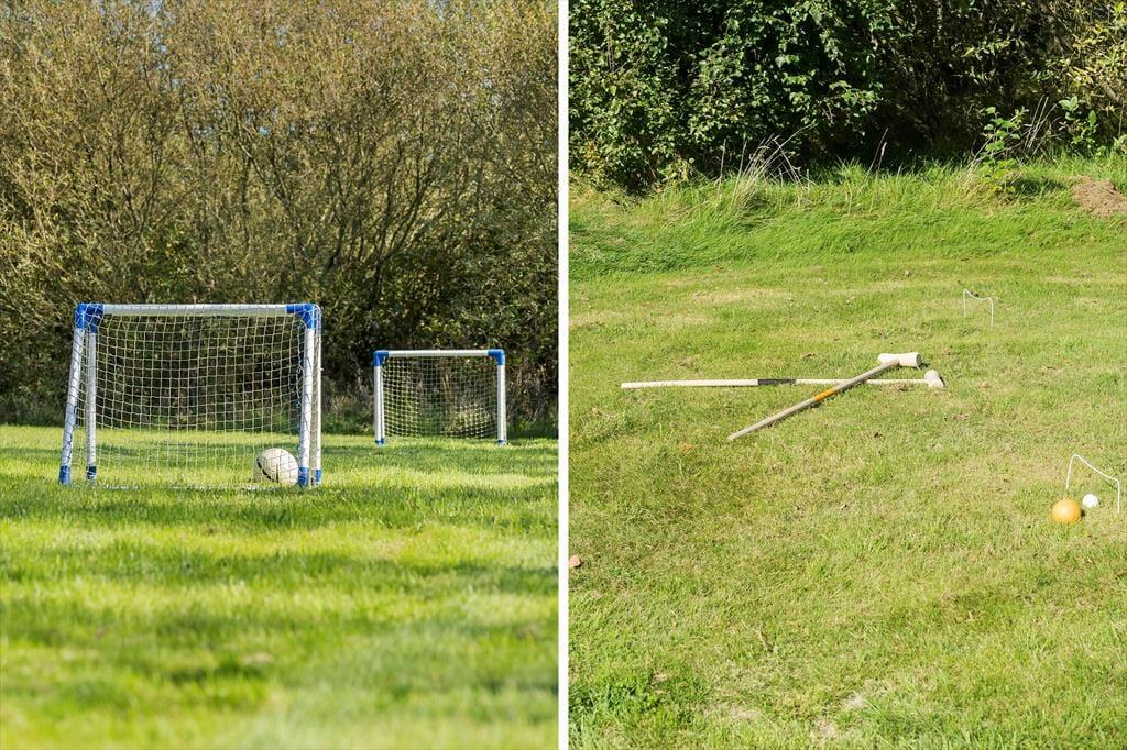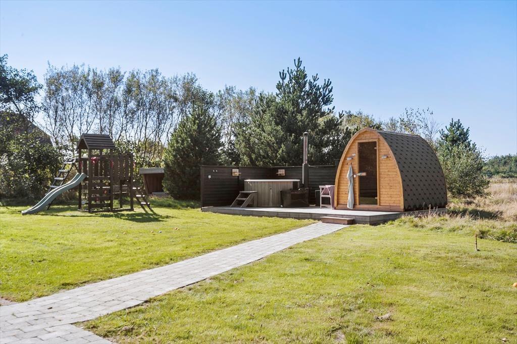 Ein Teil des großen, schönen Grundstücks mit einer Grundfläche von 3.500 m² ist mit einer Grasfläche versehen. Der Rest des Grundstücks ist naturbelassen. Die Grundstücksränder sind mit Büschen und Bäumen bepflanzt, die dem Haus guten Windschutz spenden. Vom Wohnraum treten Sie hinaus auf eine schöne, gepflasterte Terrasse mit guten Gartenmöbeln. Auf dieser Terrasse können Sie viele erholsame Stunden und gesellige Runden verleben. Auf dem wunderschönen Grundstück gibt es ein Shelter, eine Feuerstelle und einen Spielplatz sowie eine größere Holzterrasse mit Wildnisbad, Außendusche und köstlicher Außensauna. Parkplätze stehen am Haus zur Verfügung.