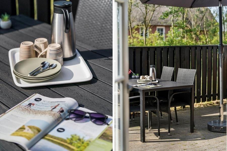 Schönes Reetdachferienhaus für 8 Personen und 2 Hunde. Das Haus ist hell, freundlich und geschmackvoll eingerichtet mit einer ansprechenden und komfortablen Möblierung. Der gemütliche Wohnraum ist offen mit der Küche kombiniert, sodass Zubereitung der Mahlzeiten und gemütliches Beisammensein gut kombinieren lassen. Vom Wohnzimmer aus gelangen Sie auf die Terrasse.