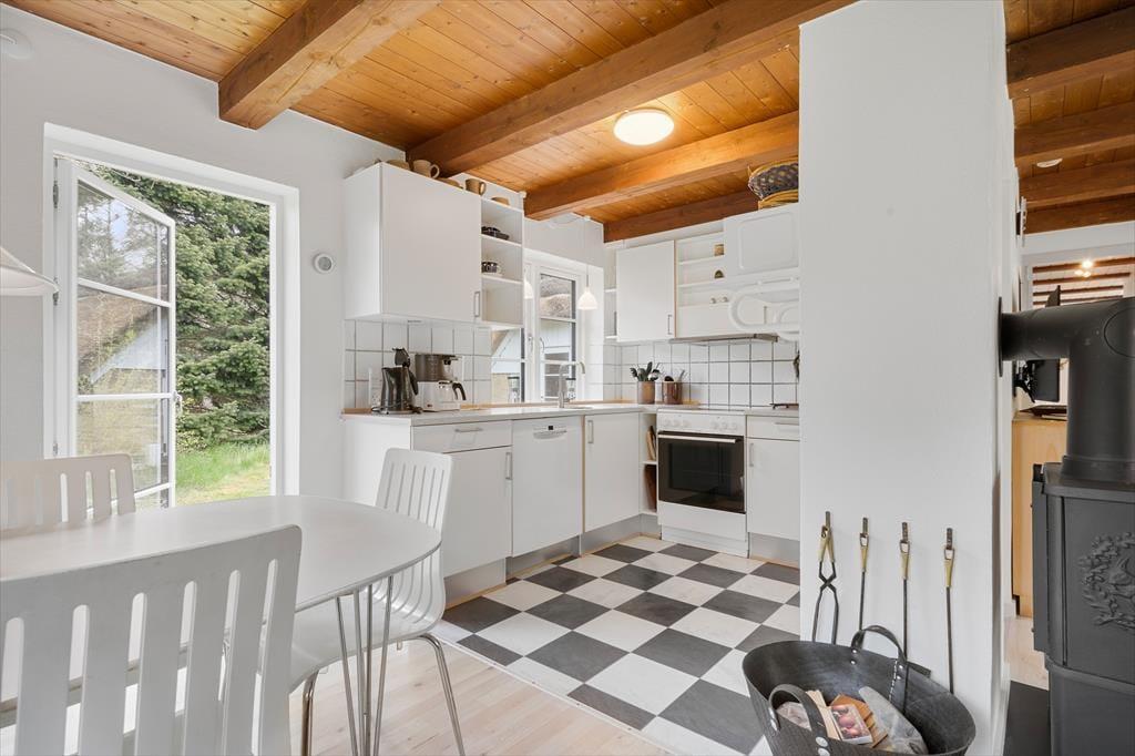 Dieses gemütliche Ferienhaus begrüßt Sie mit einer guten und komfortablen Polstersitzgruppe vor dem Kaminofen, der mit seinem Feuer und seiner Wärme zum behaglichen Ambiente beiträgt. Die gut ausgestattete Küche, die unter anderem über einen Geschirrspüler und eine Mikrowelle verfügt, ist offen mit dem Wohn- und Essbereich verbunden. Hier gibt es einen Lautsprecher mit Anschlussmöglichkeit an ein iPhone. Vom Wohnraum aus gelangen Sie hinaus auf eine schöne Holz-Terrasse nach süden und eine Terrasse nach Westen. Ein schönes und neurenoviertes Badezimmer mit einem Badewanne, einer Fußbodenheizung und einer Dusche. Im ersten Stockwerk erwarten Sie eine Extra Toilette und zwei Schlafzimmer, von denen die beide mit einem Doppelbett eingerichtet sind. Beide Schlafzimmer sind mit Teppichboden ausgelegt. Das Erdgeschoss beherbergt zwei Schlafräume mit jeweils zwei Schlafplätzen und Holzfußboden. In dieses Ferienhaus dürfen Sie Ihren Hund mitbringen. Die Sauna befindet sich im großen Nebengebäude, von dem Sie auch einen Blick in den Garten haben.