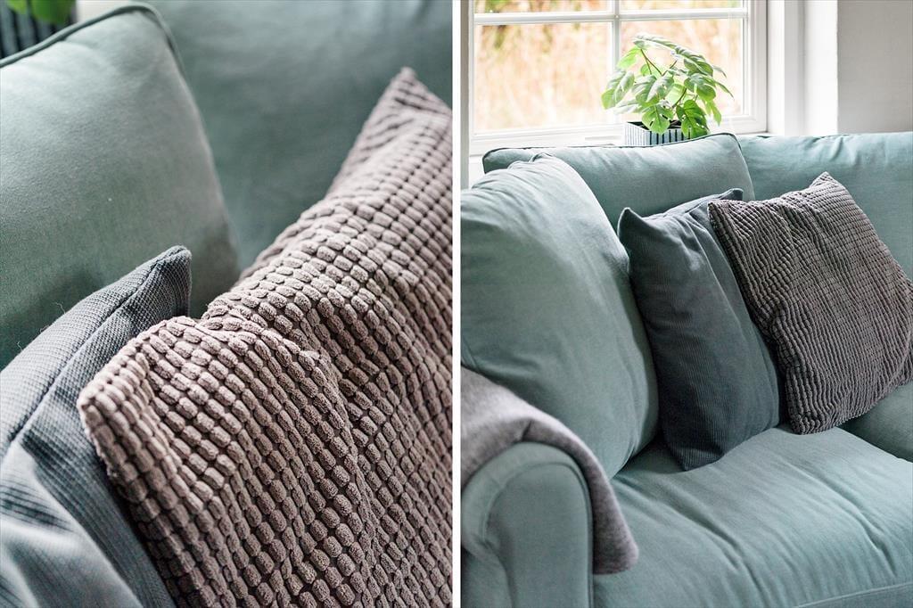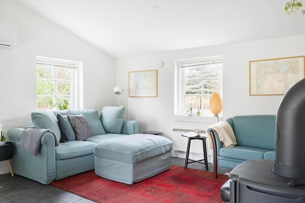 Dieses Ferienhaus besticht durch durchdachte Details und eine Atmosphäre voller Ruhe und Charme. Das Wohnzimmer öffnet sich zum Küchen- und Essbereich und schafft so einen harmonischen Rahmen für geselliges Beisammensein – auch wenn nicht alle gleichzeitig dasselbe tun. Hier ist Raum für gemütliche Gespräche, Lachen und Nähe. Die hellblauen Sofas laden zum Entspannen vor dem Kamin ein, dessen knisternde Flammen eine angenehme Stimmung erzeugen. Holen Sie Ihre Strickarbeit oder ein gutes Buch hervor und lassen Sie die Zeit ein wenig stillstehen. Die großen Fensterflächen sorgen für ein herrliches Lichtspiel und tauchen den Raum in ein schönes Licht, das mit dem Sonnenlauf über den Himmel wandert.