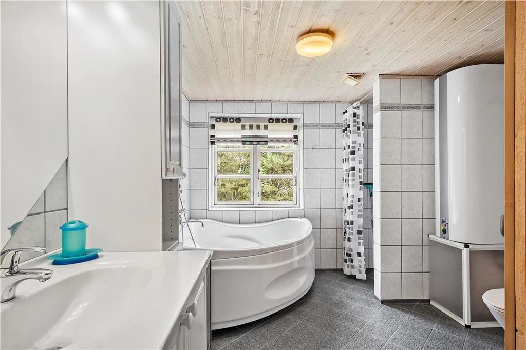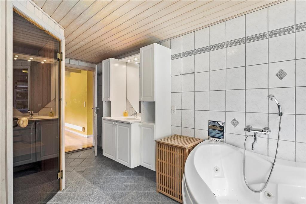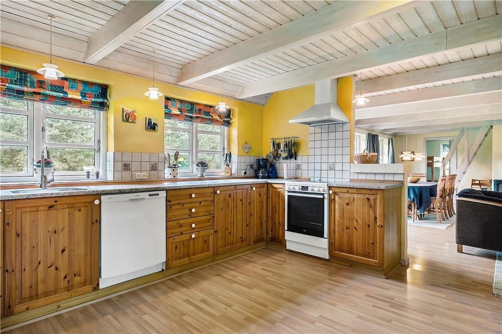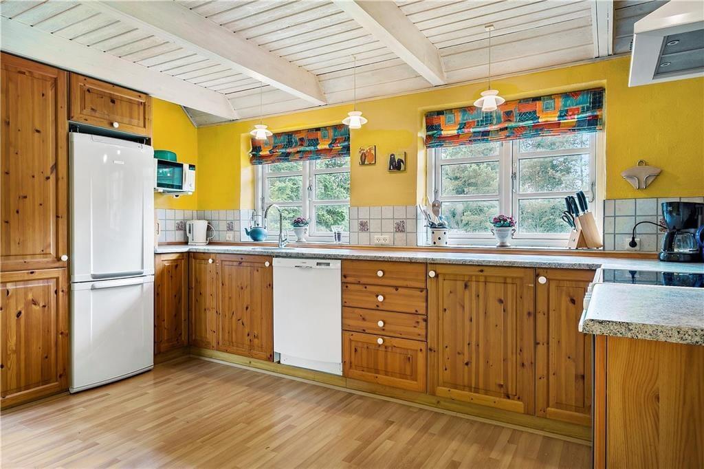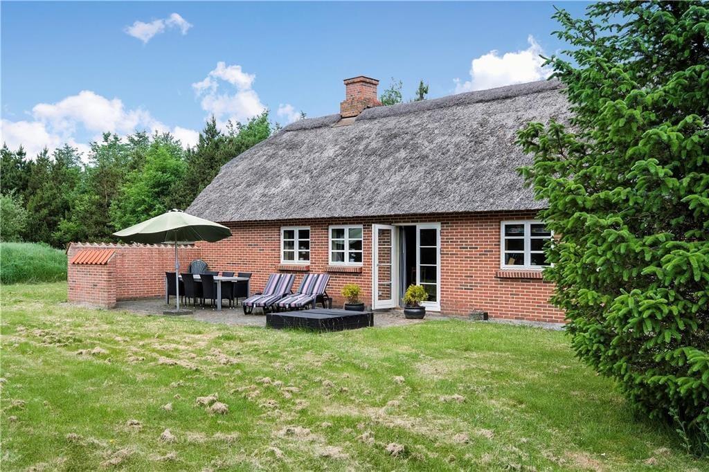 Willkommen in diesem schönen, reetgedeckten und solide gemauerten Ferienhaus! Das gepflegte Urlaubsdomizil begrüßt Sie mit einer gemütlichen Einrichtung, die durch unverputzte Wände, offene Deckenbalken und gute, ansprechende Möbelstücke geprägt wird. In der schönen, großen und gut ausgestatteten Küche wird die Zubereitung der Mahlzeiten Dank eines Geschirrspülers, eines Kühlschranks und einer Gefriermöglichkeit zum reinsten Vergnügen. Das große, attraktive Badezimmer verwöhnt unter anderem mit einer Sauna und einem Whirlpool und umfasst praktischerweise auch eine Waschmaschine und einen Wäschetrockner. Ein zusätzliches Badezimmer mit einer Dusche ist ebenfalls vorhanden. Der gemütlich eingerichtete Aufenthaltsraum lockt mit gemütlichen Sitzgelegenheiten und einem romantisch knisternden Kaminofen. Von hier aus genießen Sie zudem direkten Zugang zur nach Süden ausgerichteten Terrasse. Die Schlafplätze verteilen sich auf drei gute Schlafzimmer, die allesamt über Schrankfläche verfügen.