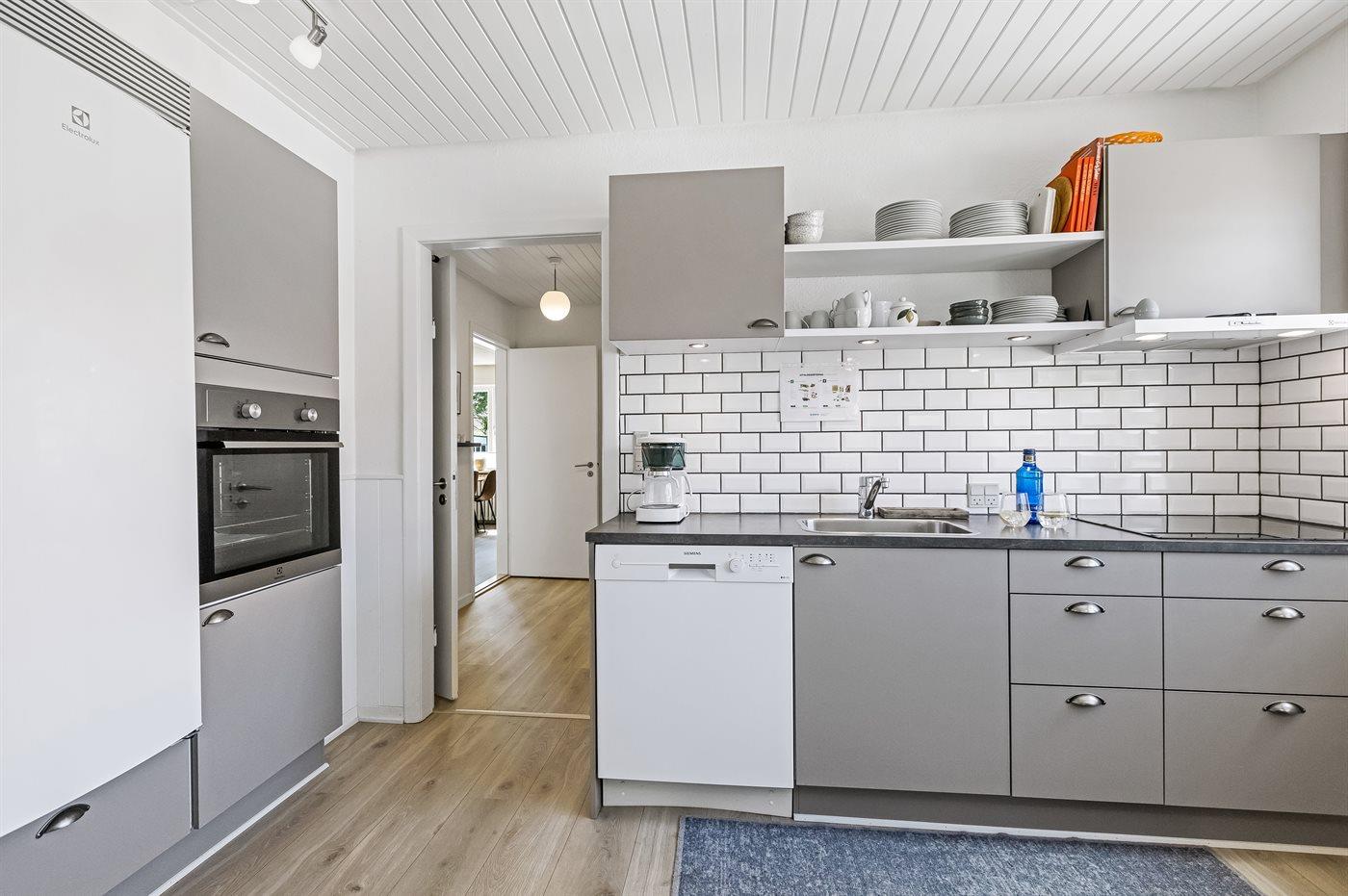 Die Küche ist mit Kühlschrank ausgestattet. Außerdem gibt es 4 Keramik-Kochfelder, Umluftofen, Mikrowelle sowie Geschirrspüler.