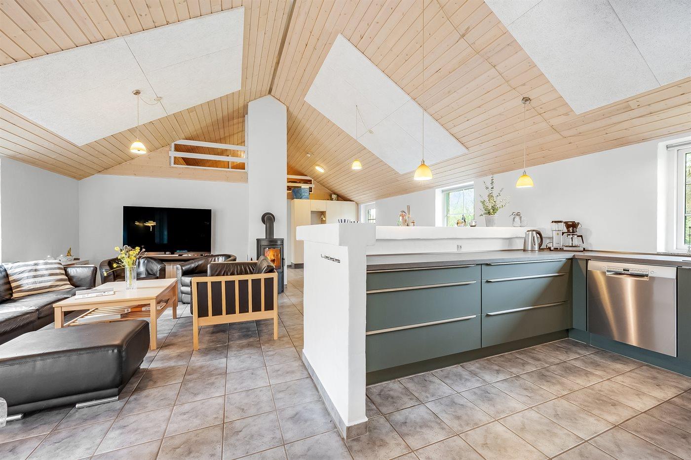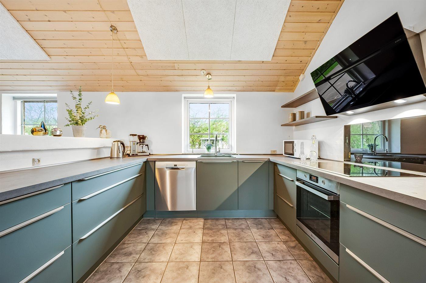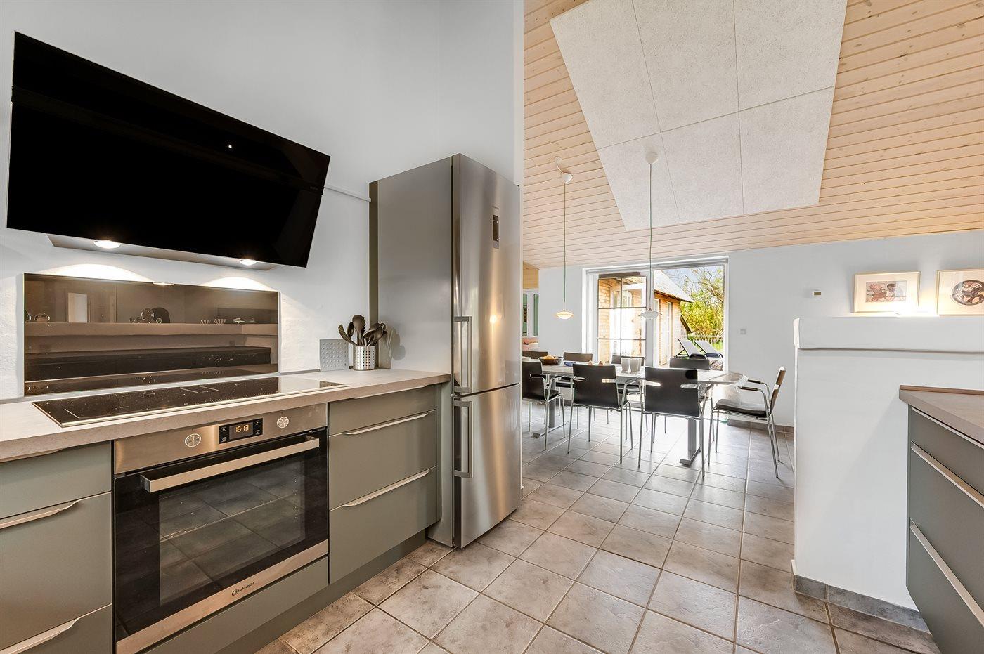 Die Küche ist mit Kühlschrank ausgestattet. Außerdem gibt es 4 Induktions-Kochzonen, Umluftofen, Mikrowelle sowie Geschirrspüler.