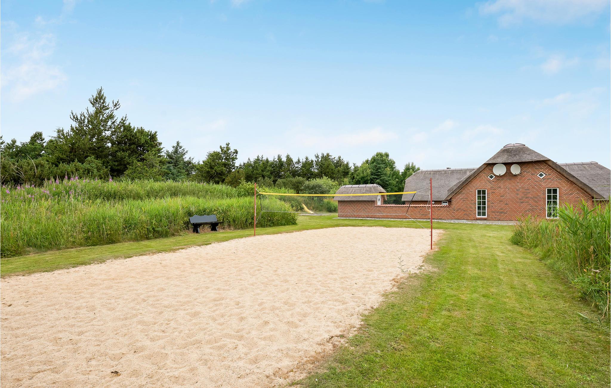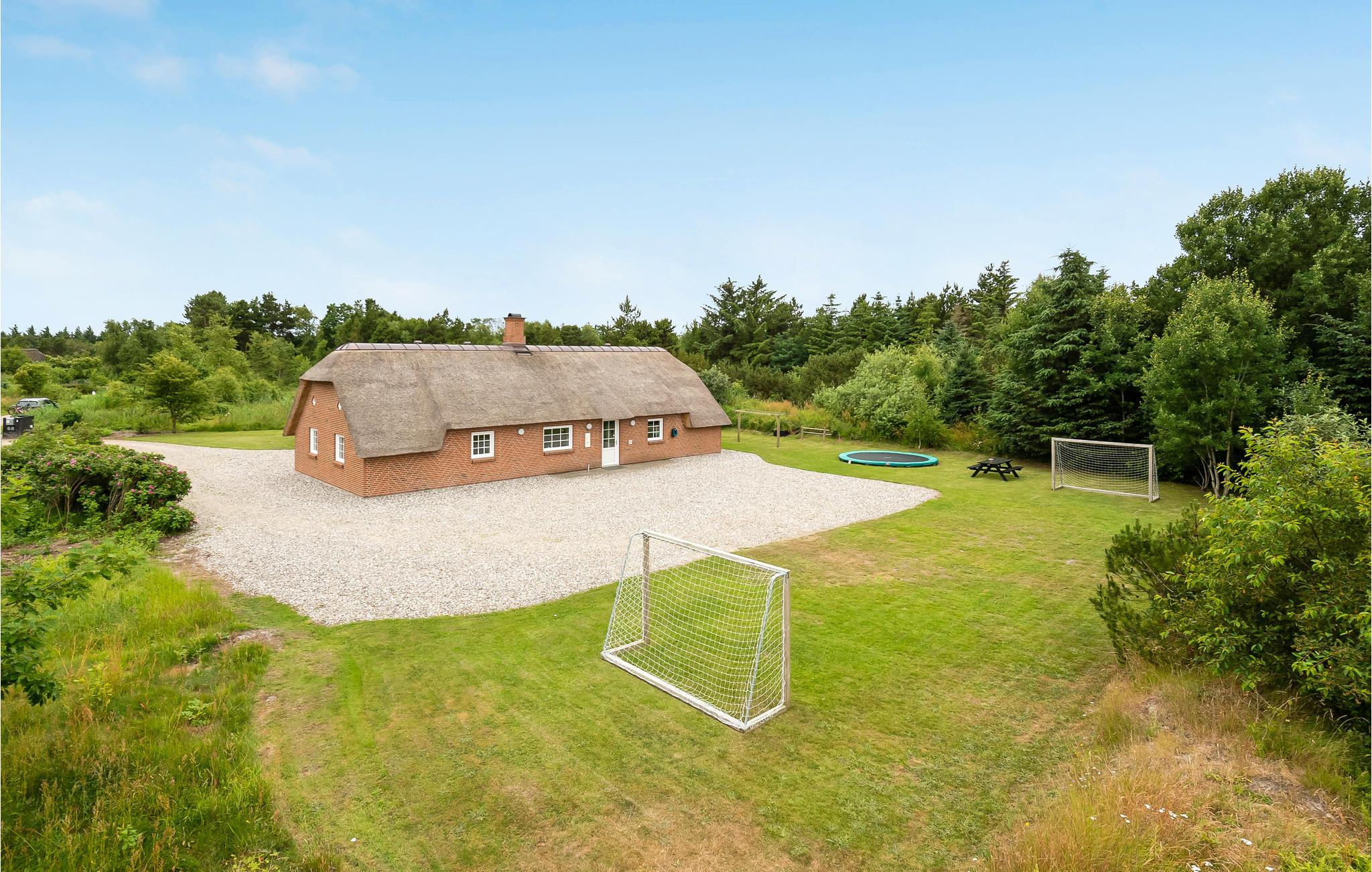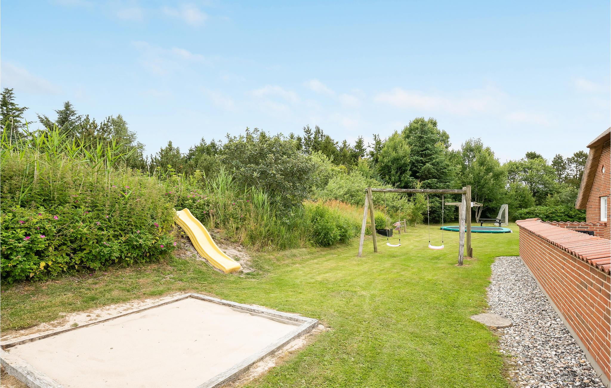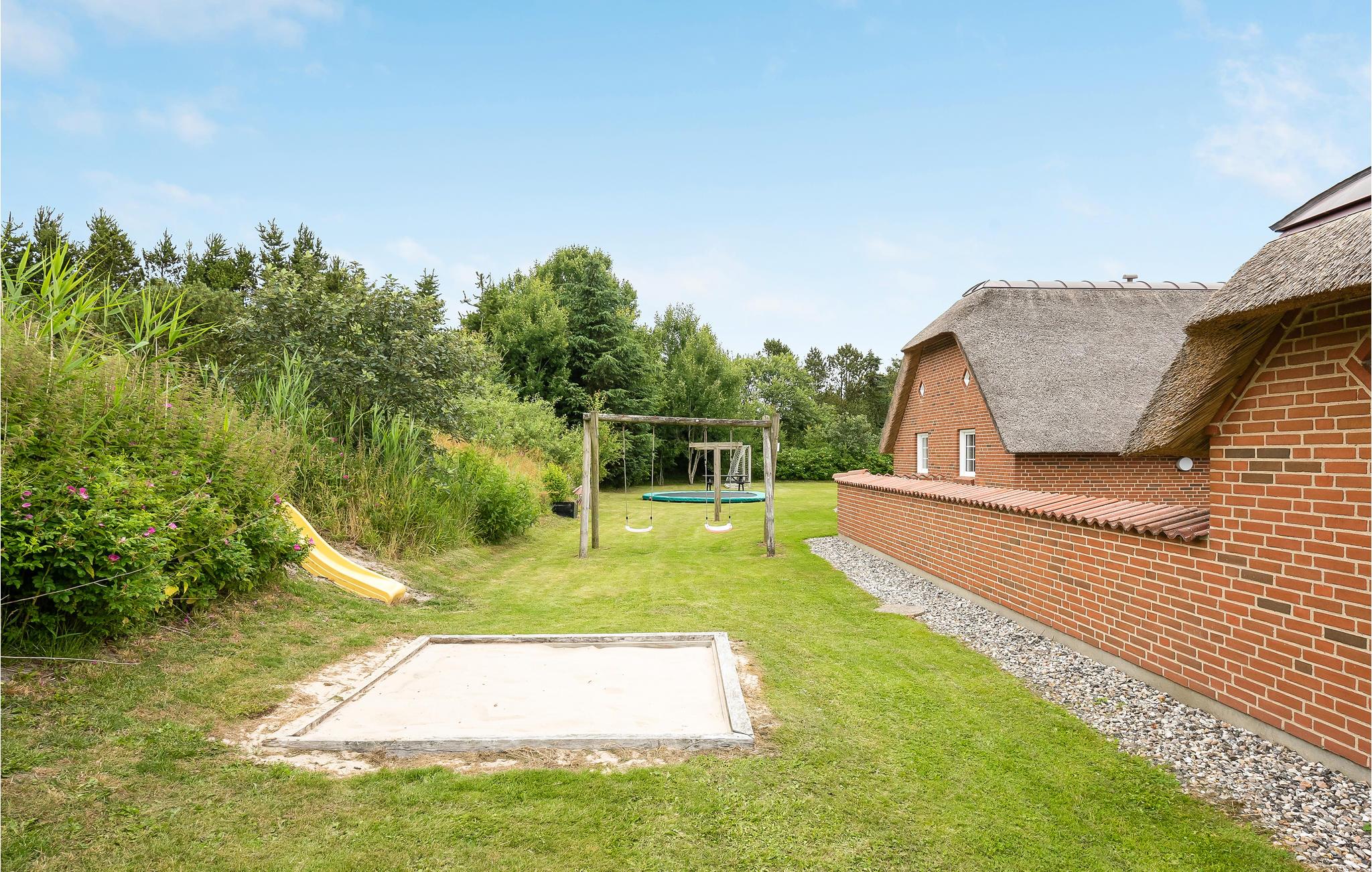 Dieses einladende und gepflegte Ferienhaus liegt in der ruhigen Ferienhaussiedlung Bækby, zwischen Husby und Vedersø Klit. Das Haus ist ausgestattet mit einer zum Wohnzimmer hin offenen und hellen Küche, dieser Raume bildet das Zentrum des Hauses. Zu seinen beiden Seiten liegt jeweils drei Schlafzimmer und ein Badezimmer. Im Wellnessbereich gibt es einen Pool mit Rutsche, Whirlpool, Sauna und ein Badezimmer. Die Umgebung des Hauses beherbergt auf vielen Kilometern Wander- und Radwege. Im Wald Husby Plantage gibt es auch behindertengerechte Wanderwege. Im artenreichen Wald gibt es auch 90 Jahre alte Nadelbäume. Der Hund der Familie freut sich sicher schon auf den Husby Hundewald, der nicht weit vom Haus liegt. Im Gebiet gibt es auch kleine Häfen, wo die Lokalbevölkerung ihre Boote liegen hat. Eine originale Urlaubsatmosphäre erleben Sie in Søndervig, in dieser Stadt können Sie auch in Fachgeschäften einkaufen und Freizeitsportangebote finden (Minigolf, Hallenbad, Sandskulpturen am Strand). Machen Sie auch einen Ausflug nach Thorsminde, das schön auf der Landzunge zwischen Meer und Fjord liegt. Der Hafen hat ein schönes Flair und von der Mole können Sie angeln. Hier liegt auch das Strandgutmuseum St. Georges. Wenn Sie abends zum Ferienhaus zurückkehren, können Sie auf der Terrasse die letzten Sonnenstrahlen genießen und sich hinterher vor dem knisternden Kaminofen versammeln.