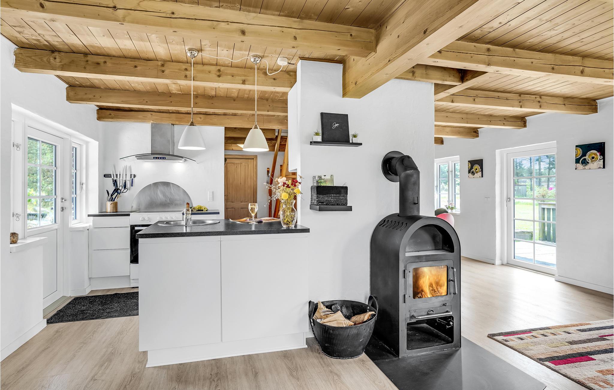 Im geschmackvollen Wohnzimmer mit eingebautem Holzofen und großen Fenstern ist viel Platz für Gemütlichkeit und Entspannung.