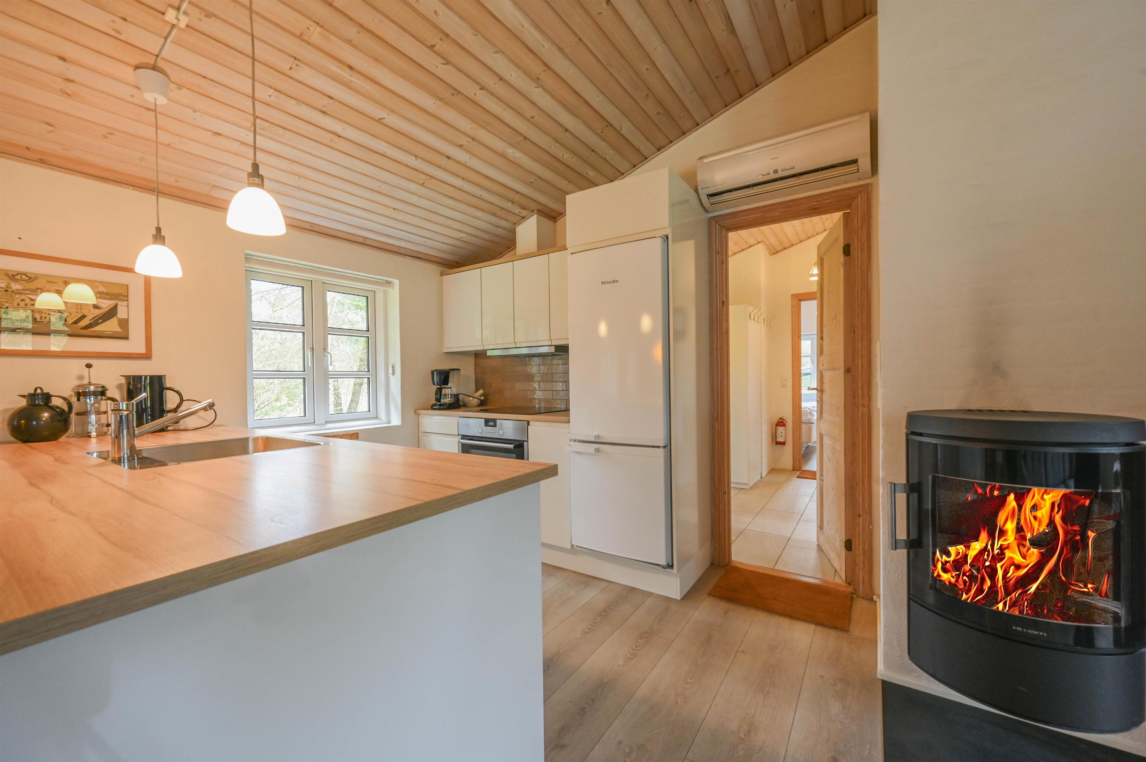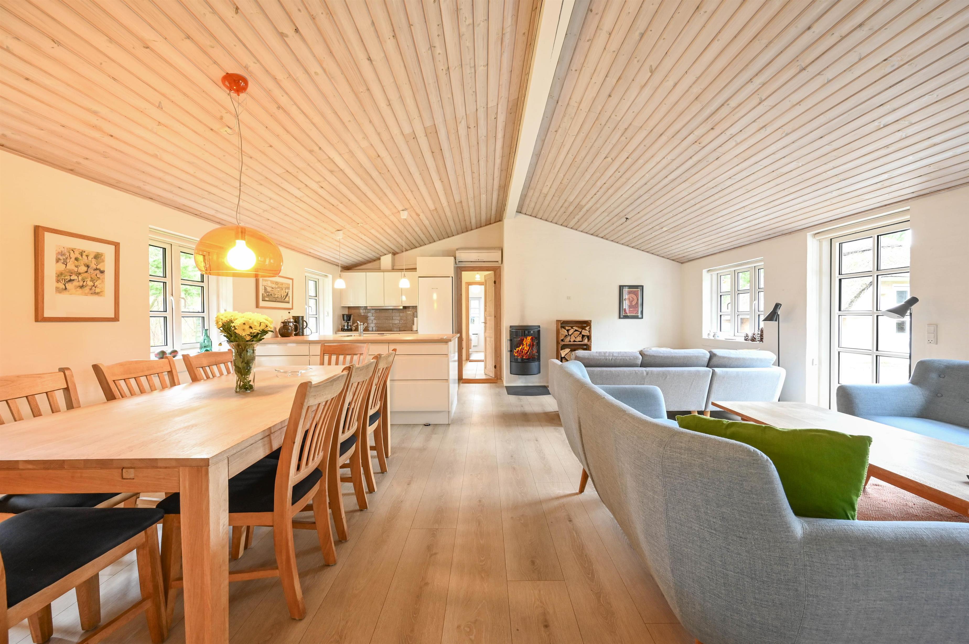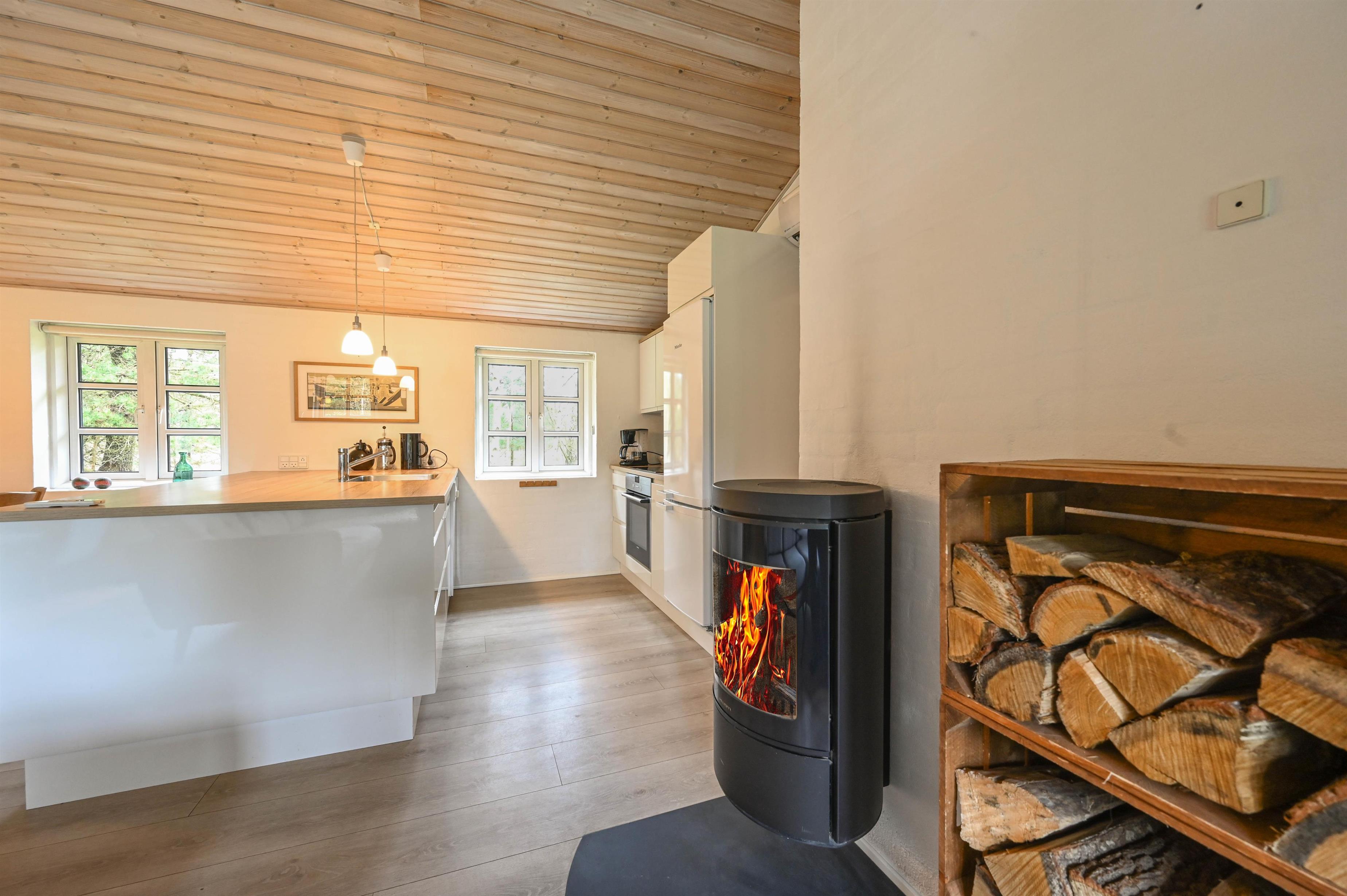 Im Zentrum des Hauses befindet sich der helle, offene Wohn- und Küchenbereich mit einer wandmontierten, energieeffizienten Kaminofen, einer zentral platzierten Wärmepumpe und leichten, modernen Möbeln. Von hier aus gelangst du auf die sonnige Südterrasse, die zum Entspannen und Genießen einlädt.