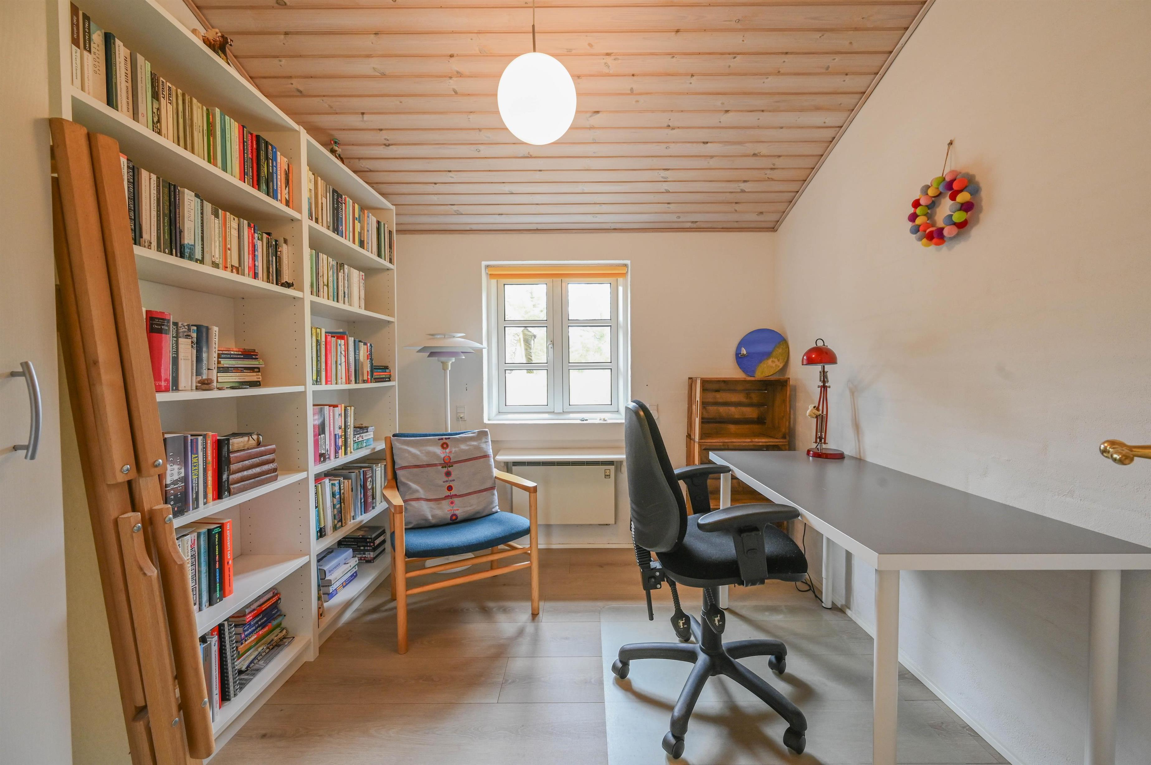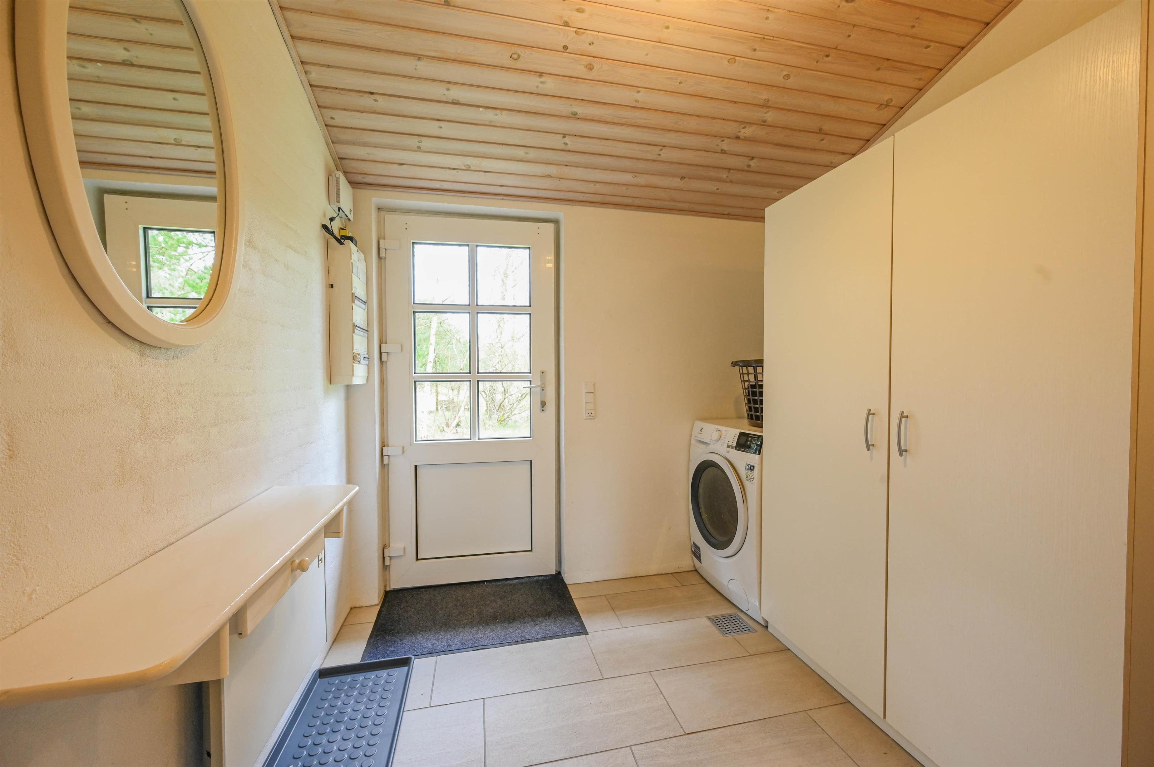 Im östlichen Teil des Hauses findest du einen Eingangsbereich mit Waschmaschine und Trockner, ein Schlafzimmer mit Doppelbett, ein Büro mit Schreibtisch sowie ein großes Badezimmer mit Dusche und Sauna.