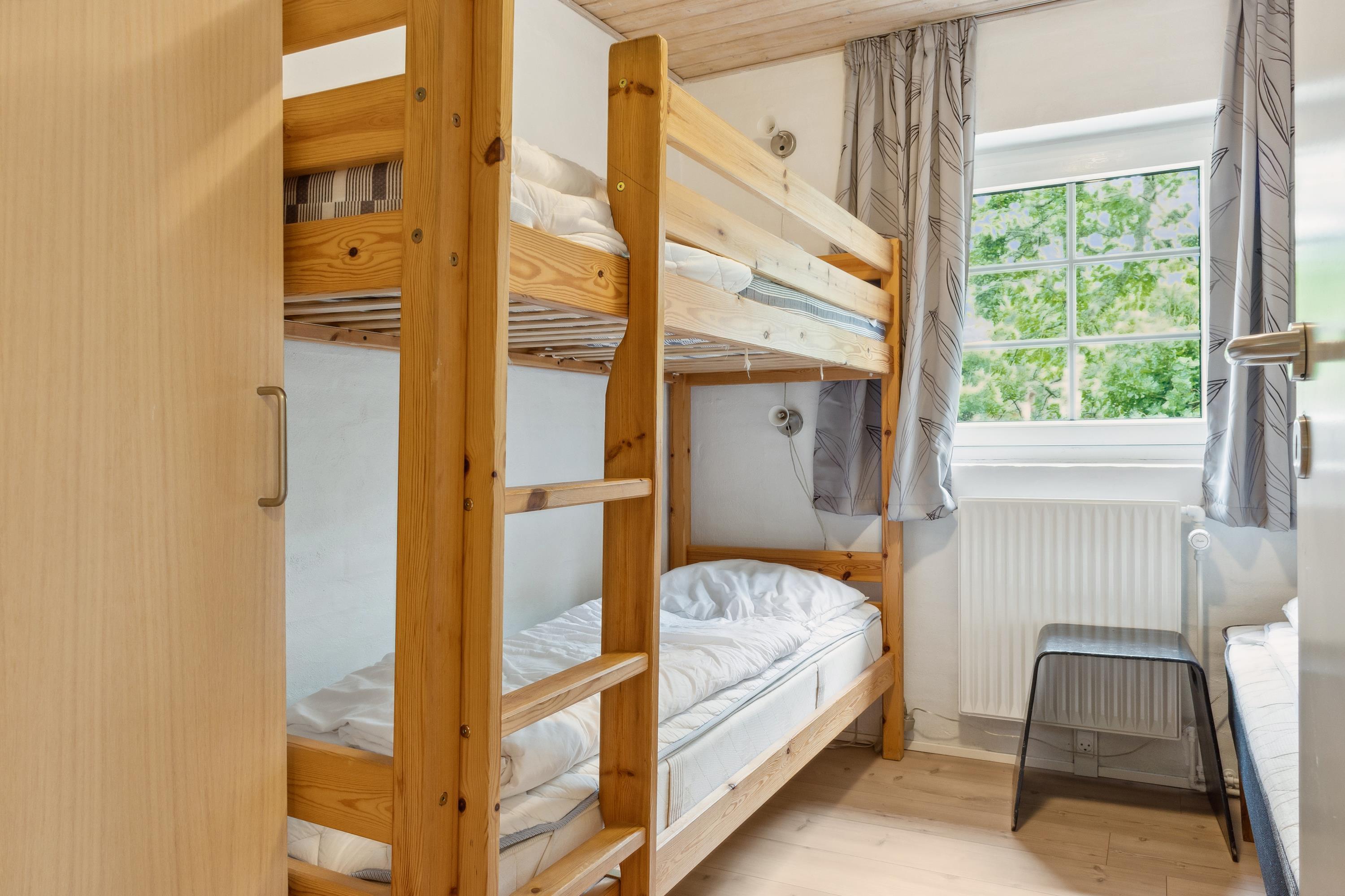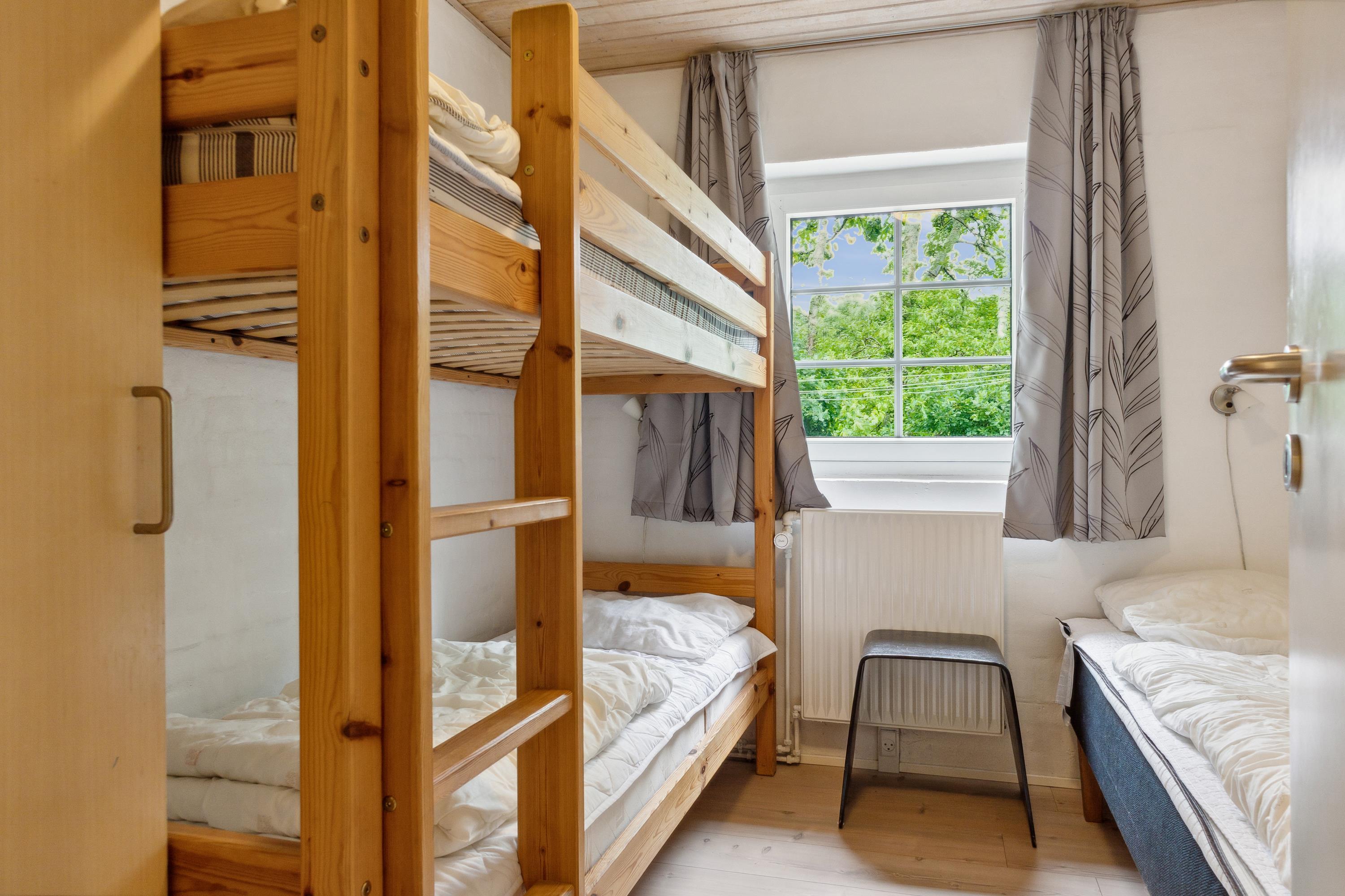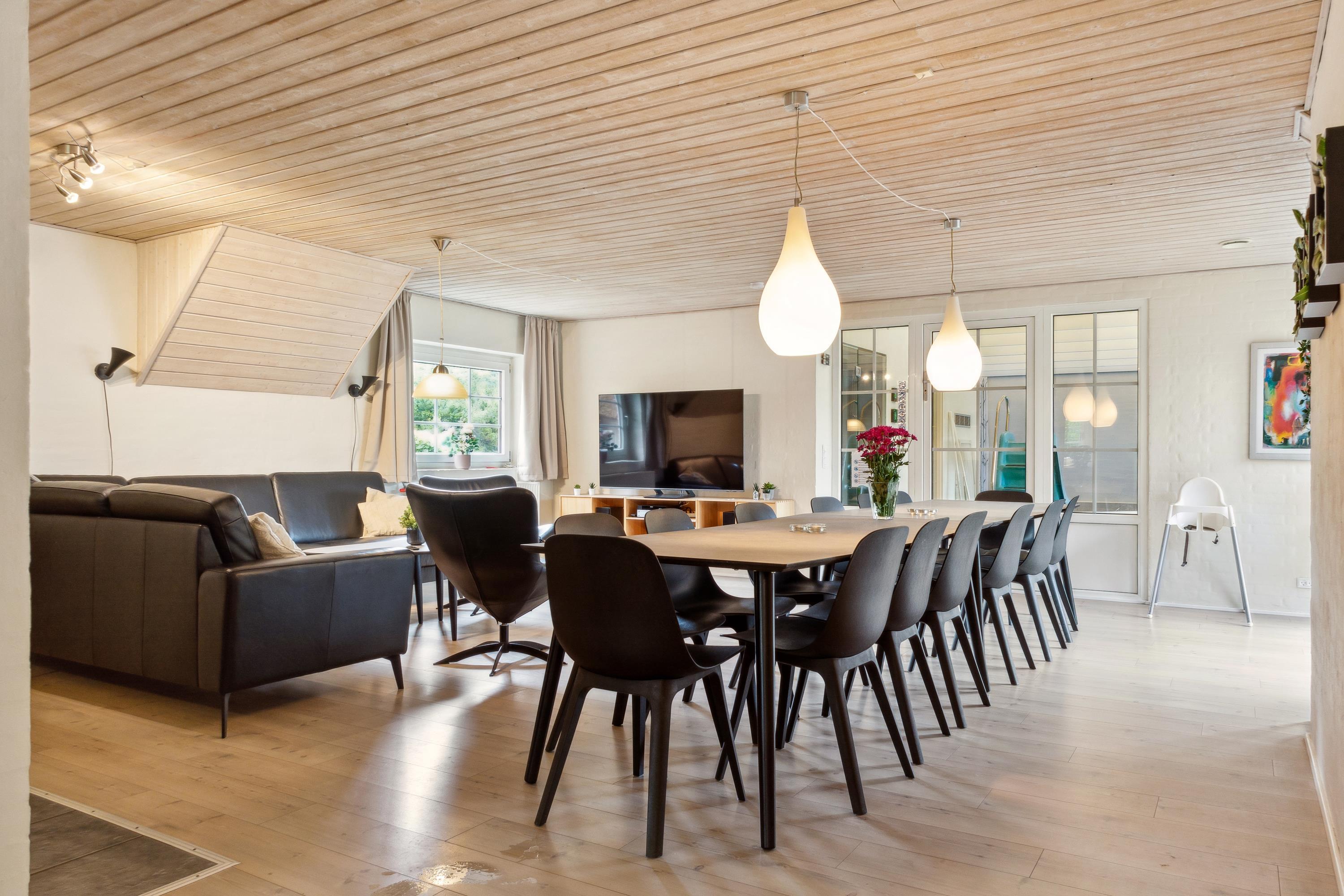 Das Haus ist perfekt für zwei große Familien geeignet, weil es zwei getrennte Flügel mit eigenen Schlafbereichen hat. Jeder Abschnitt hat drei Zimmer, zwei mit je einem Doppelbett und eines mit einem Etagenbett plus Einzelbett. In allen Zimmern habt ihr viel Stauraum und Schrankplatz. In beiden Abteilungen gibt es schön renovierte Bäder mit Duschen und Fußbodenheizung. Das Herz des Hauses ist das Wohnzimmer. Mit dem großen Esstisch, einem guten Kaminofen und einer schönen Sofagruppe mit Fernseher ist viel Platz und Hygge für alle. Es gibt auch einen direkten Zugang zur gut ausgestatteten, offenen Küche und zur Terrasse. Im großzügig geschnittenen Eingangsflur habt ihr viel Platz für Jacken, Sportzeug und Schuhe und im kleinen Hauswirtschaftsraum findet ihr Waschmaschine und Trockner.