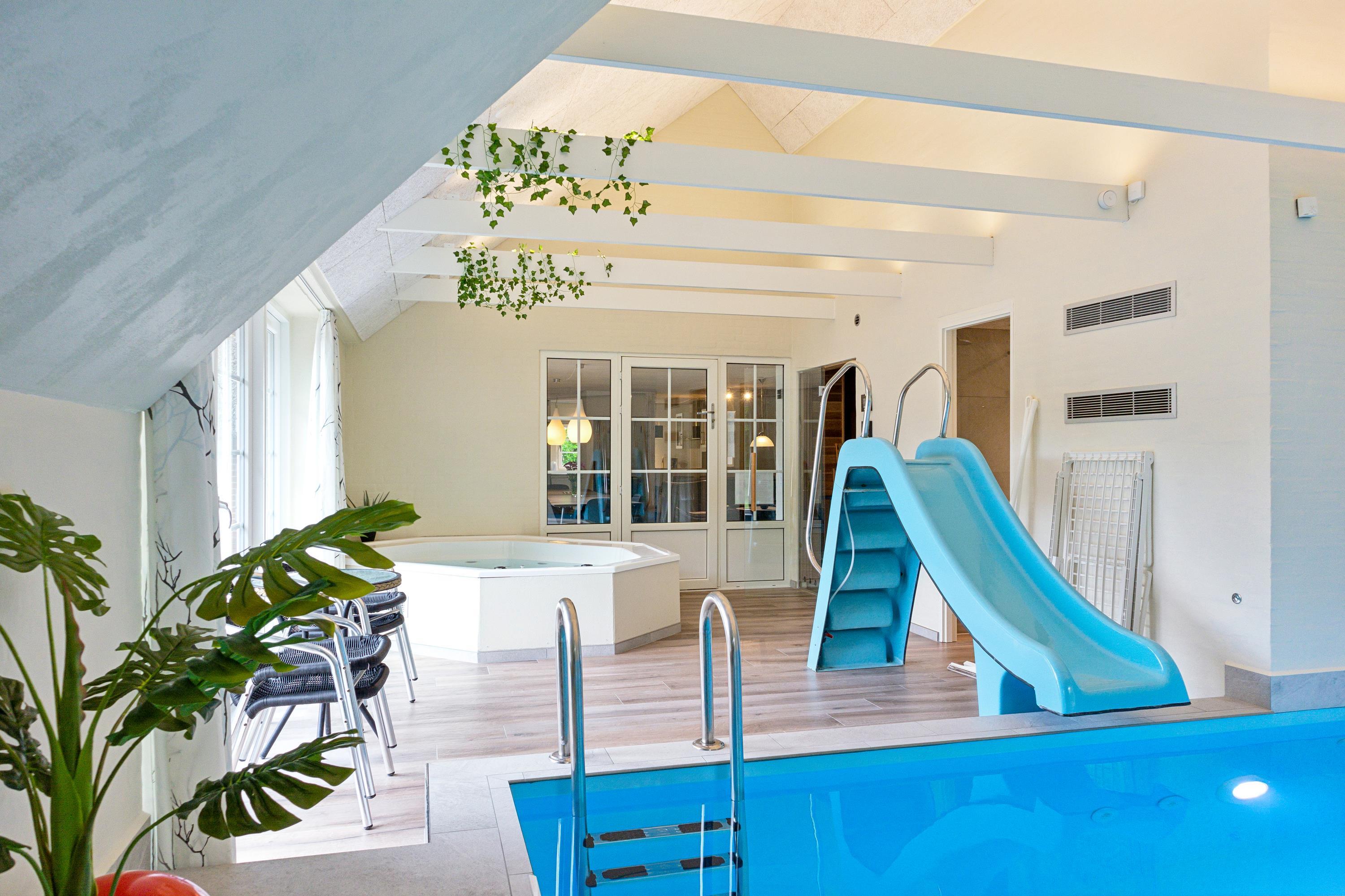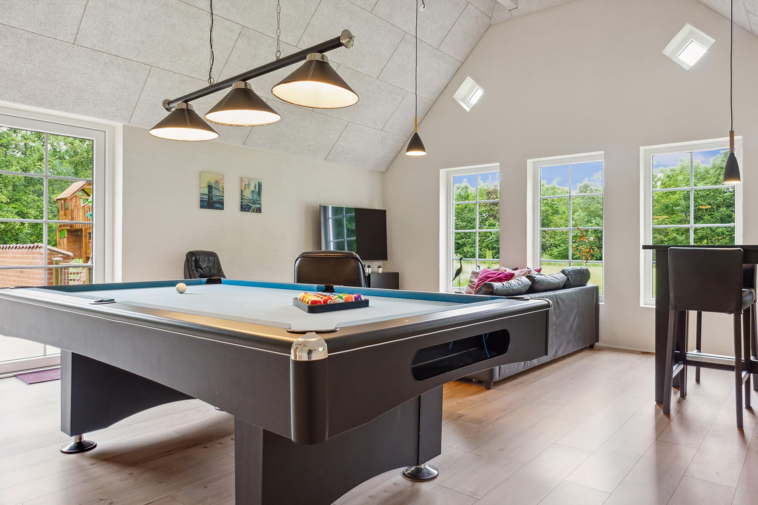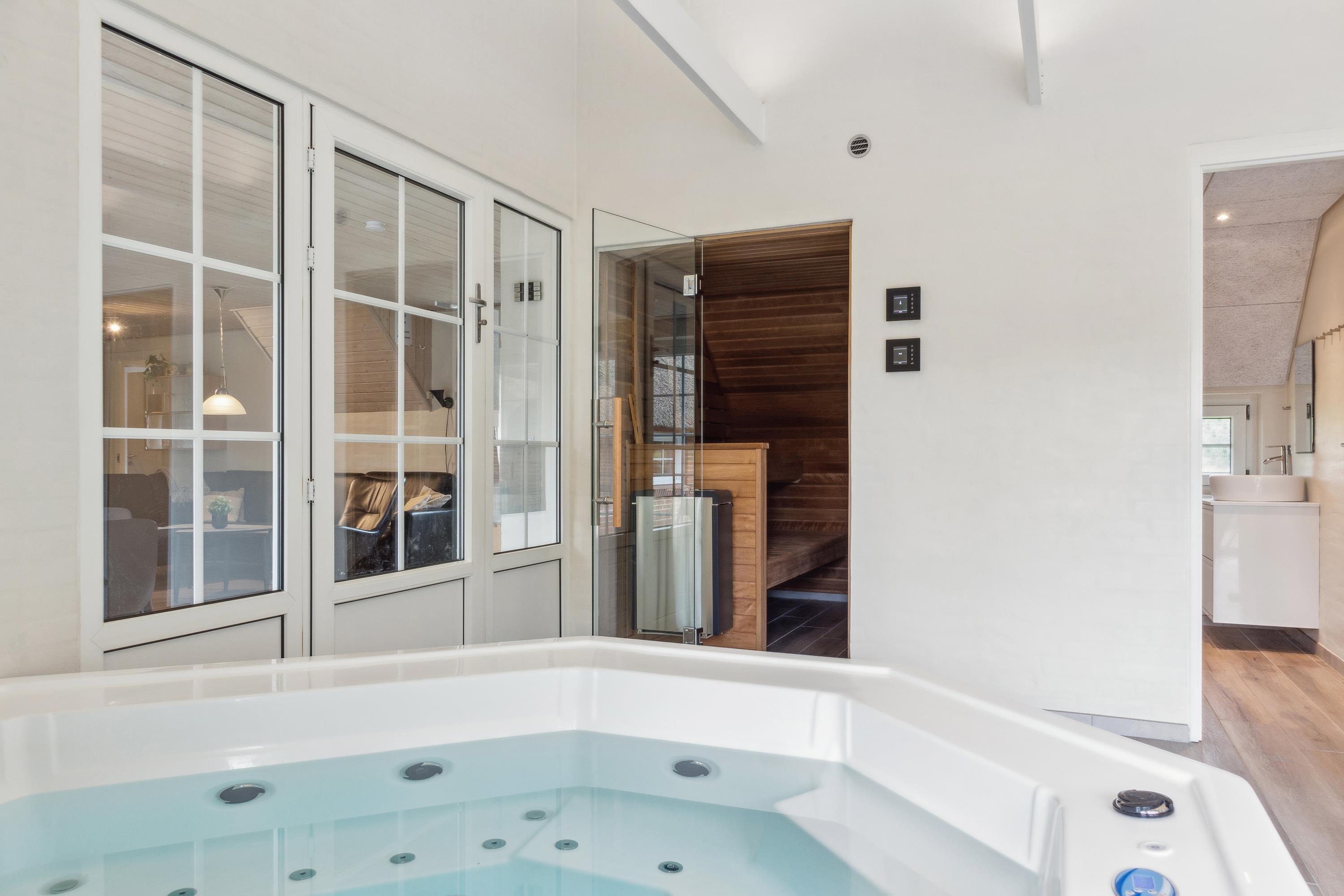 Dies ist eines der gepflegtesten Ferienhäuser mit Pool in Vester Husby. Perfekt geeignet für ein Familienfest "mit allen" oder für zwei befreundete Familien, die einen erholsamen Urlaub mit Fokus auf Wellness machen wollen. Infrarotsauna – mit atemwegsfreundlichem Himalaya-Salzstein, finnische Sauna, Salzwasserswimmingpool mit Rutsche und Gegenstromanlage und großer Whirlpool. Ihr wollt noch mehr? OK! Dann haben wir hier noch einen Spiel-und-Spaß-Raum mit Poolbillard und extra Fernseh-Sitzecke für euch sowie im Garten Fußballtor, Kletterturm und Sandkasten. Auf der Terrasse im Innenhof seid ihr hervorragend vorm Nordseewind geschützt. Hier könnt ihr die Sonne in vollen Zügen genießen und an manchen Tagen hört ihr sogar das Rauschen des Meeres.
