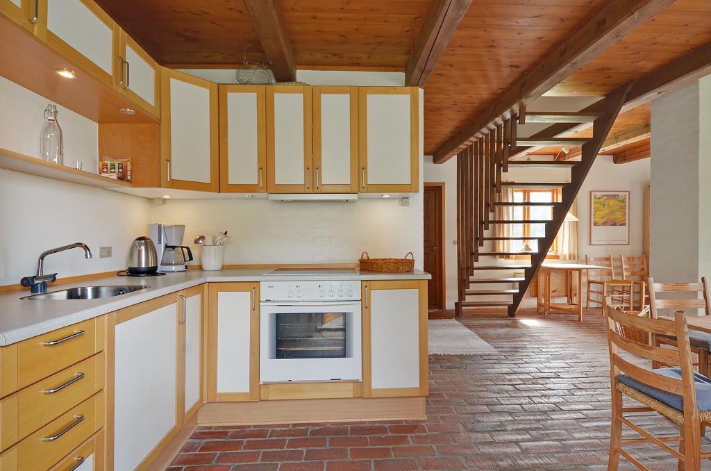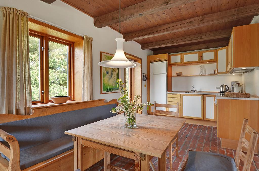 Im Wohn- und Küchenbereich sorgen schöne, ältere Holzmöbel, ein massiver Holztisch mit Bank und Stühlen sowie der Kaminofen für Gemütlichkeit und das richtige Feriengefühl.
