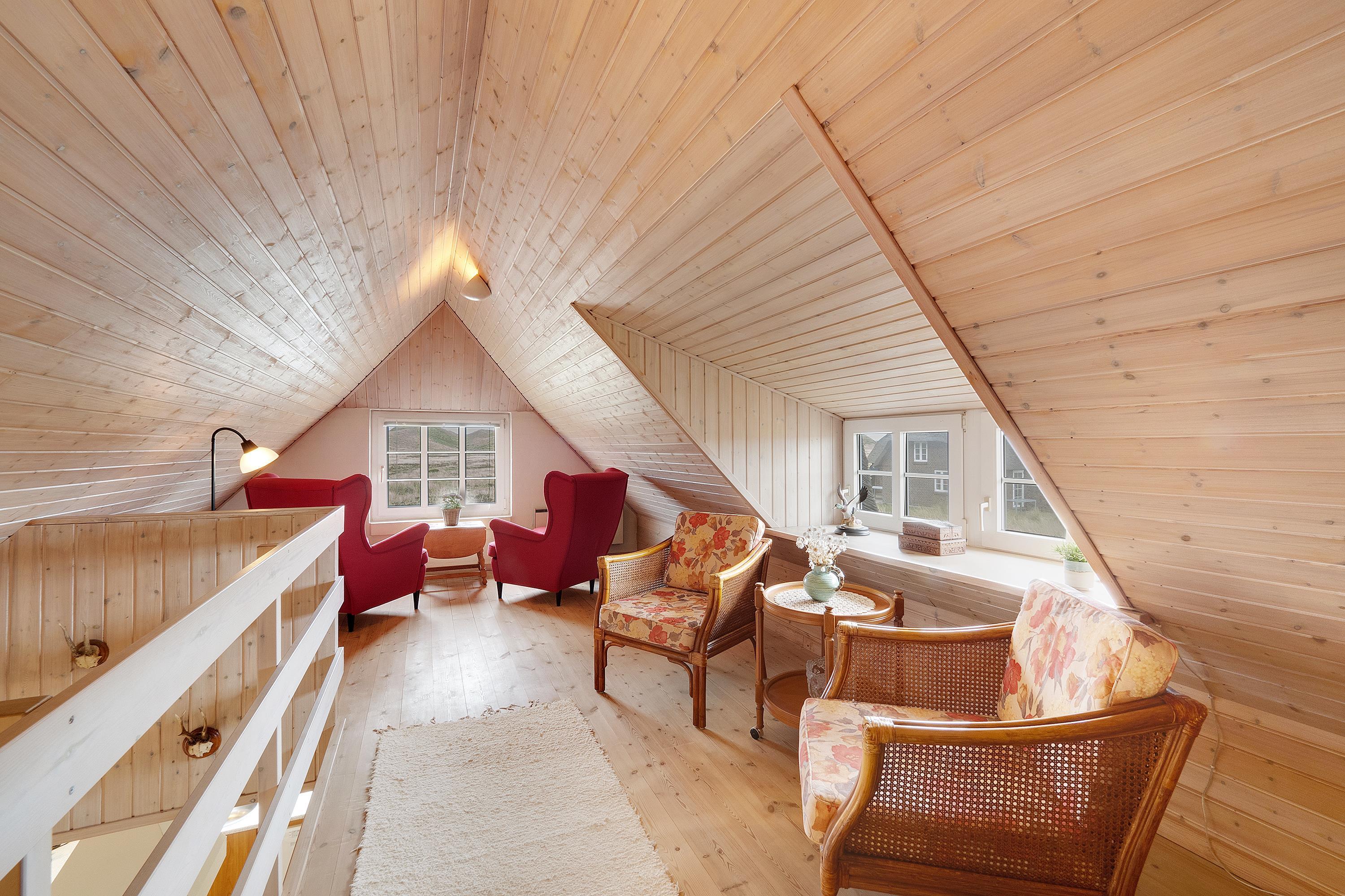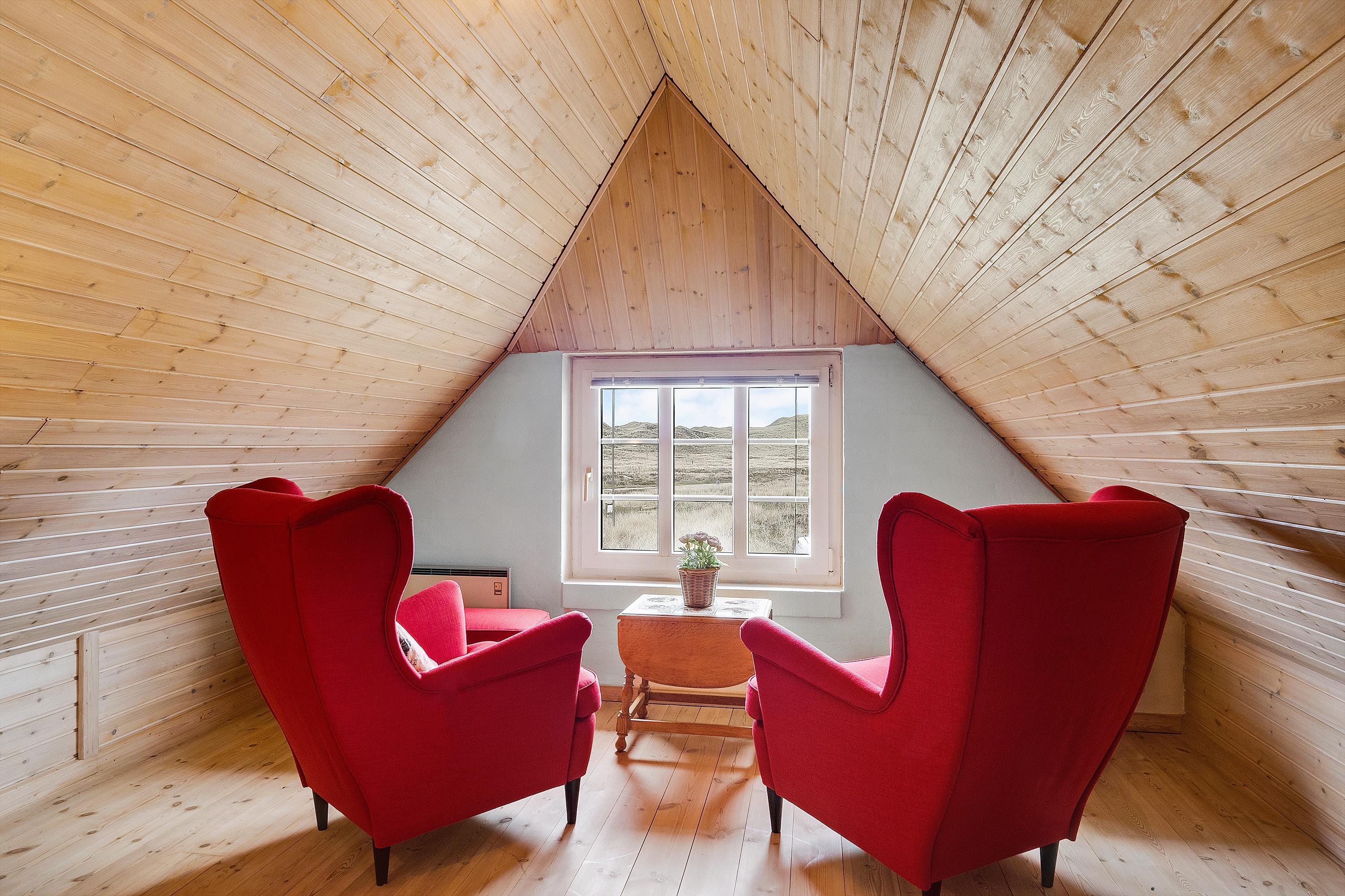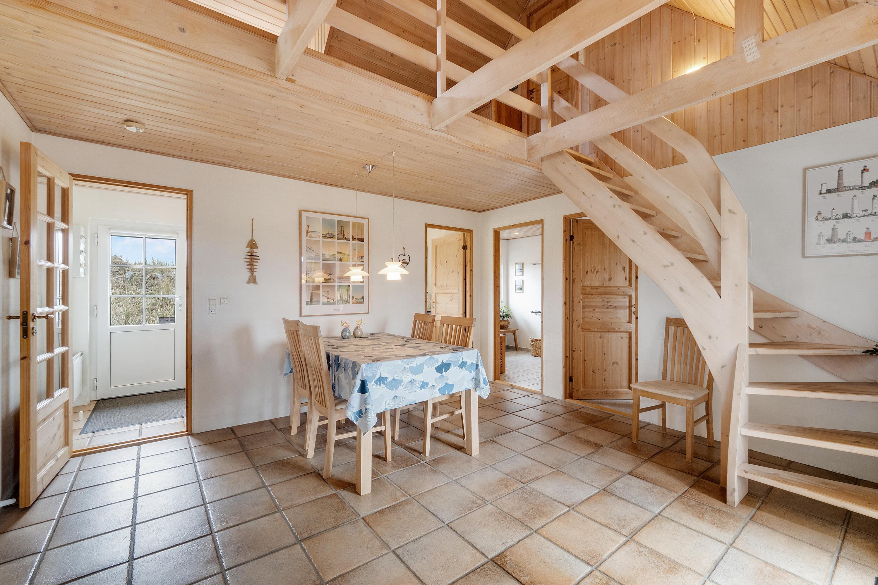 Im Obergeschoss befindet sich ein zusätzlicher Aufenthaltsraum – der perfekte Ort für eine Tasse Kaffee, ein gutes Buch und den Blick über die westjütländische Natur.