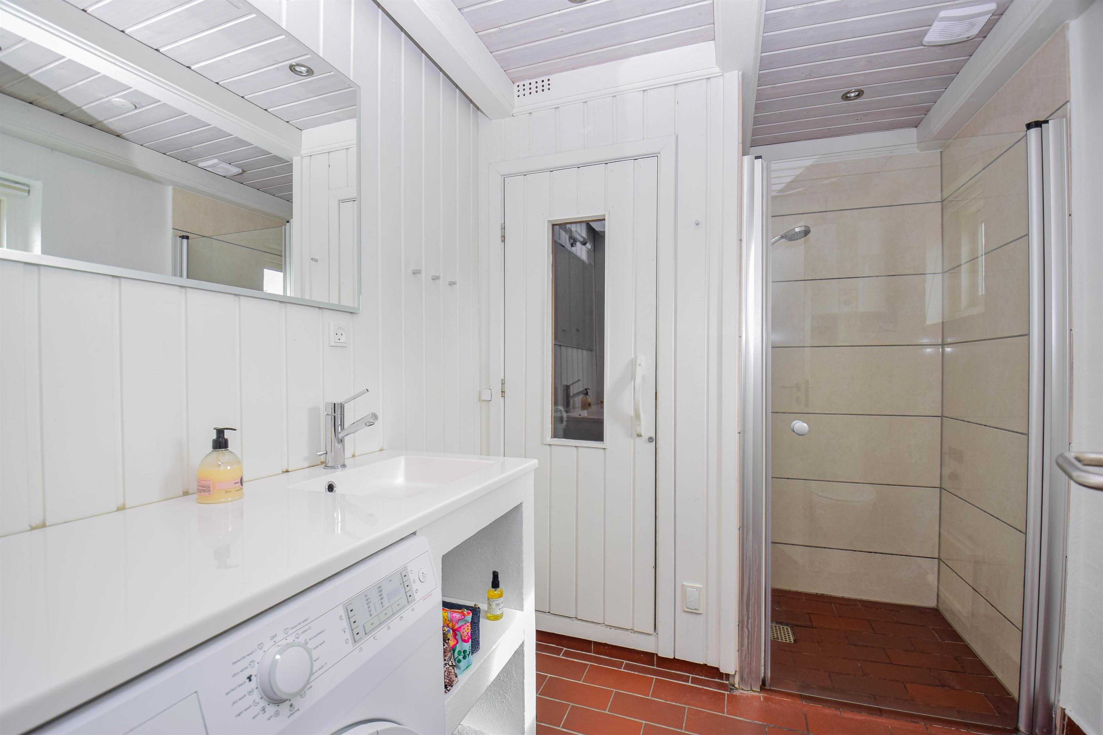 Helles Badezimmer mit Dusche, Fußbodenheizung und großer Sauna