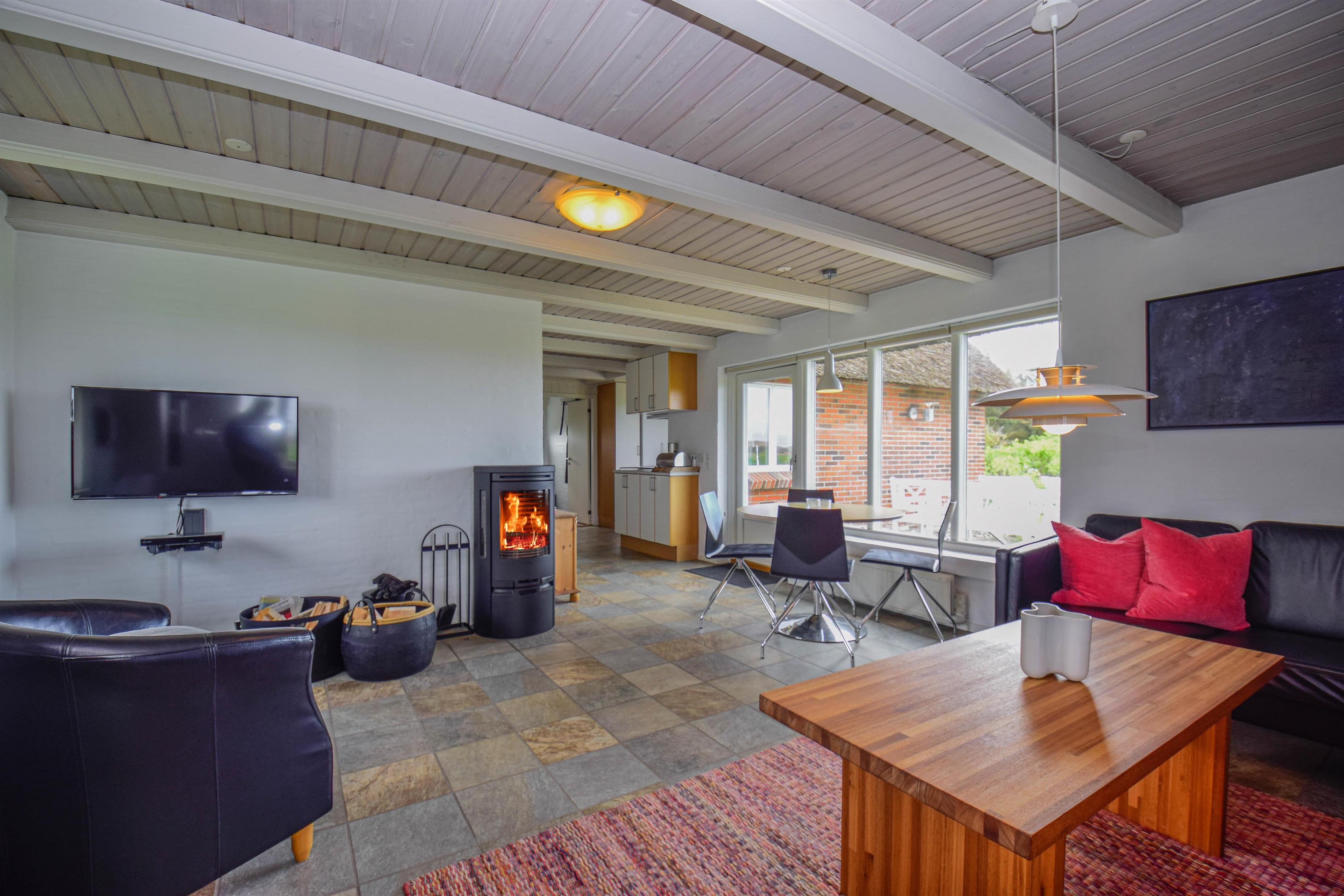 Im Wohnzimmer sorgt ein Holzofen für Wärme und Gemütlichkeit, während du durch die Fenster den Blick auf die Dünen genießen kannst.