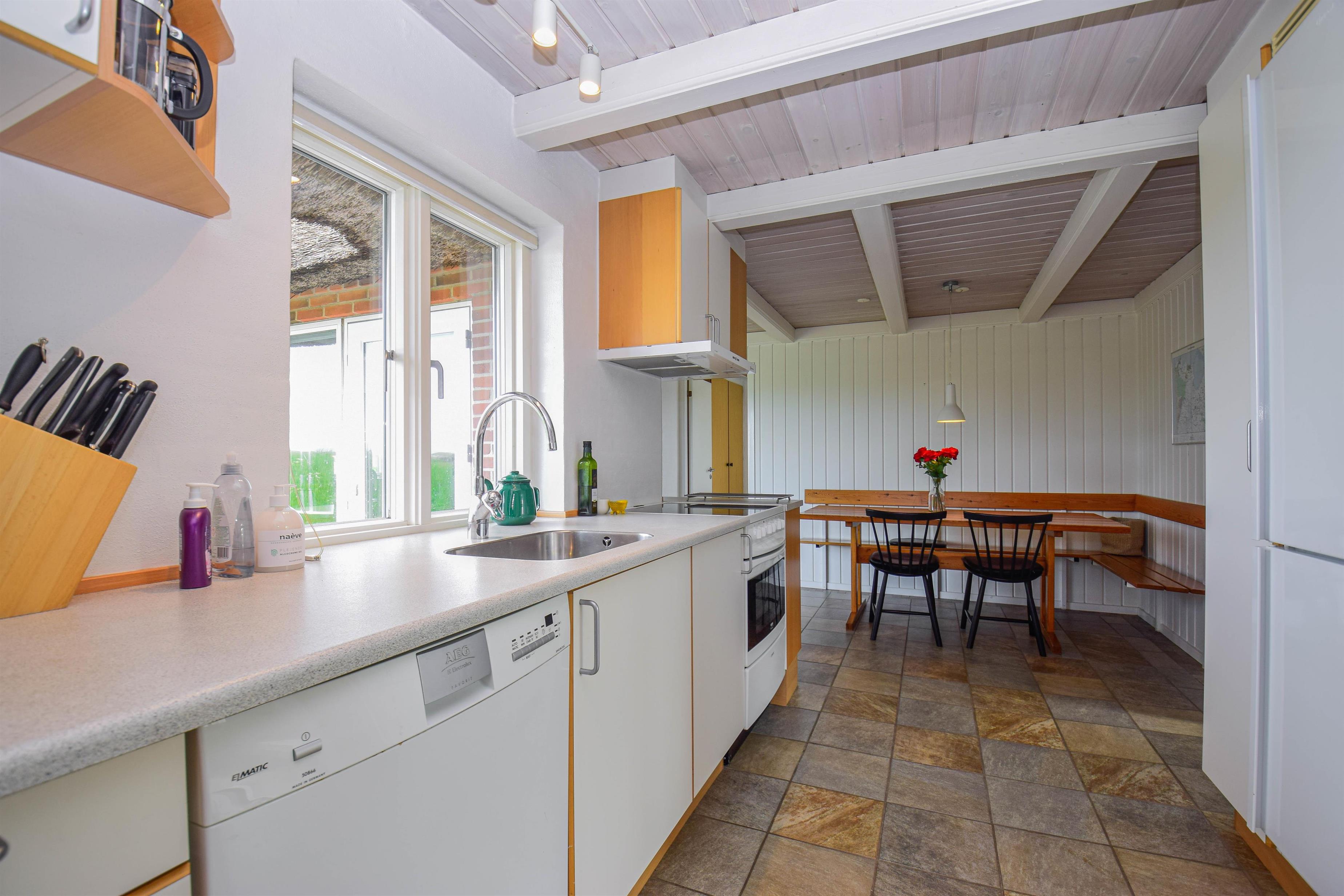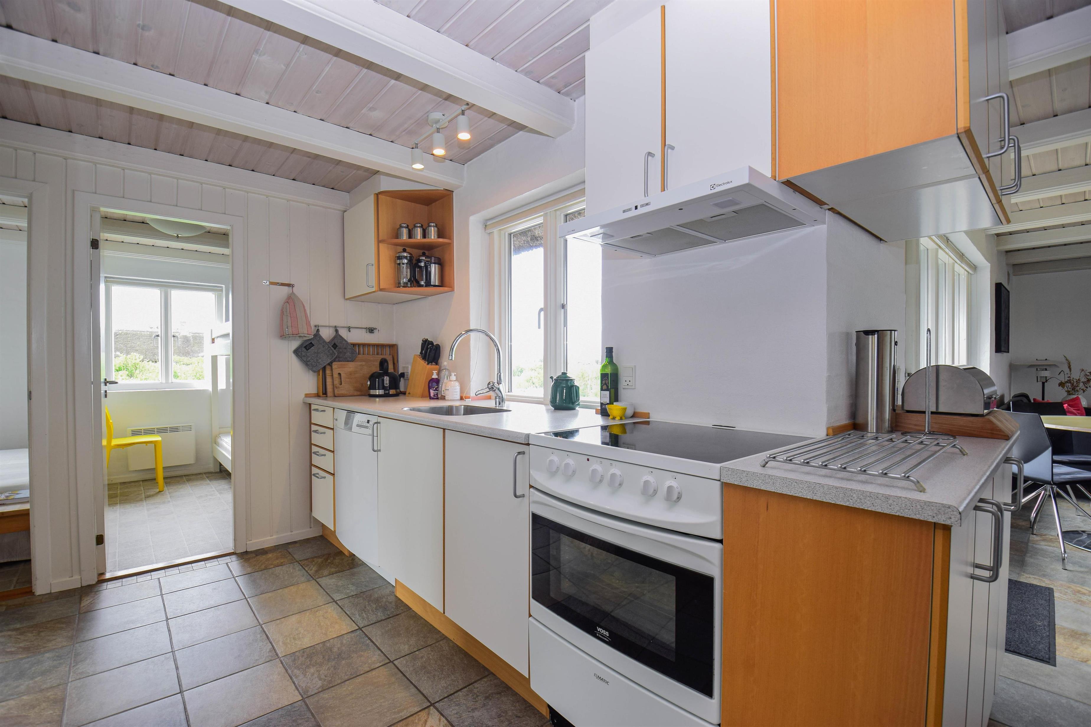Moderne, helle Küche mit Fußbodenheizung und Dünenblick