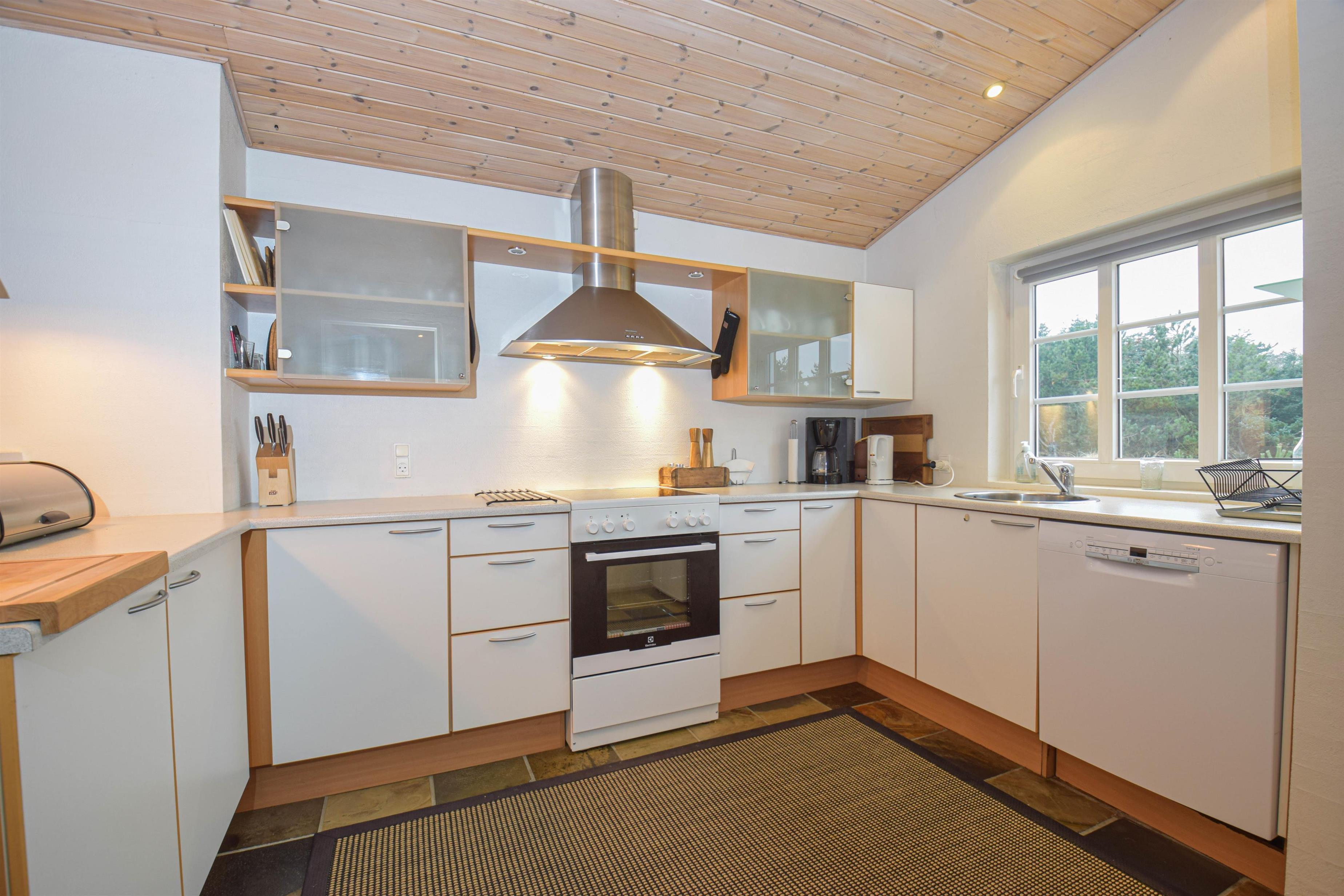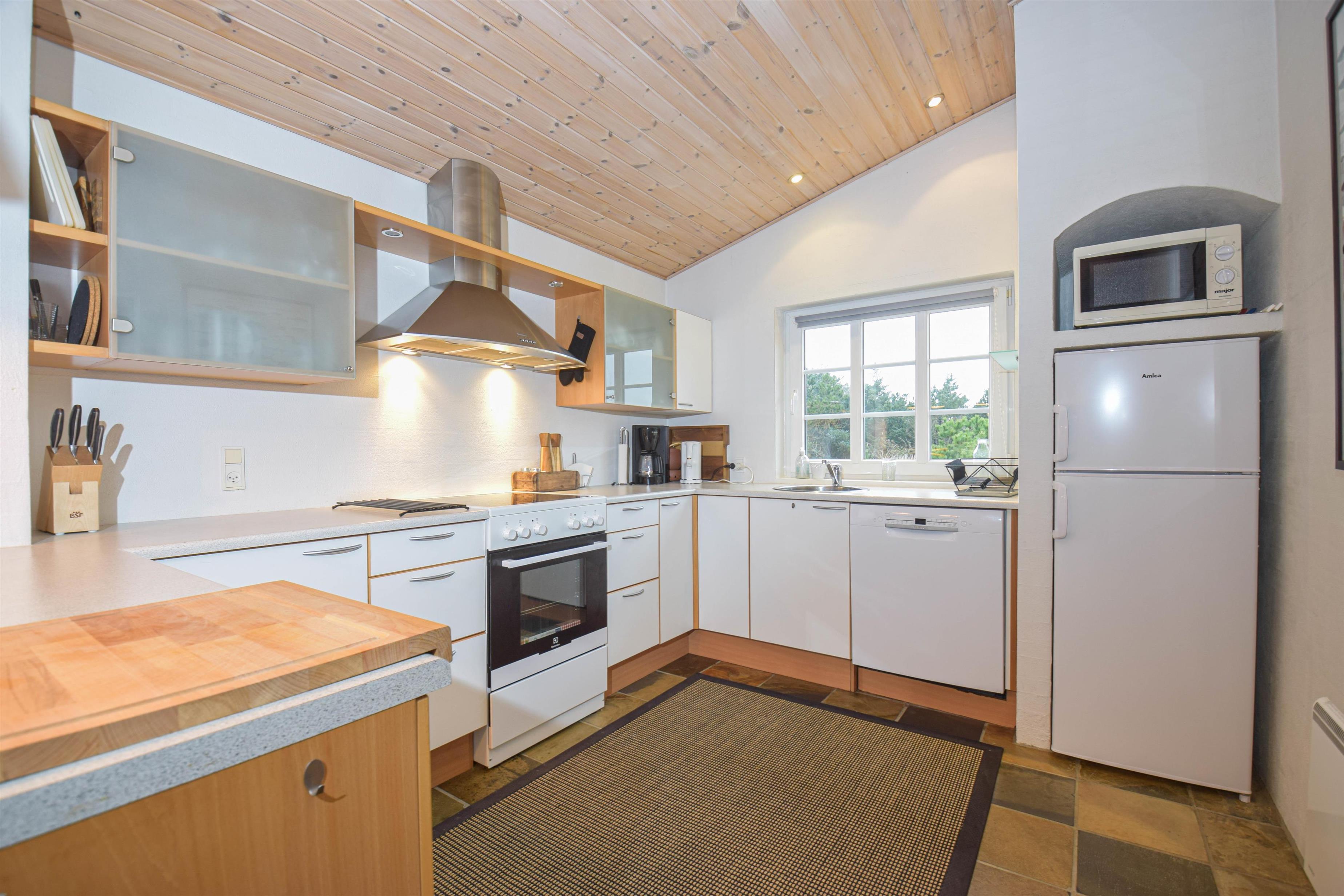 Die helle Küche verfügt über viel Platz und ist offen mit dem Wohnbereich verbunden, in dem der Kaminofen an kühlen Tagen für Wärme und Gemütlichkeit sorgt.