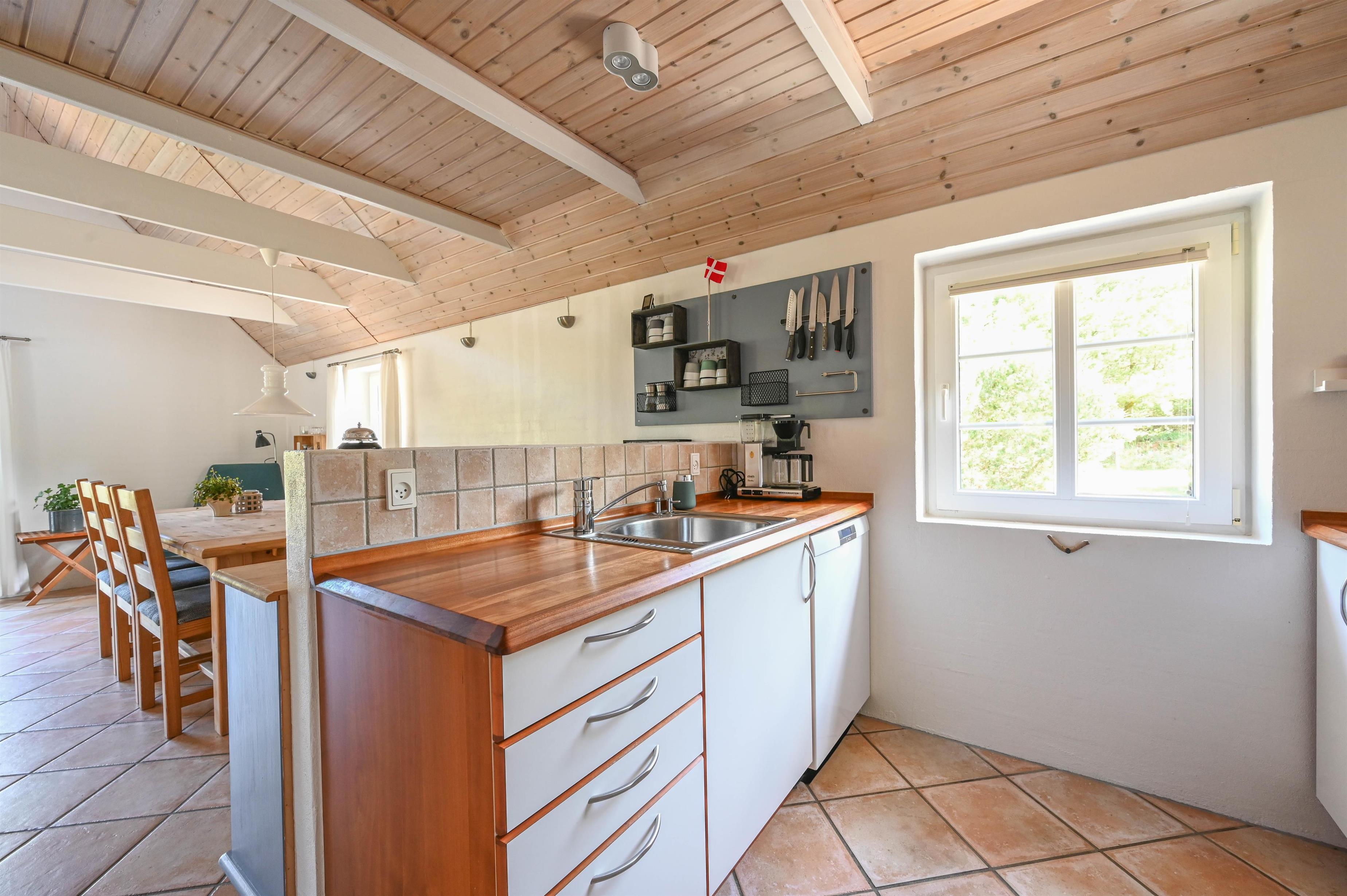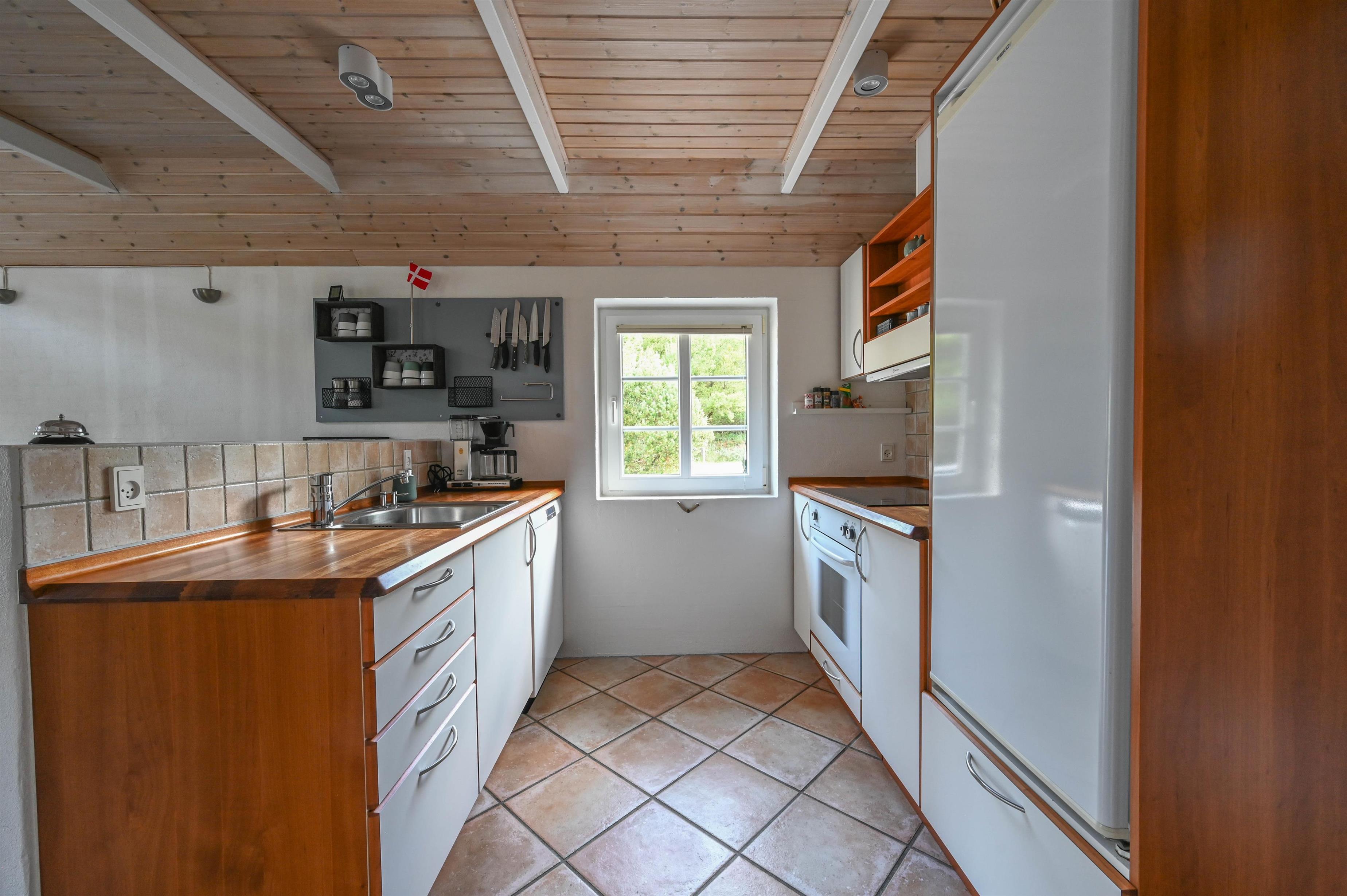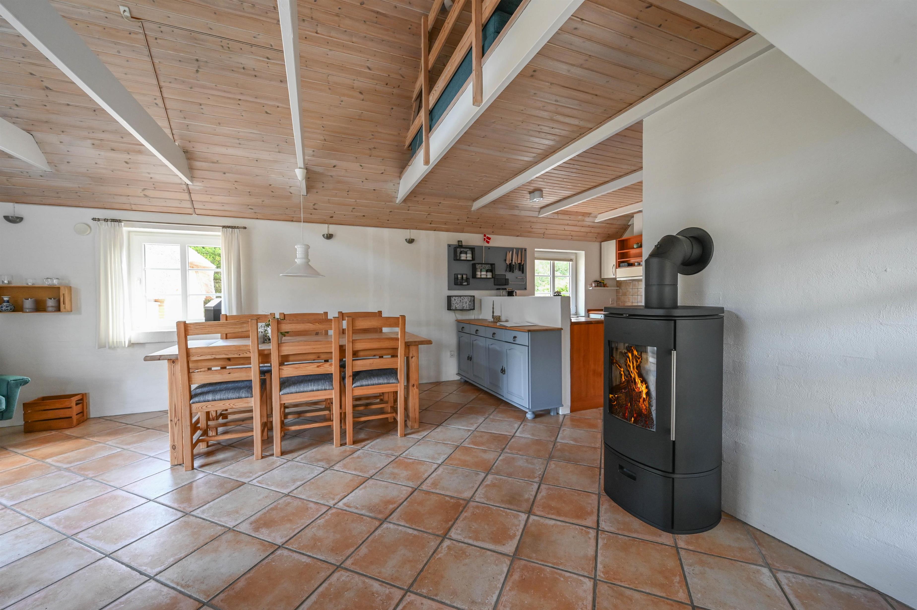 Die Küche ist offen mit dem Wohnzimmer verbunden, wo sowohl eine Wärmepumpe als auch ein Kaminofen für eine angenehme Atmosphäre sorgen.