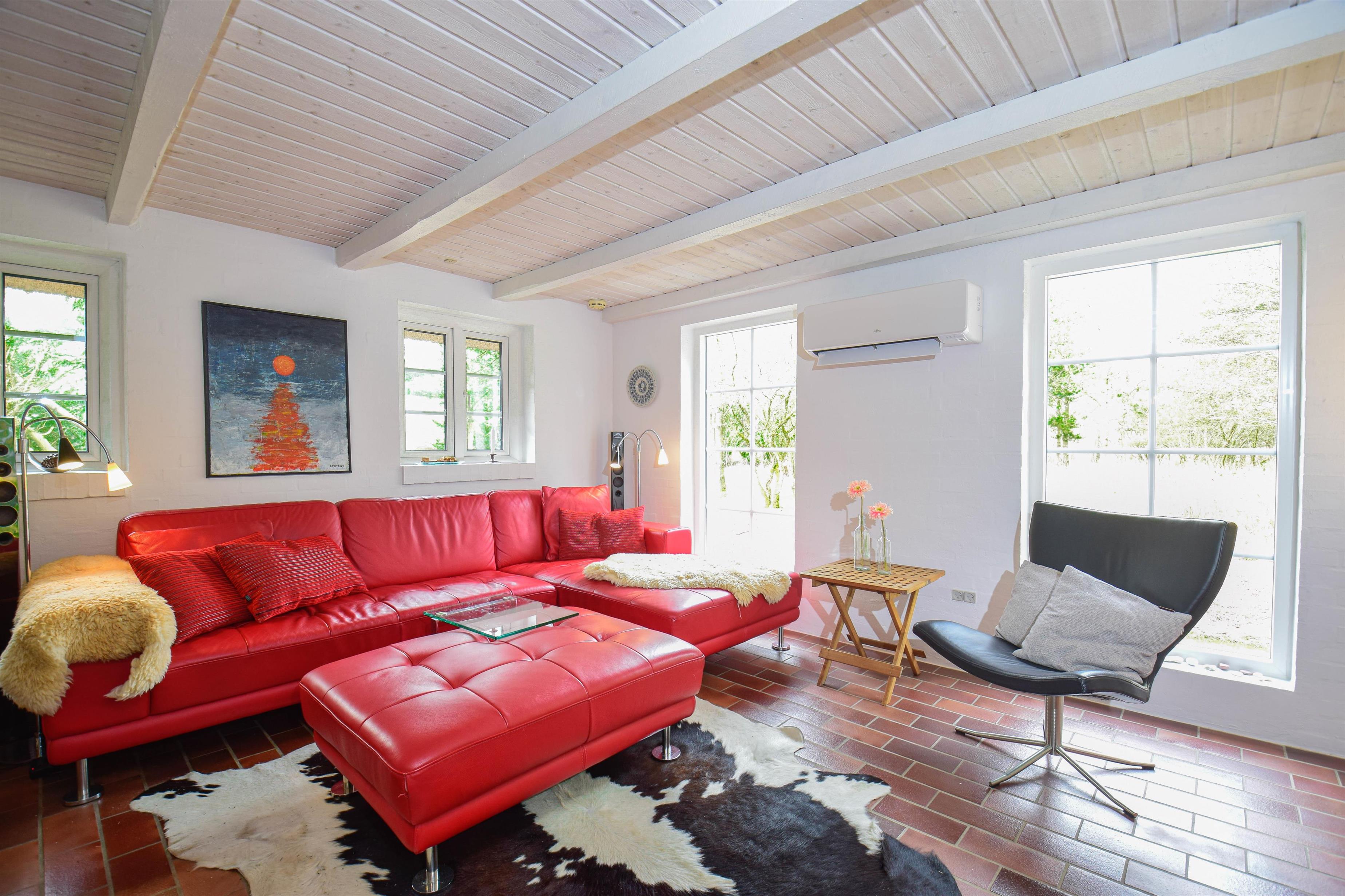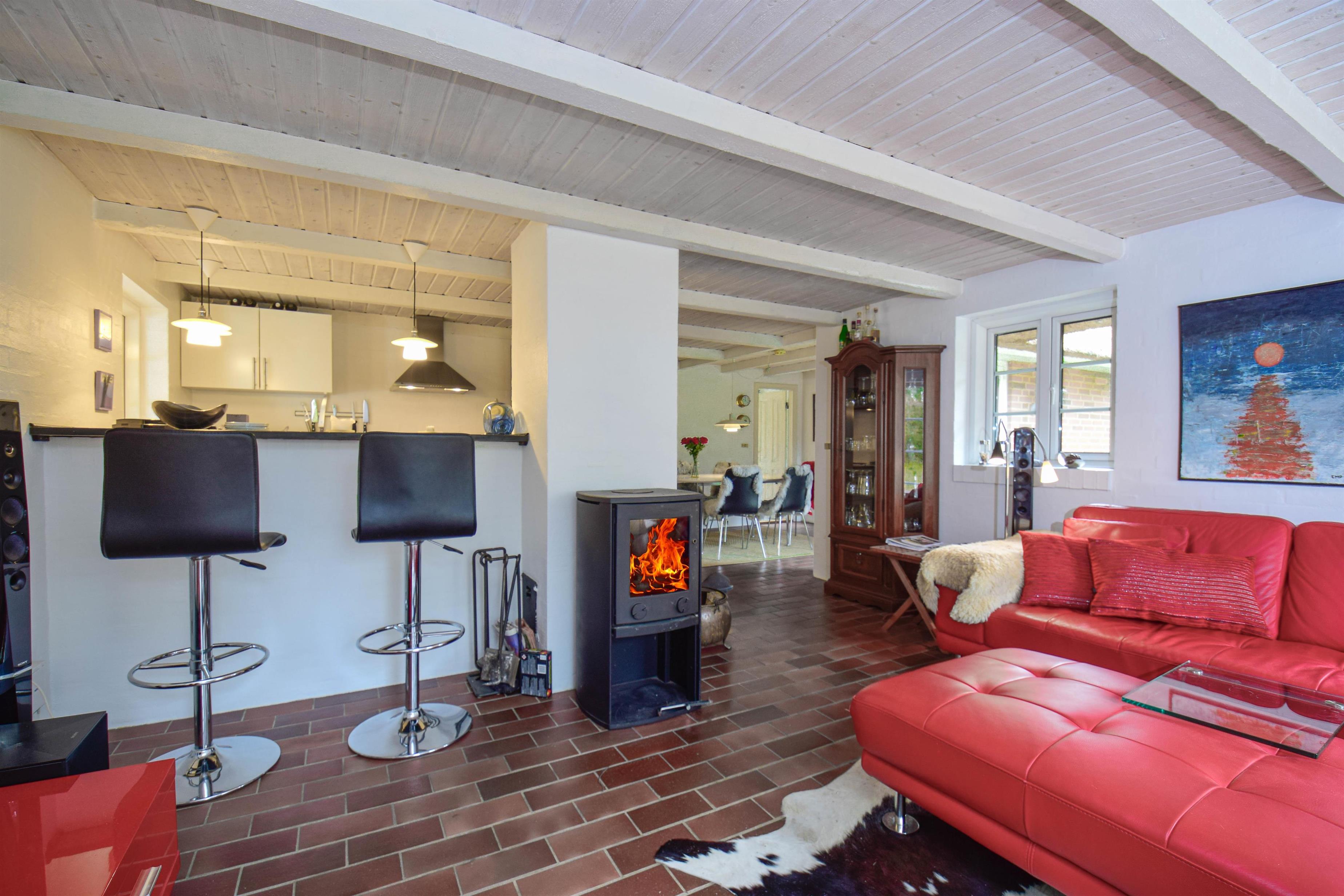 Daran anschließend liegt das Wohnzimmer, das mit seinem Kaminofen und Flachbildfernseher zu entspannten Abenden nach einem Tag am Meer einlädt.