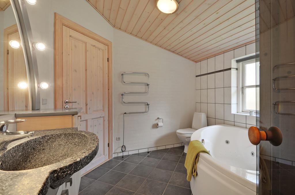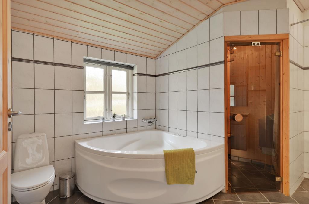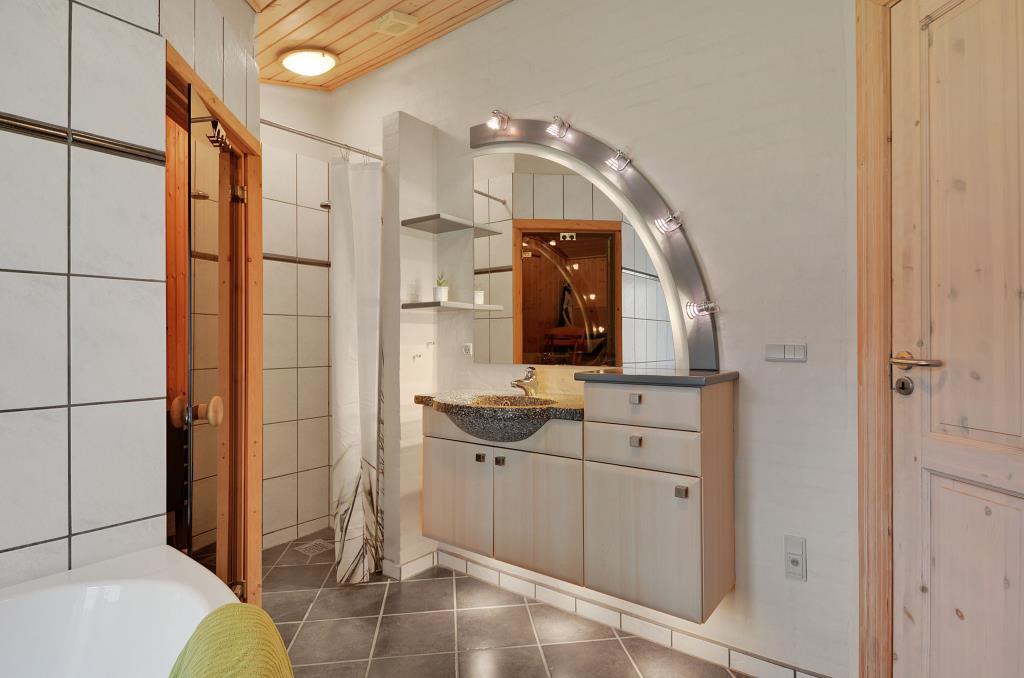 Großes Badezimmer mit Whirlpool, Sauna, Dusche und Fußbodenheizung