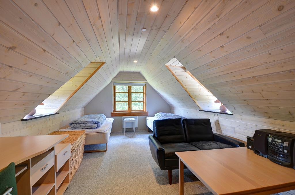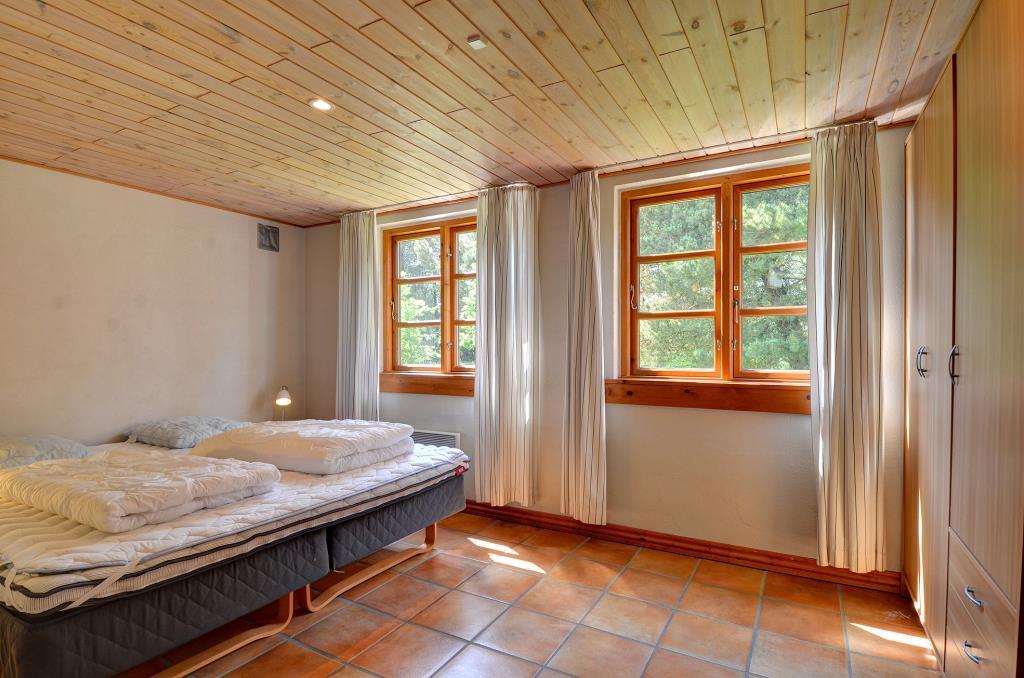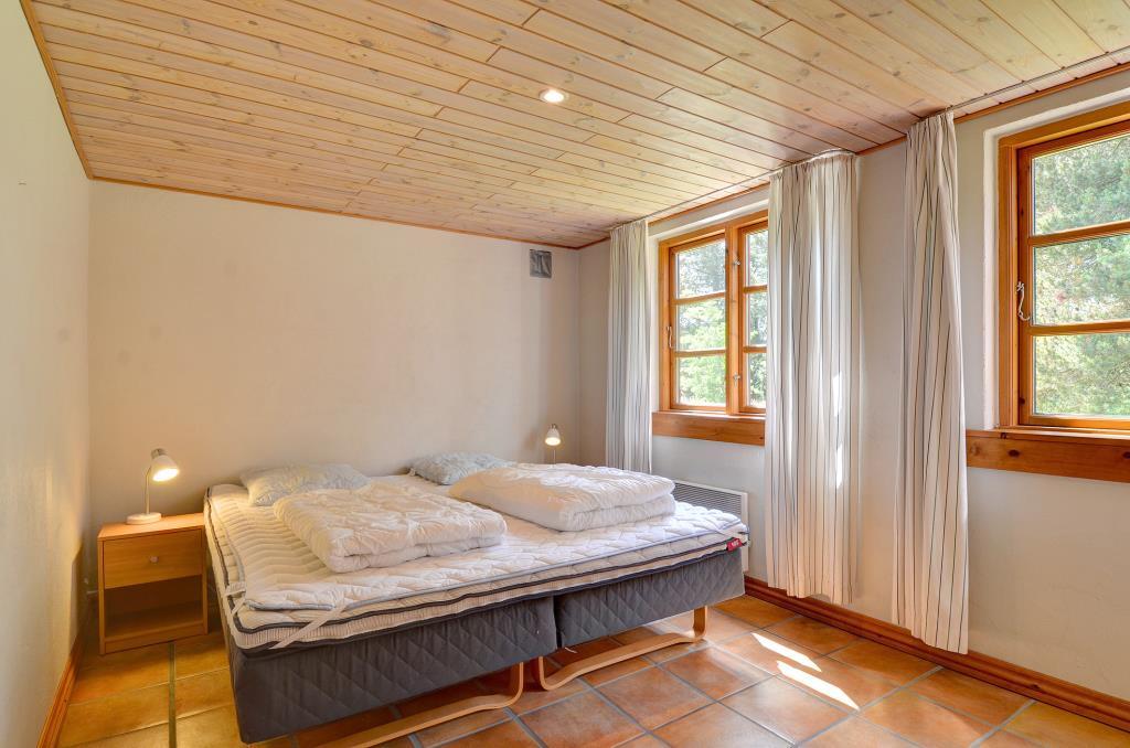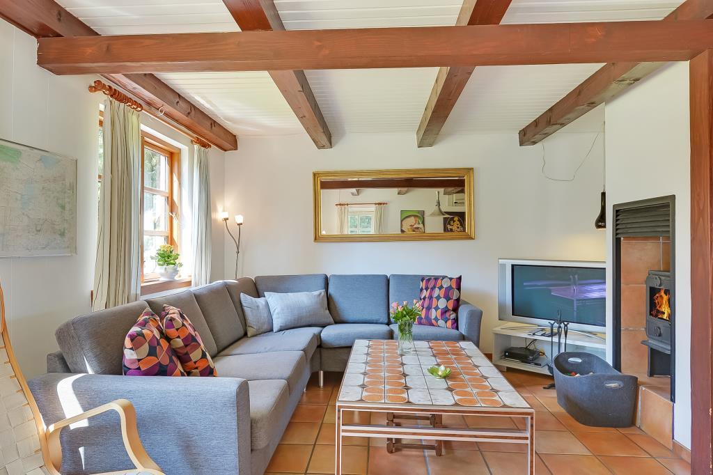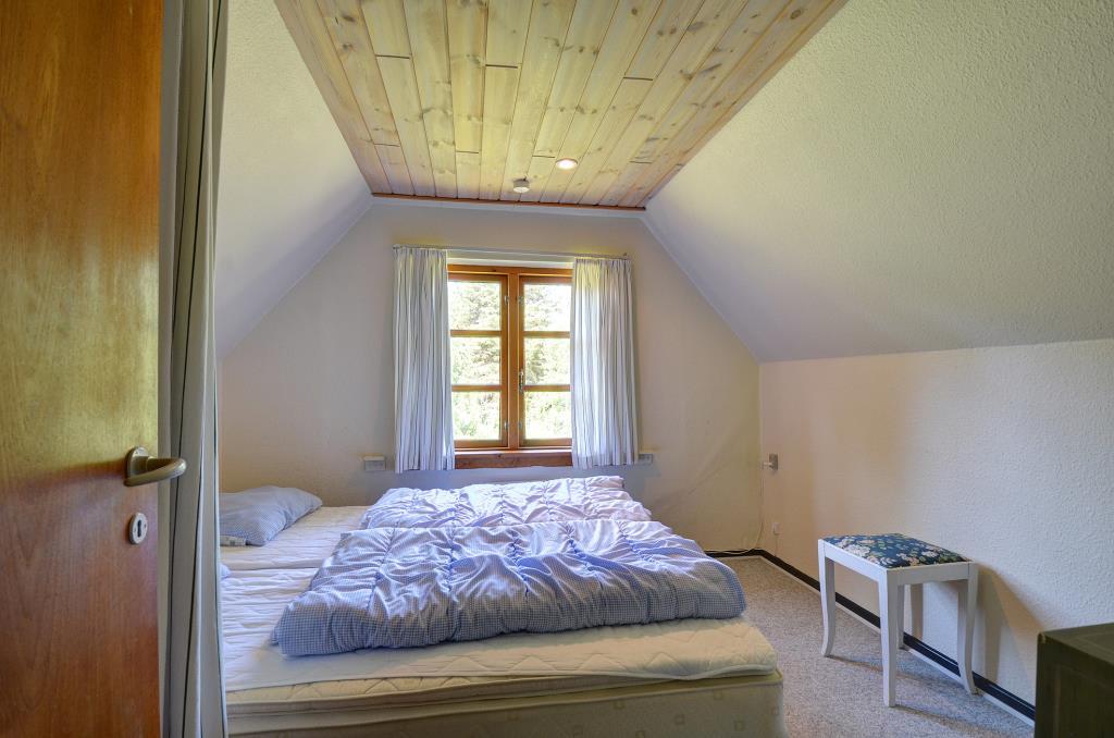 Aufteilung: Eingang mit Treppe zum 1. Stock. Gemütliches, gefliestes Wohnzimmer mit integrierter Küche und einem Kaminofen, der auch den ersten Stock beheizt. Zwei Bäder, eines mit Dusche und Waschmaschine, das andere mit Dusche und Sauna. Insgesamt 4 Schlafzimmer. Im Erdgeschoss: Eines mit Doppelbett (Fliesenboden). Im 1. Stock: Eines mit Doppelbett, eines mit 2 Einzelbetten und eines als kombinierter Wohnraum mit noch einmal 2 Einzelbetten (alle mit Teppichboden).
