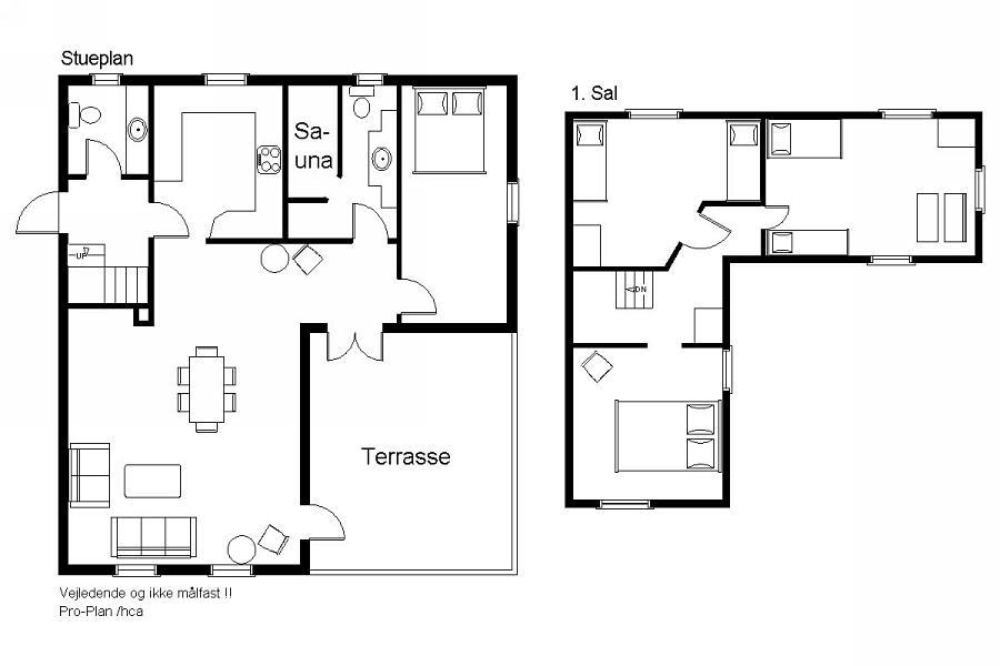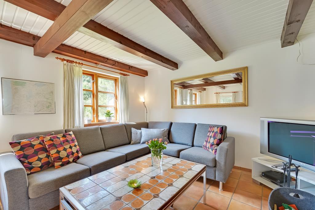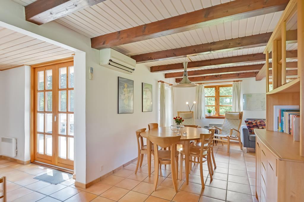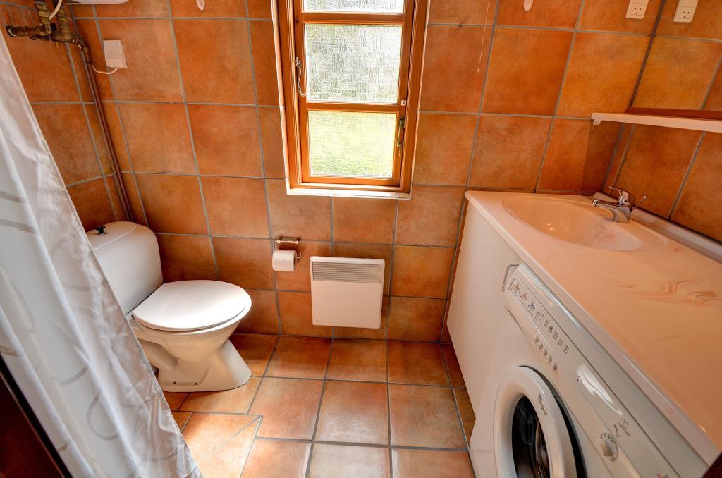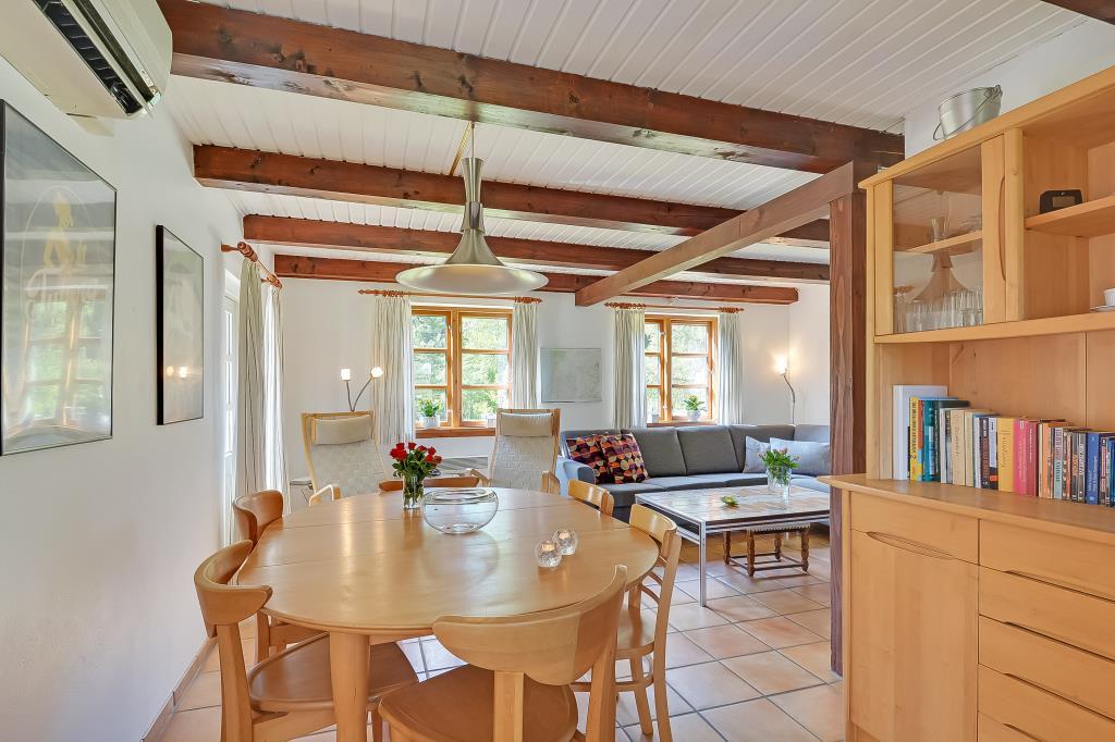 Aufteilung: Eingang mit Treppe zum 1. Stock. Gemütliches, gefliestes Wohnzimmer mit integrierter Küche und einem Kaminofen, der auch den ersten Stock beheizt. Zwei Bäder, eines mit Dusche und Waschmaschine, das andere mit Dusche und Sauna. Insgesamt 4 Schlafzimmer. Im Erdgeschoss: Eines mit Doppelbett (Fliesenboden). Im 1. Stock: Eines mit Doppelbett, eines mit 2 Einzelbetten und eines als kombinierter Wohnraum mit noch einmal 2 Einzelbetten (alle mit Teppichboden).