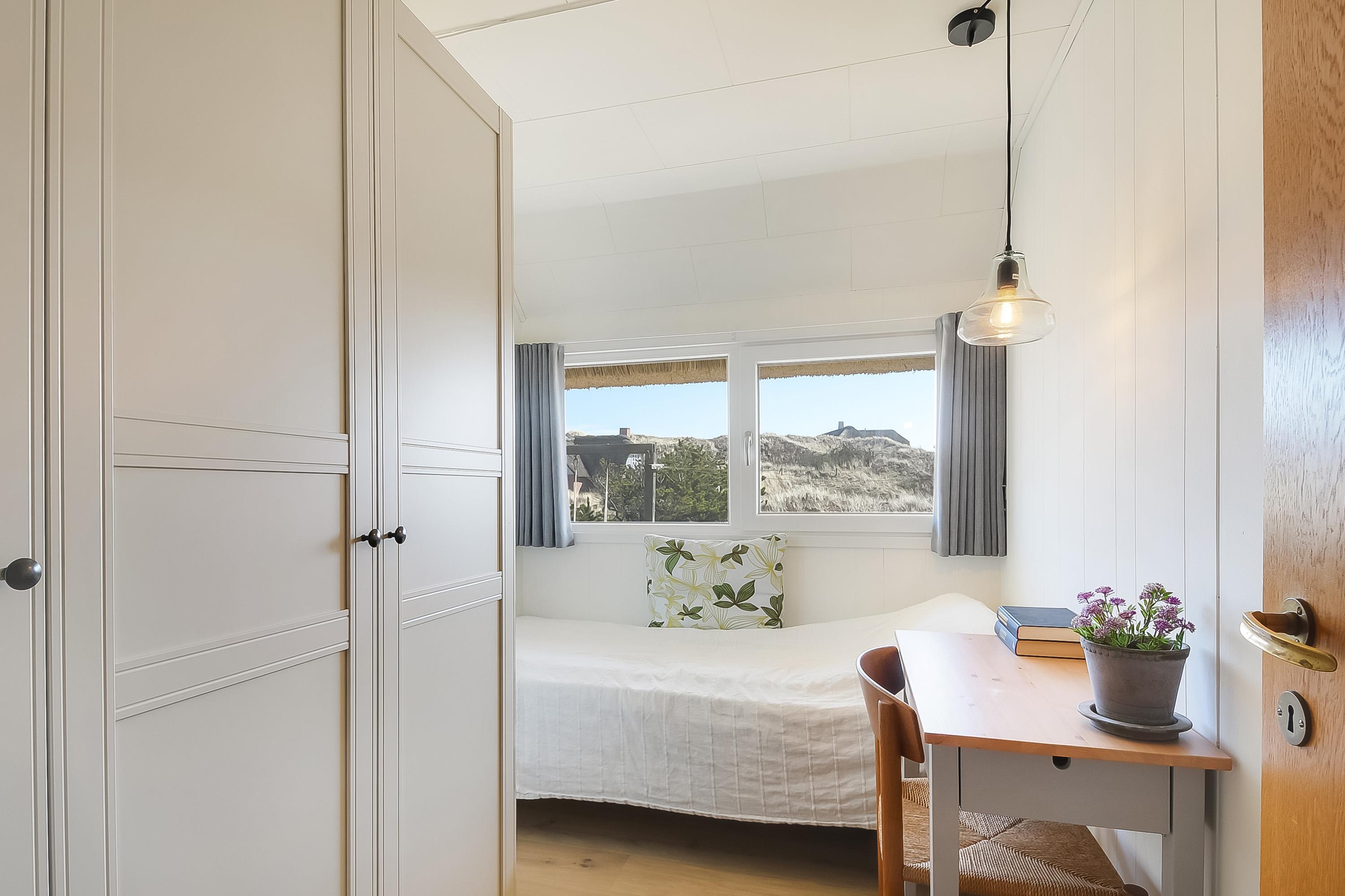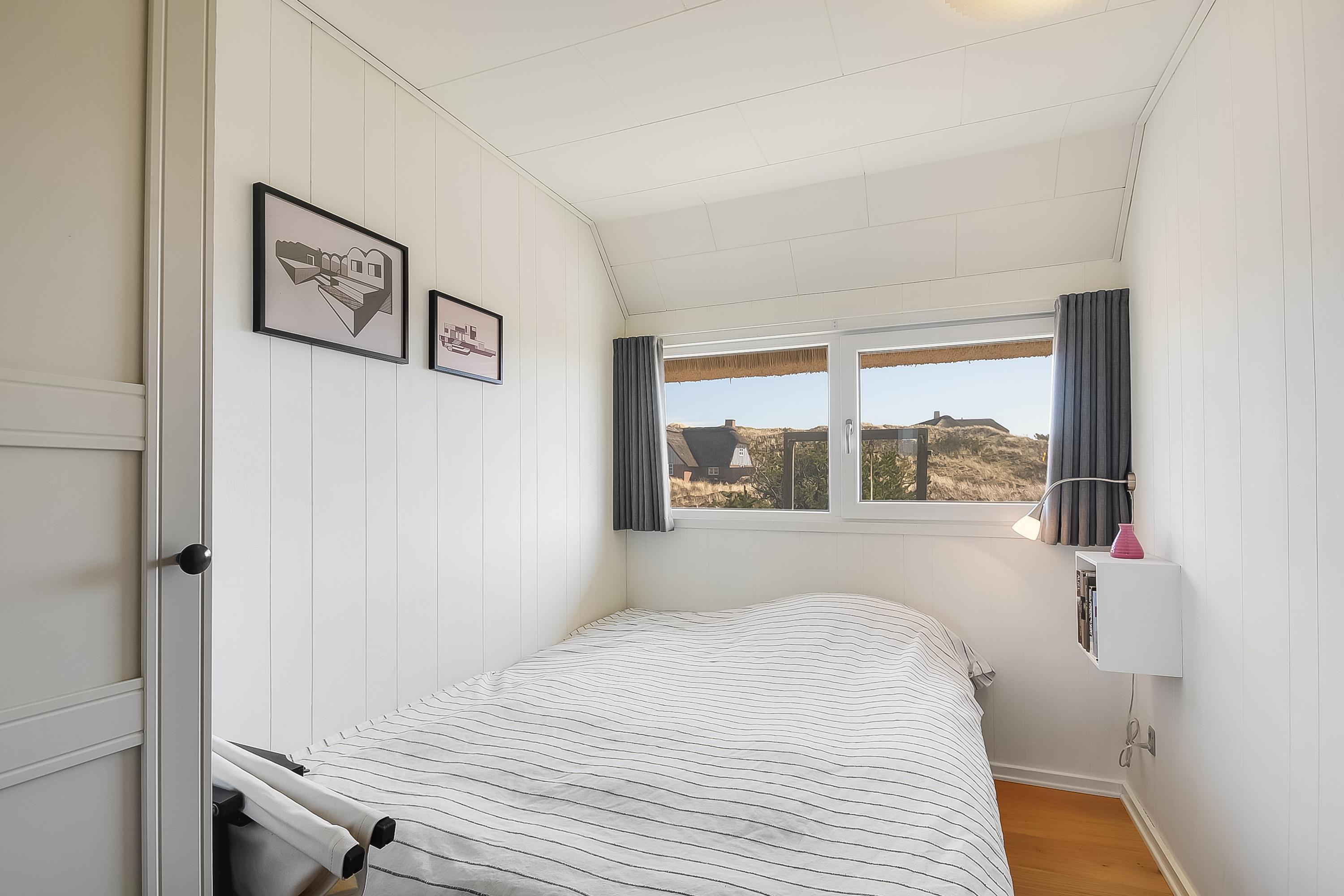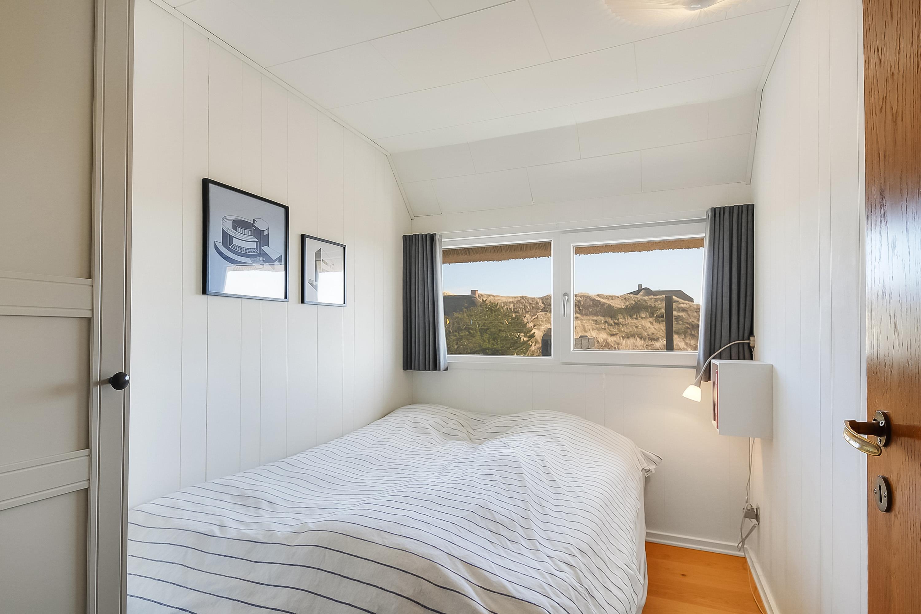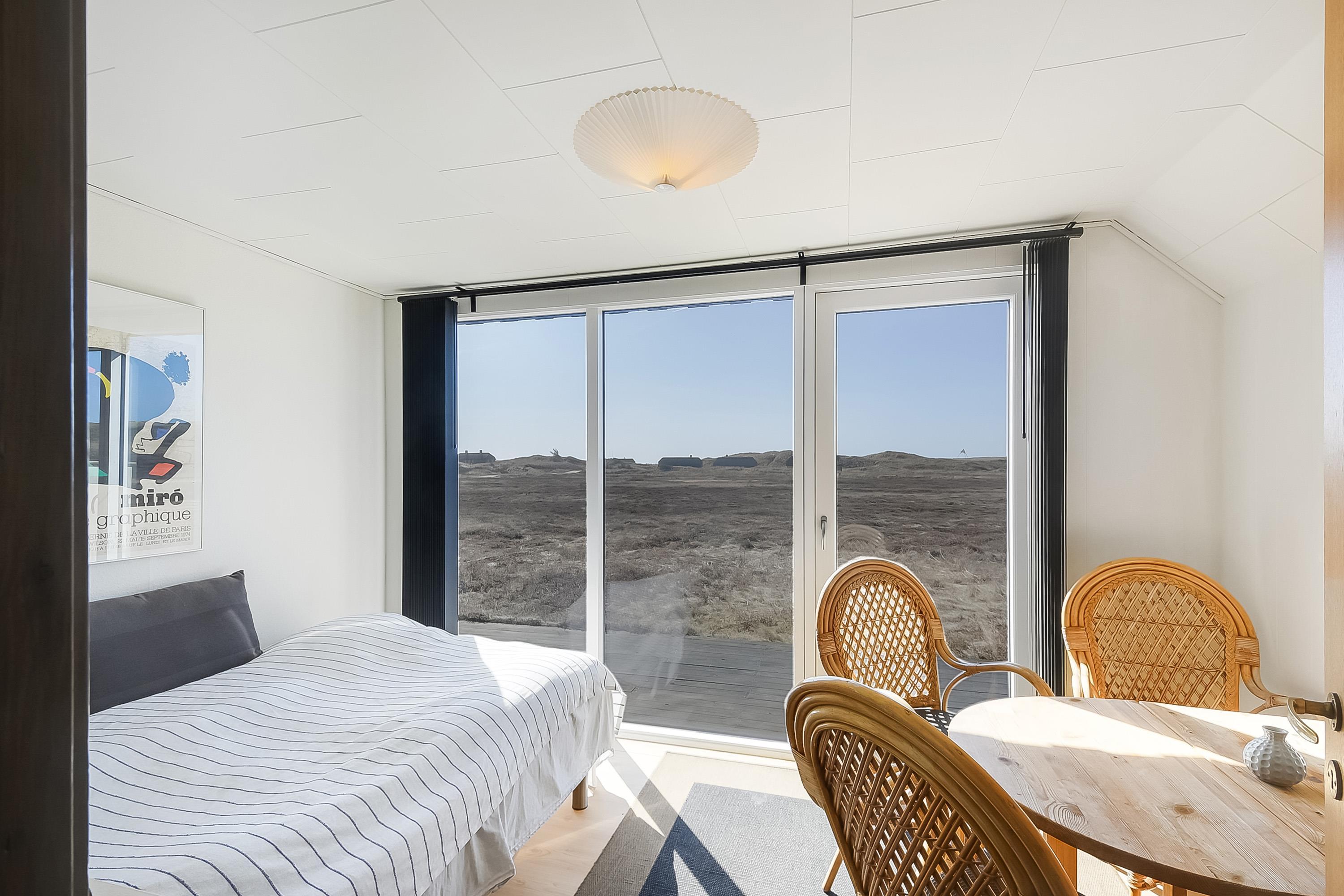Großes Schlafzimmer mit Doppelbett und Blick auf die Dünen und das alte Seezeichen