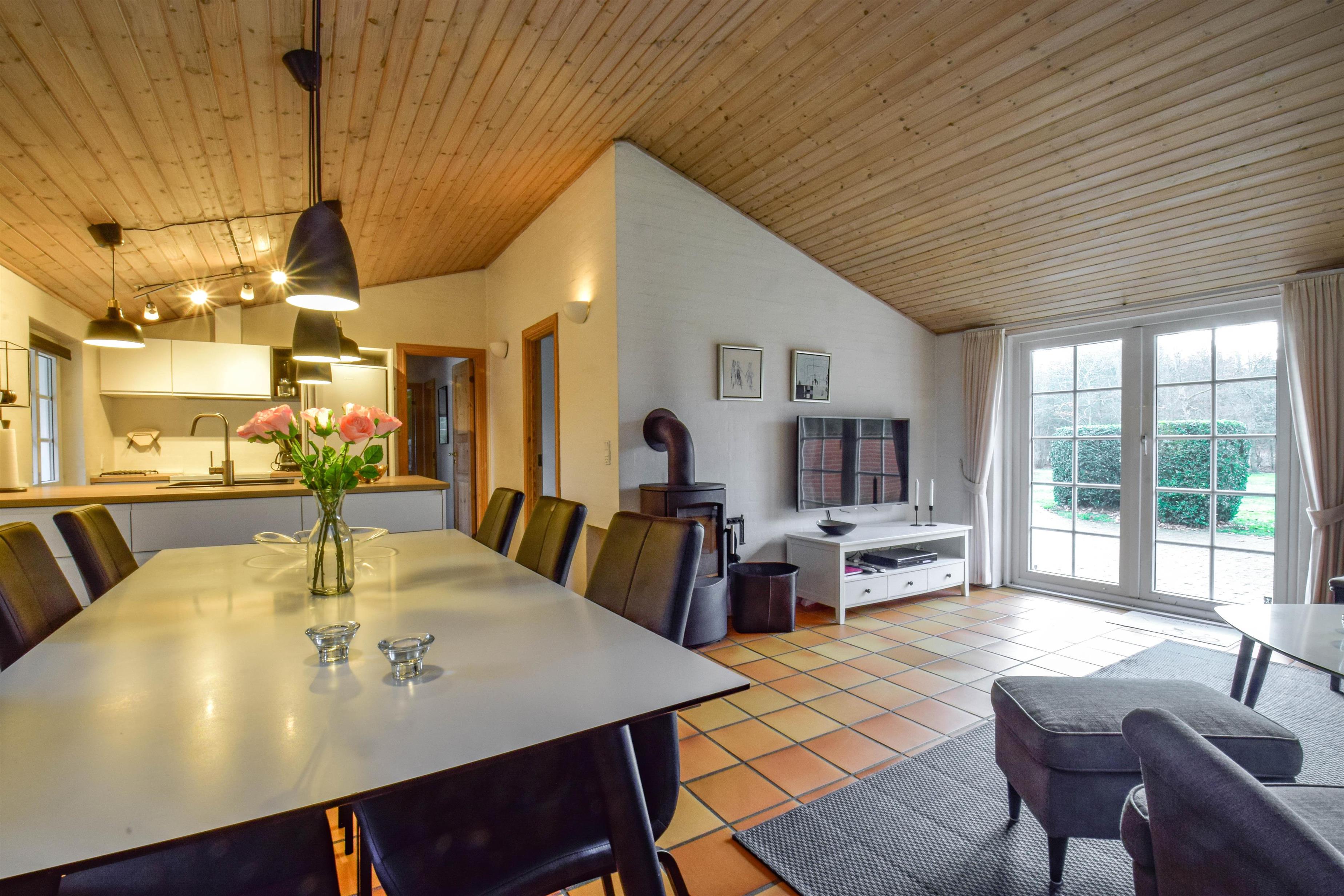 Das Herz des Hauses ist der offene Wohn- und Essbereich mit Kaminofen – hier könnt ihr gemeinsam kochen, spielen oder den Abend gemütlich ausklingen lassen.