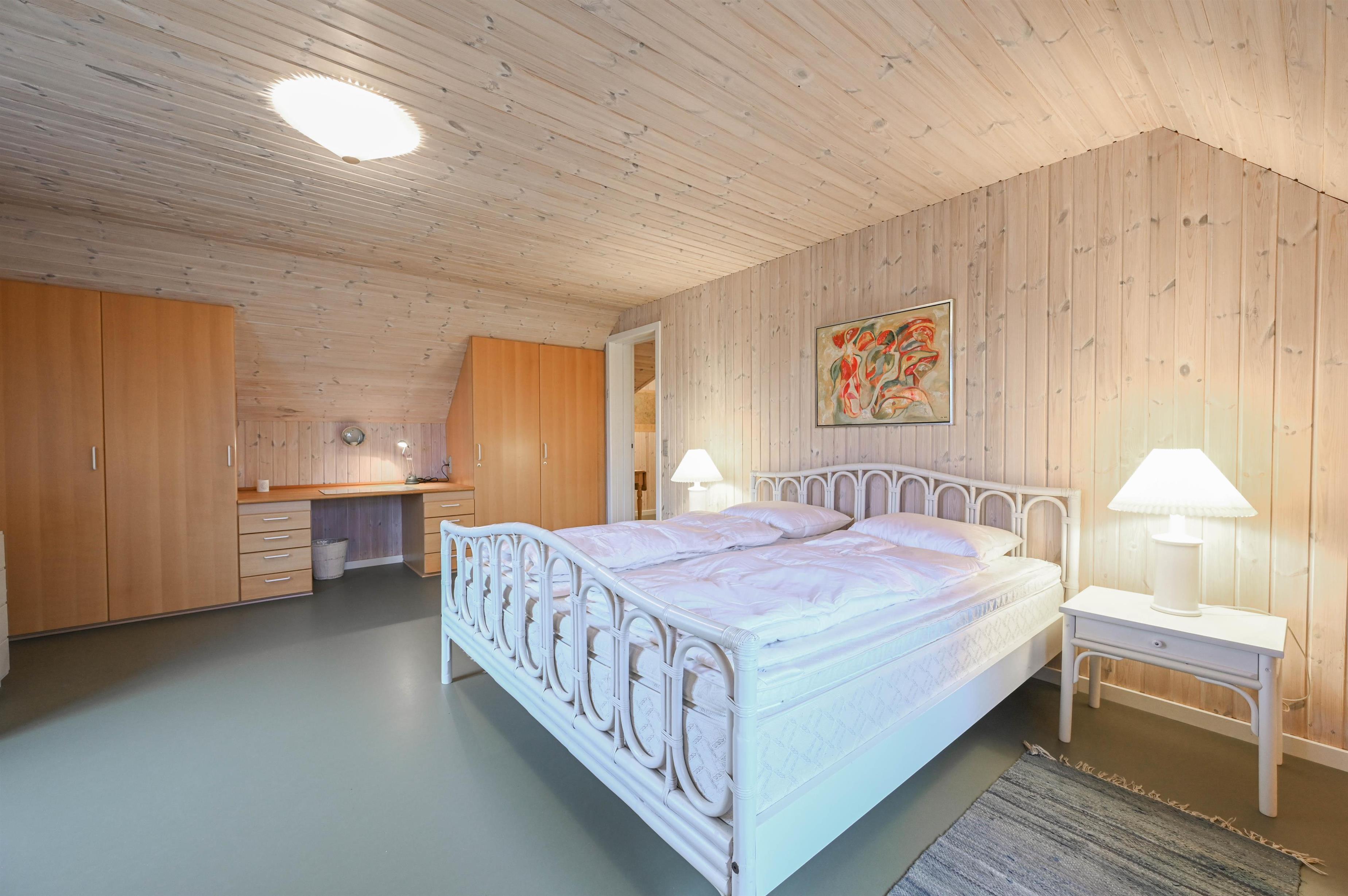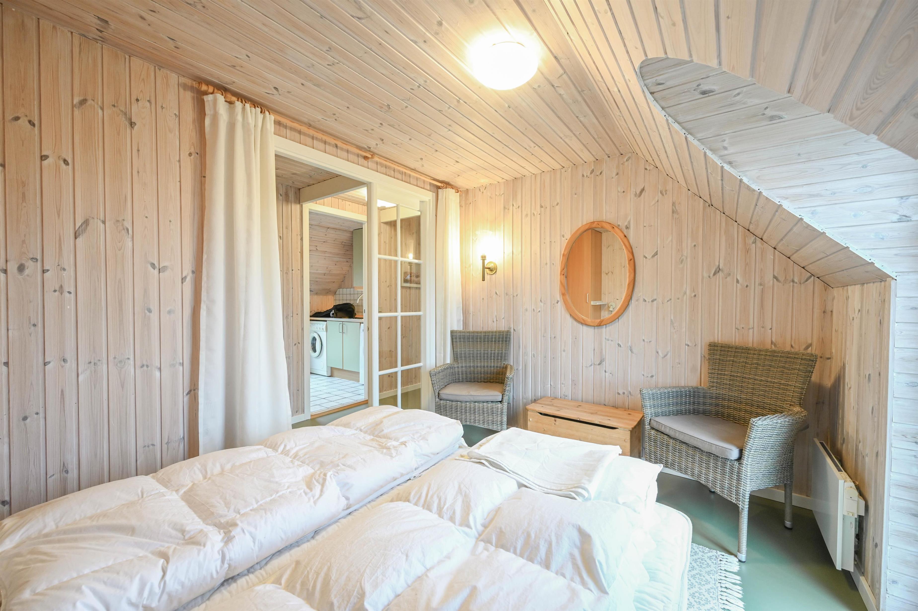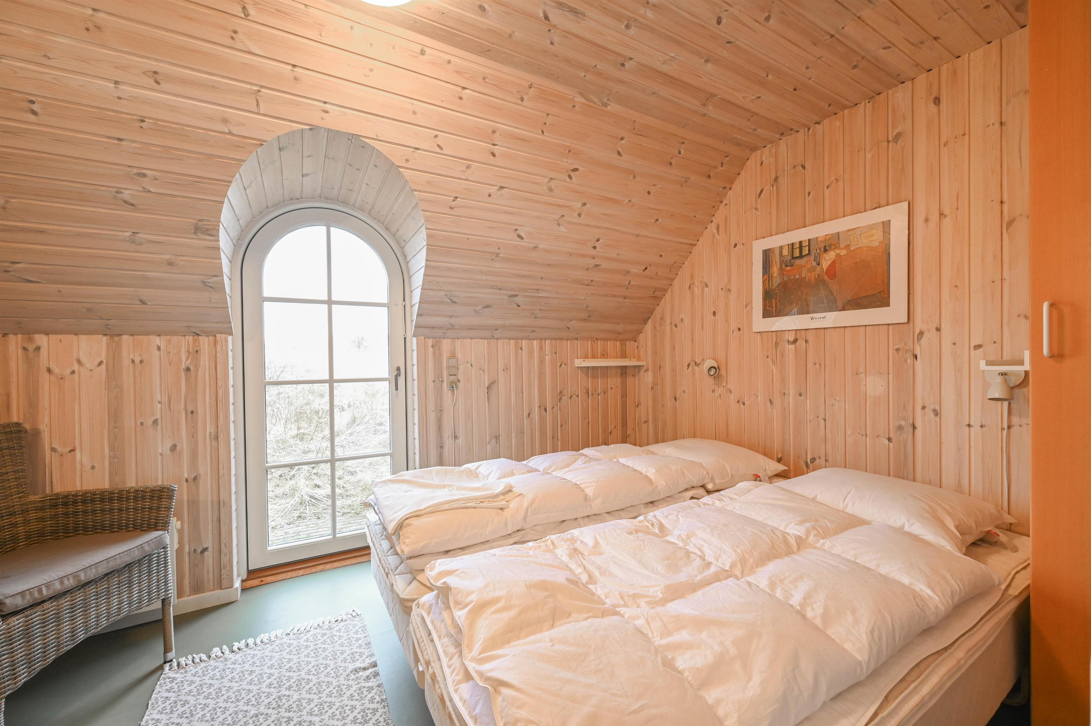 Großes Schlafzimmer mit Doppelbett und Blick auf die Dünen