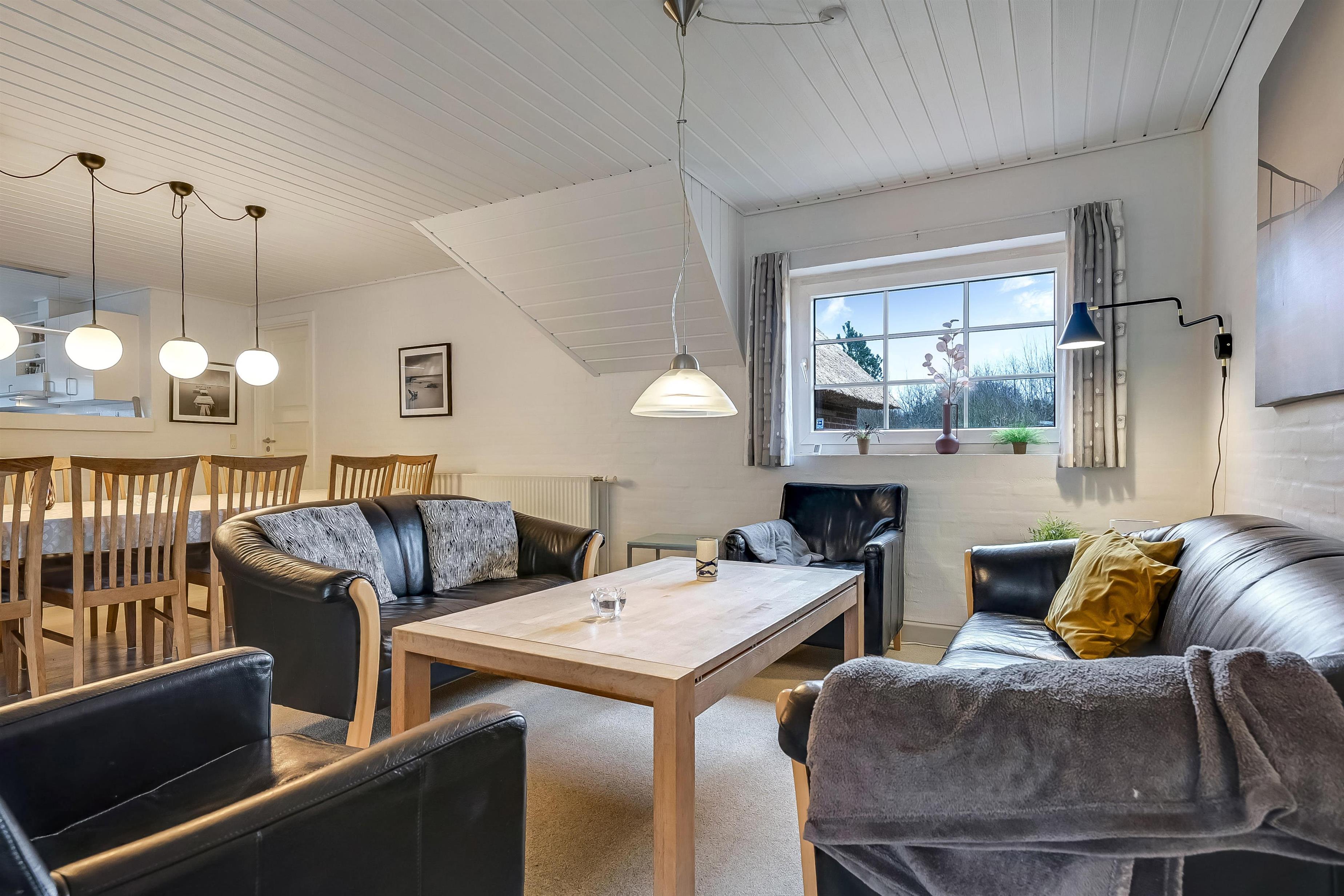 Die Küche ist gut ausgestattet und offen mit dem Wohnraum verbunden, der mit Ledermöbeln, einem großen Esstisch und einem Kamin eingerichtet ist – perfekt für gemeinsame Mahlzeiten und lange, gesellige Abende.