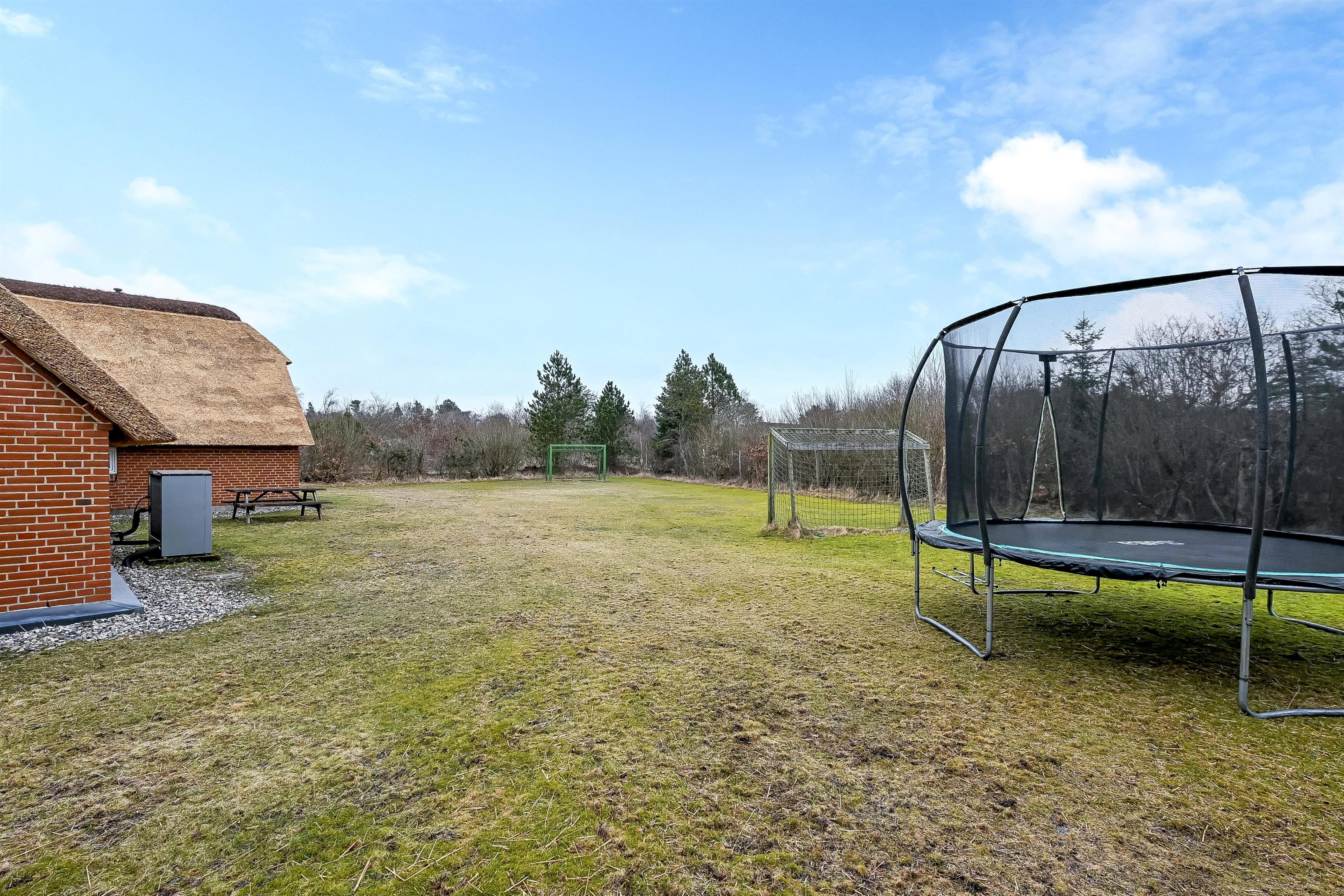Auf der großen Rasenfläche gibt es Fußballtore und viel Platz zum Toben und für Aktivitäten im Freien.