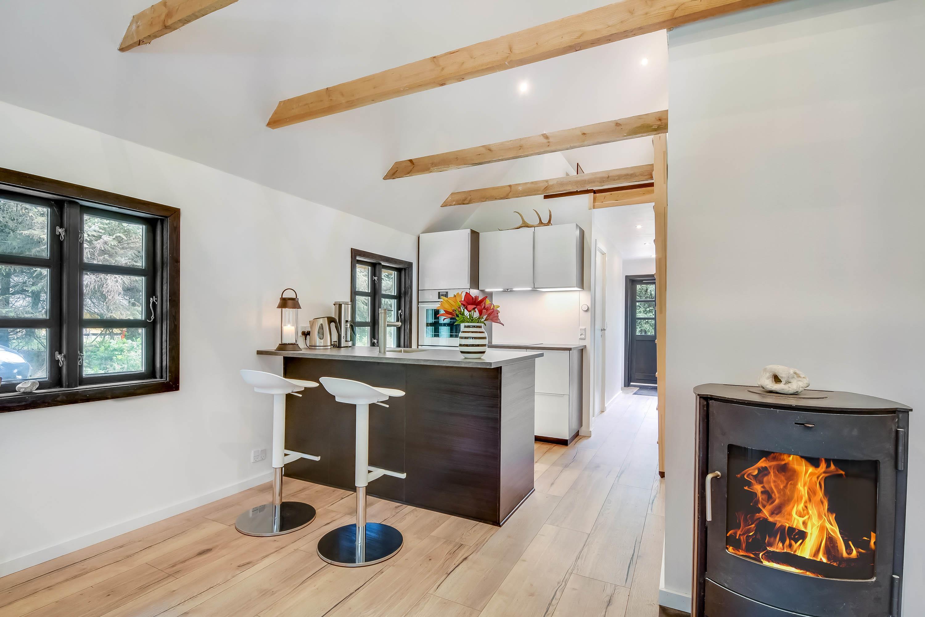 Der offene Wohnbereich verbindet Küche, Essplatz und Wohnzimmer zu einem einladenden Gemeinschaftsraum – ideal, um zusammen zu kochen, zu spielen oder den Abend am knisternden Kaminofen zu verbringen.
