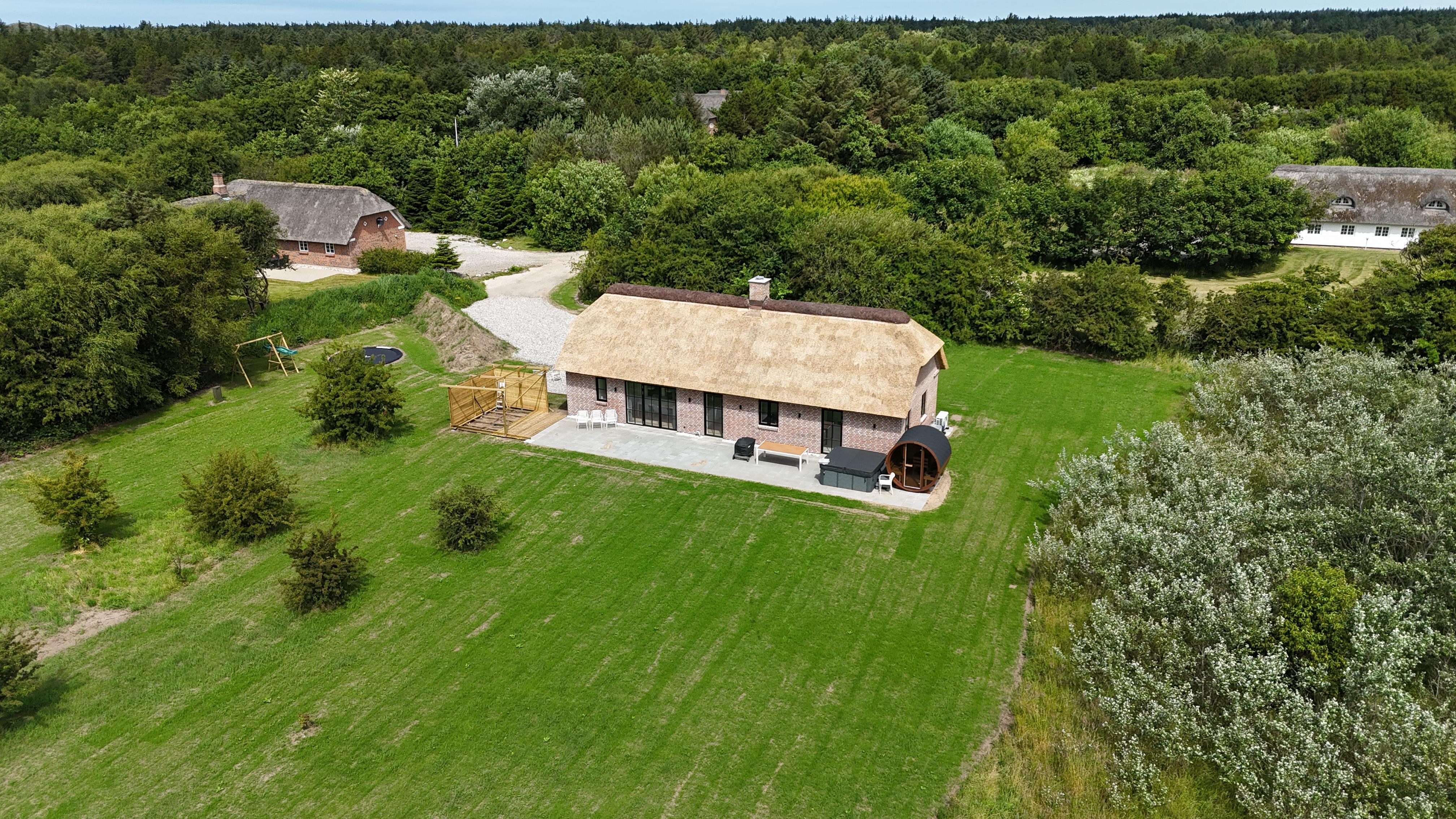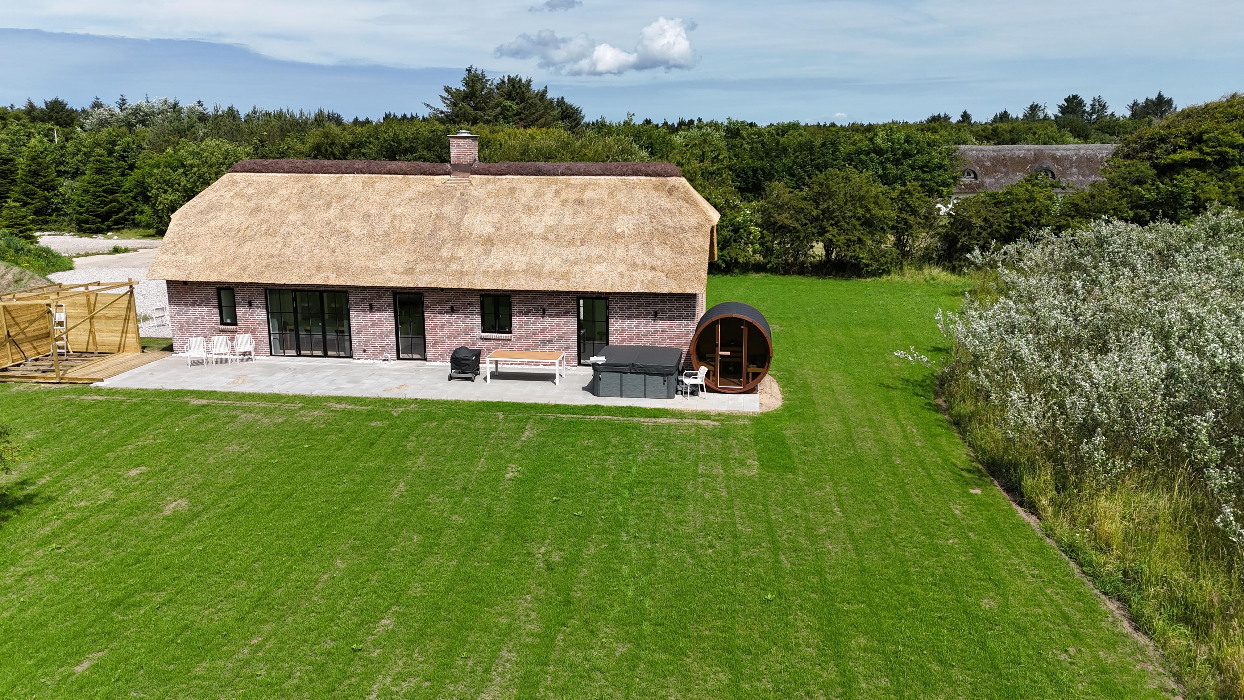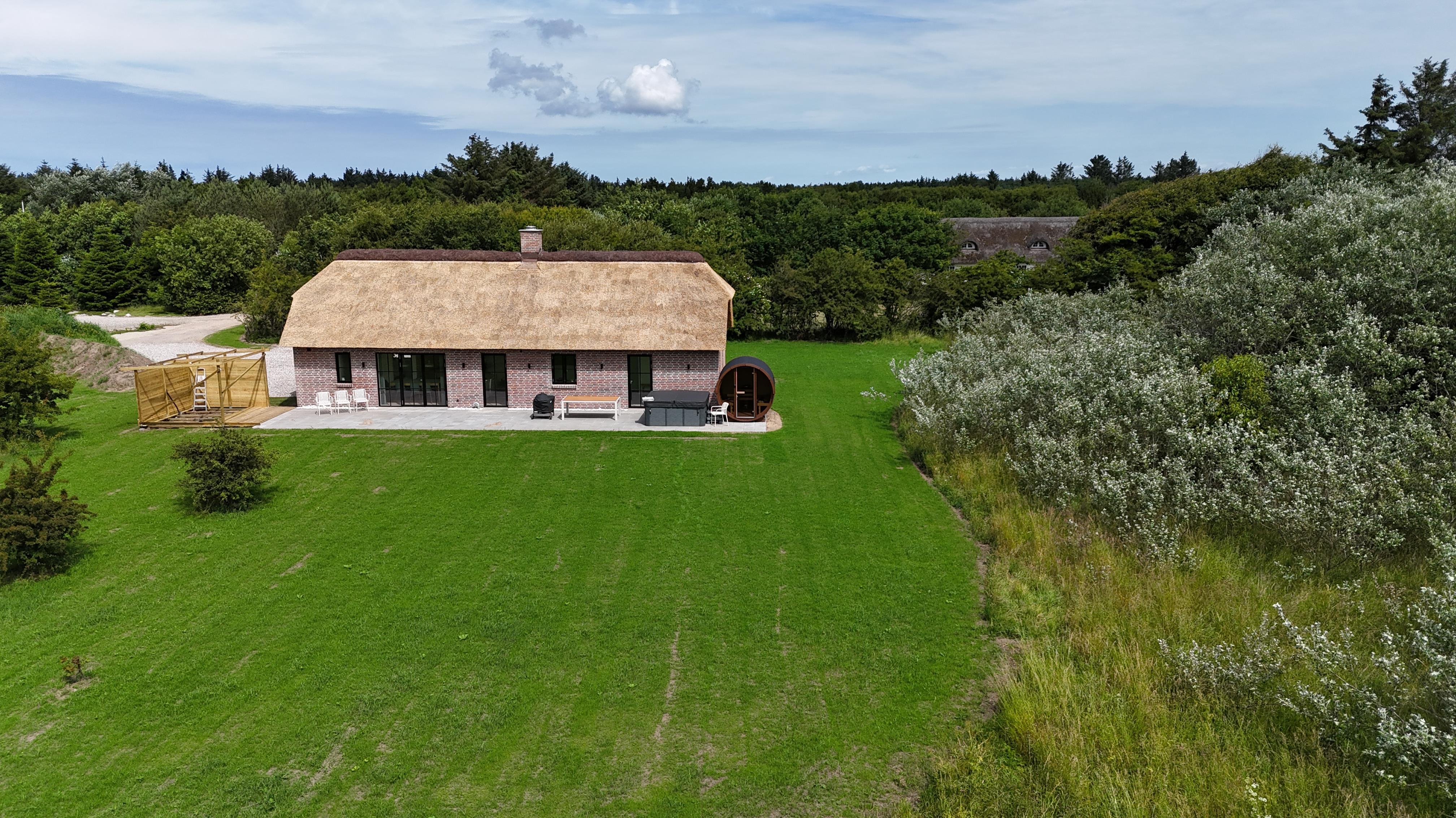 Auf einem wunderschönen, teilweise gepflegten Grundstück von 6.029 m² – umgeben von Natur, Himmel und frischer Nordseeluft – findest du dieses neue Ferienhaus, das im Frühjahr 2025 im authentischen westjütländischen Stil erbaut wurde.