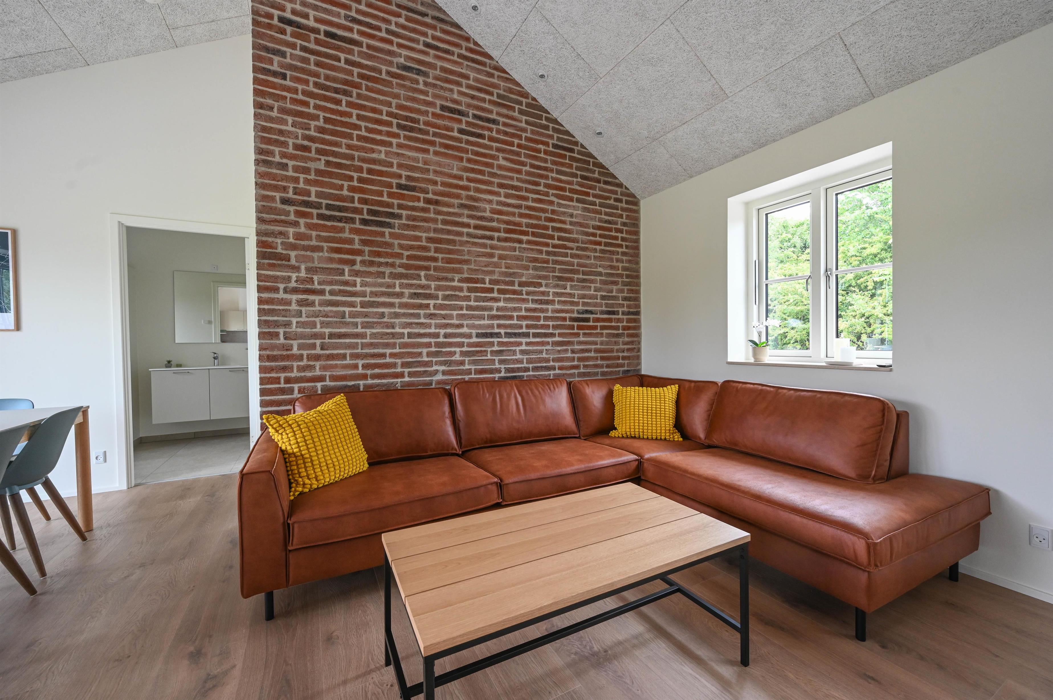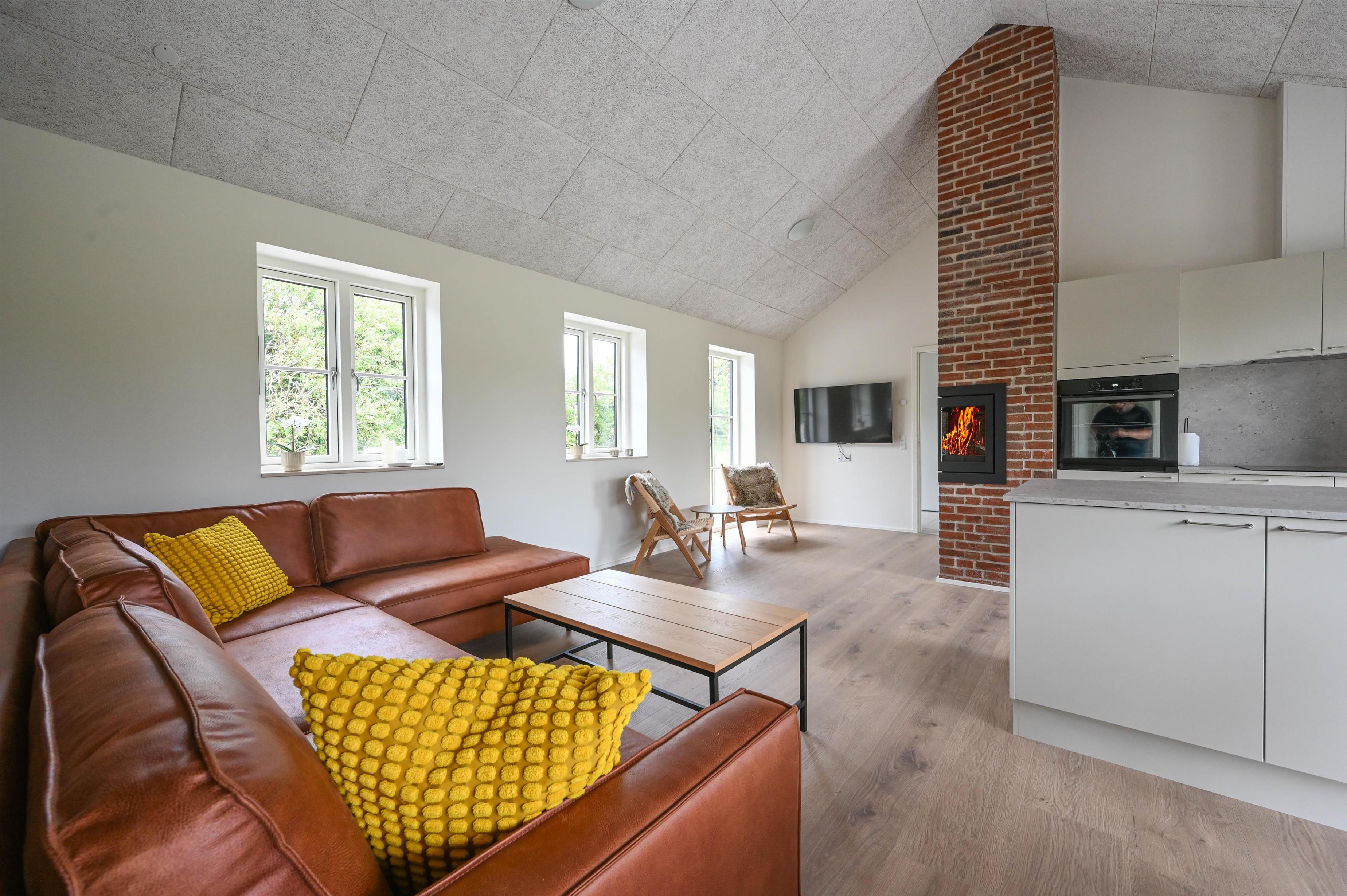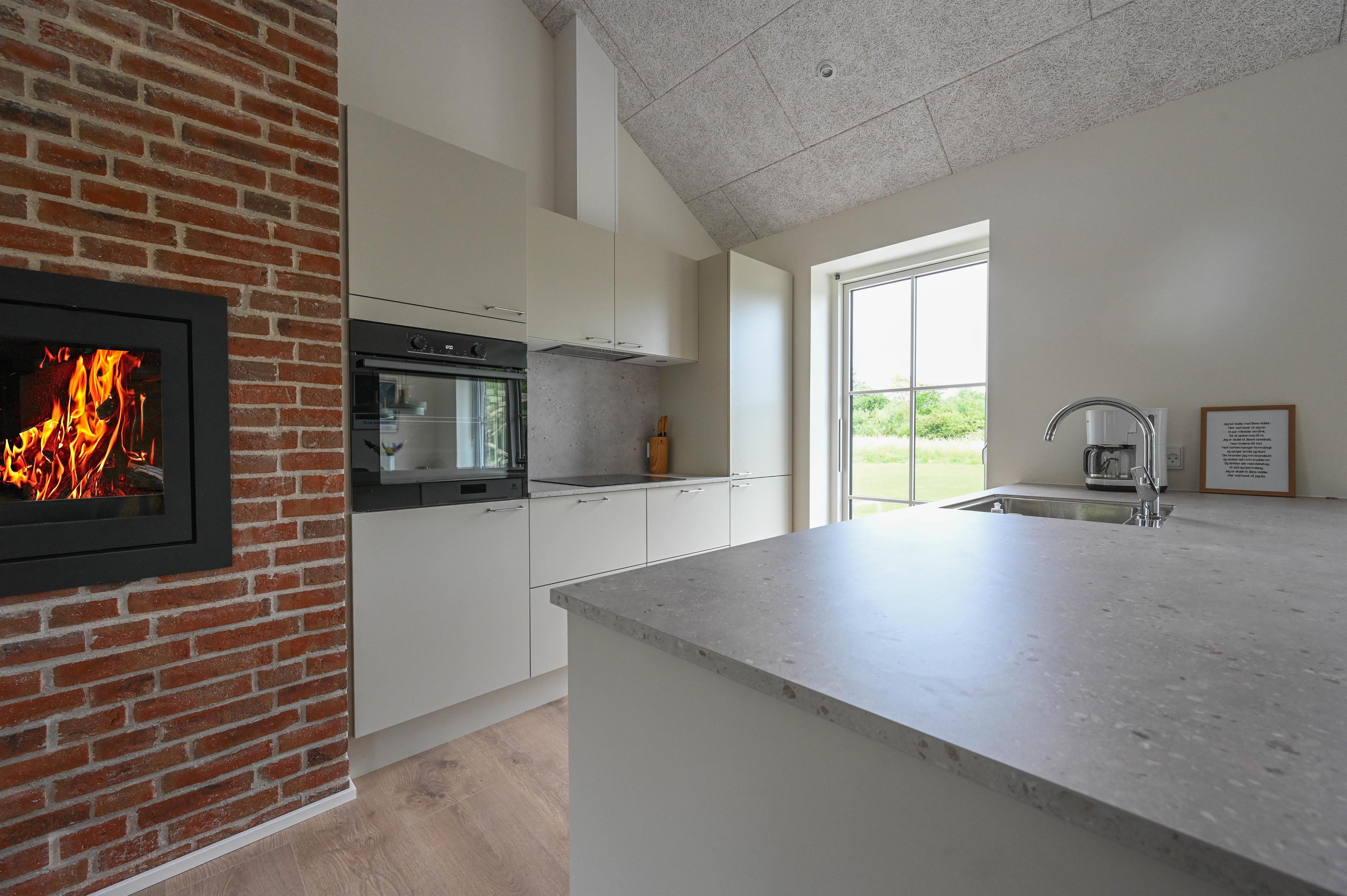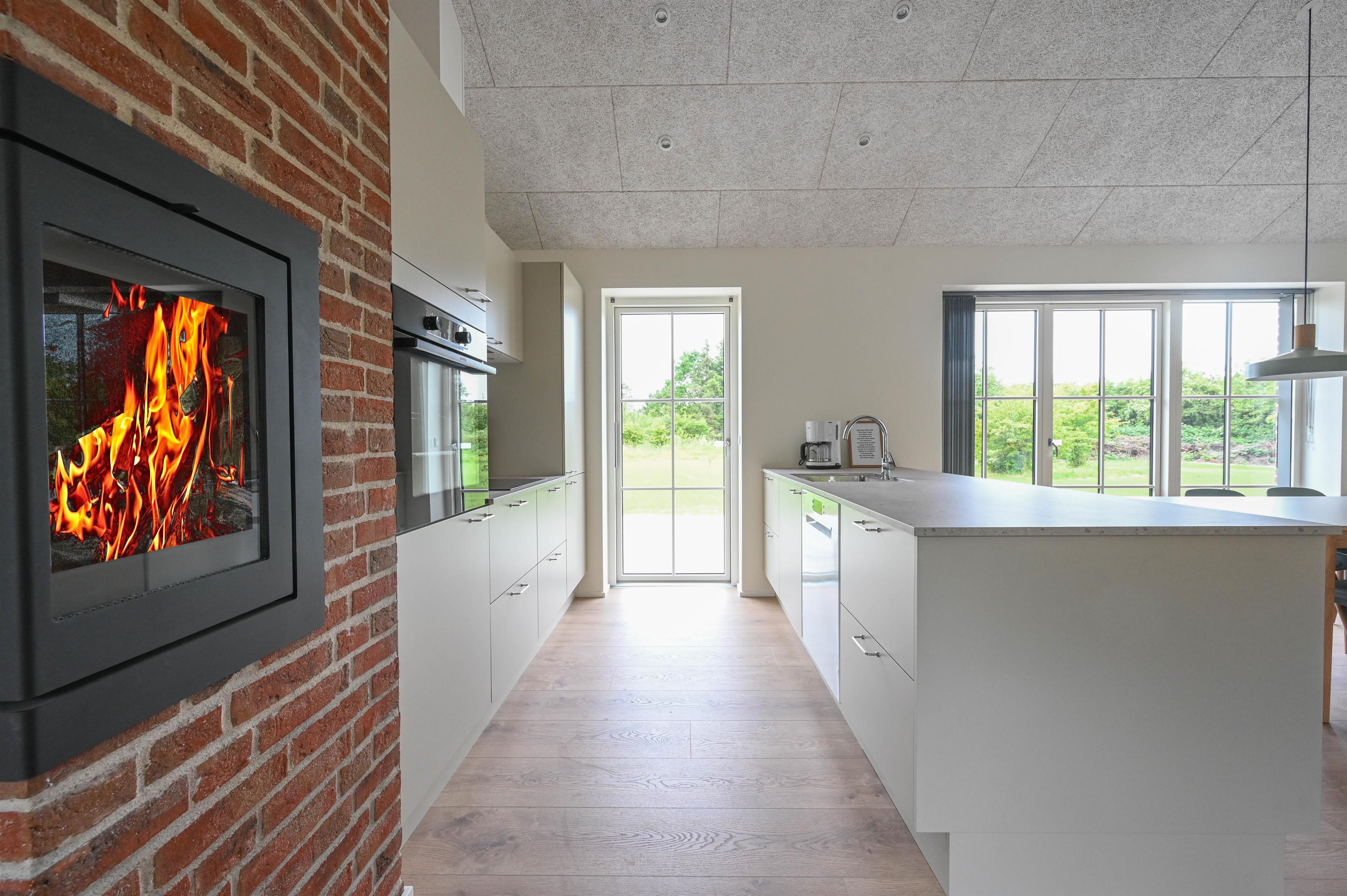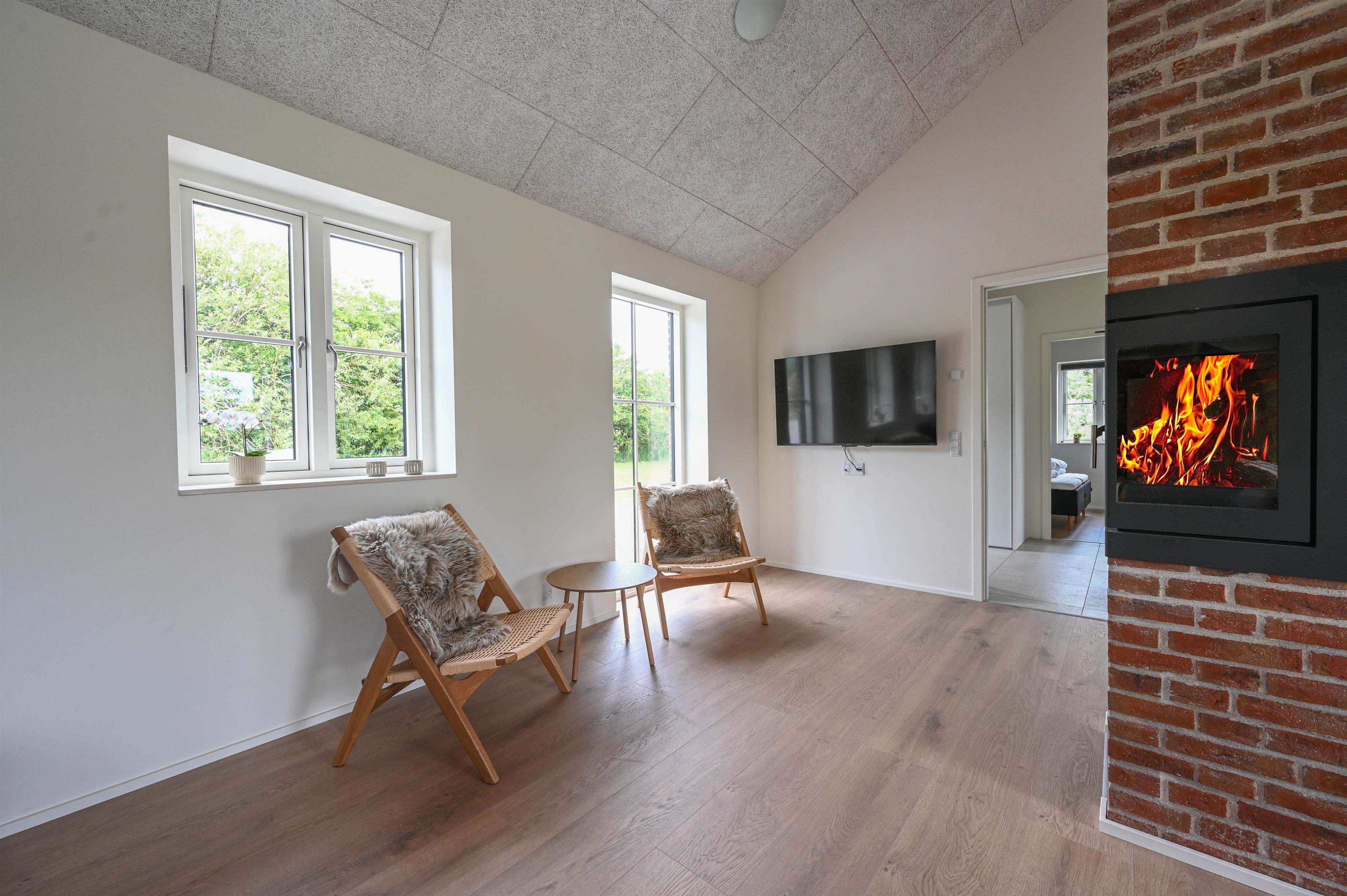 Der gemauerte Kamin verleiht dem Wohnraum eine gemütliche Atmosphäre – perfekt, um nach einem Tag am Meer zu entspannen, während draußen der Wind durch die Dünen weht.
