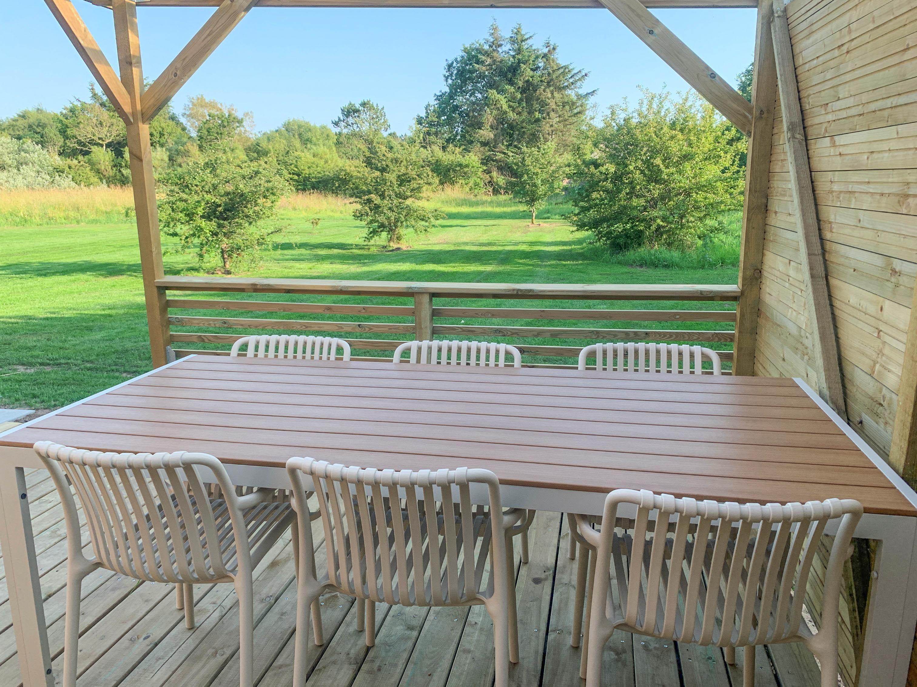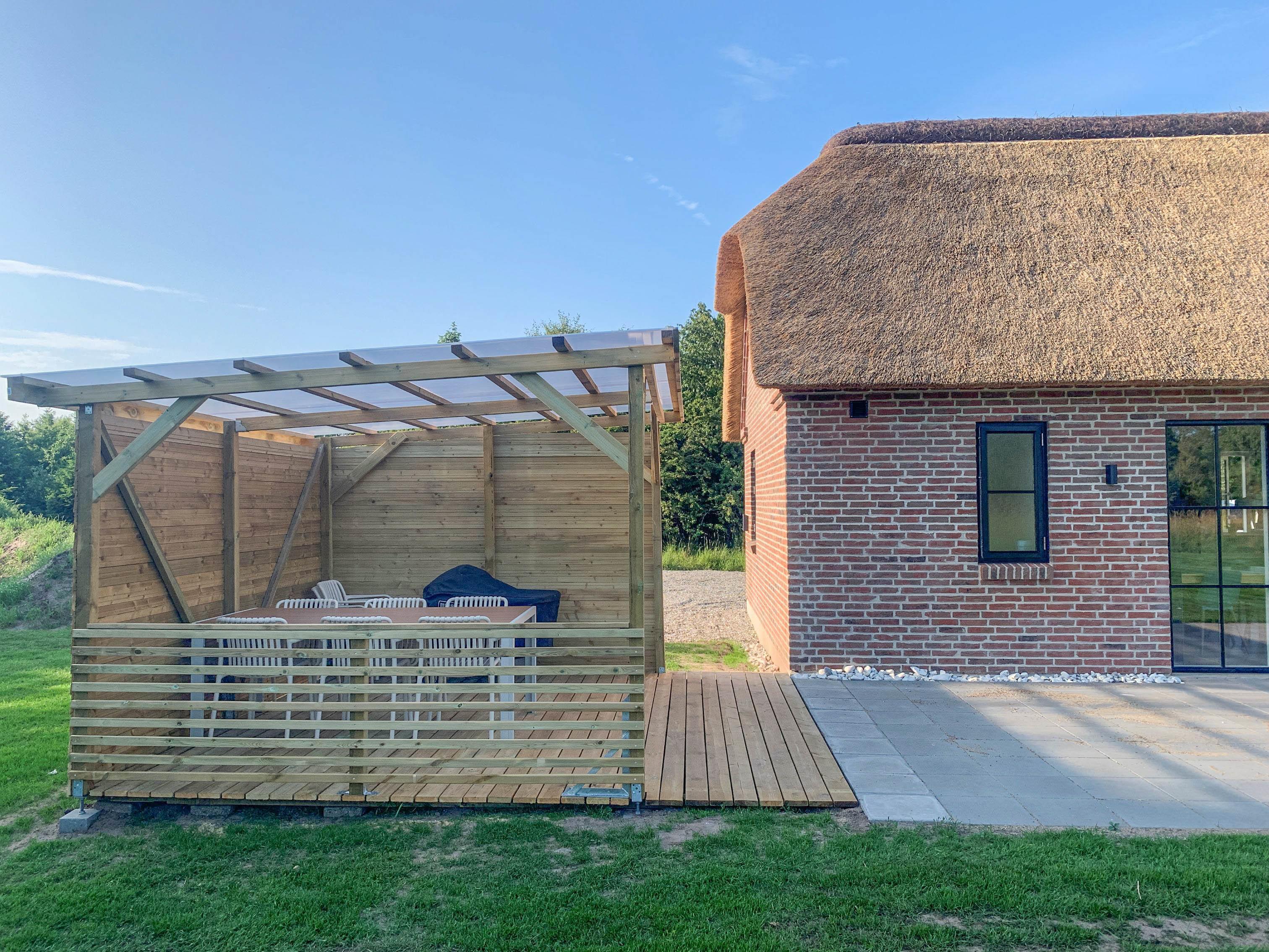 Draußen erwartet dich eine große Terrasse mit viel Sonne, Windschutz und Platz für die ganze Familie.