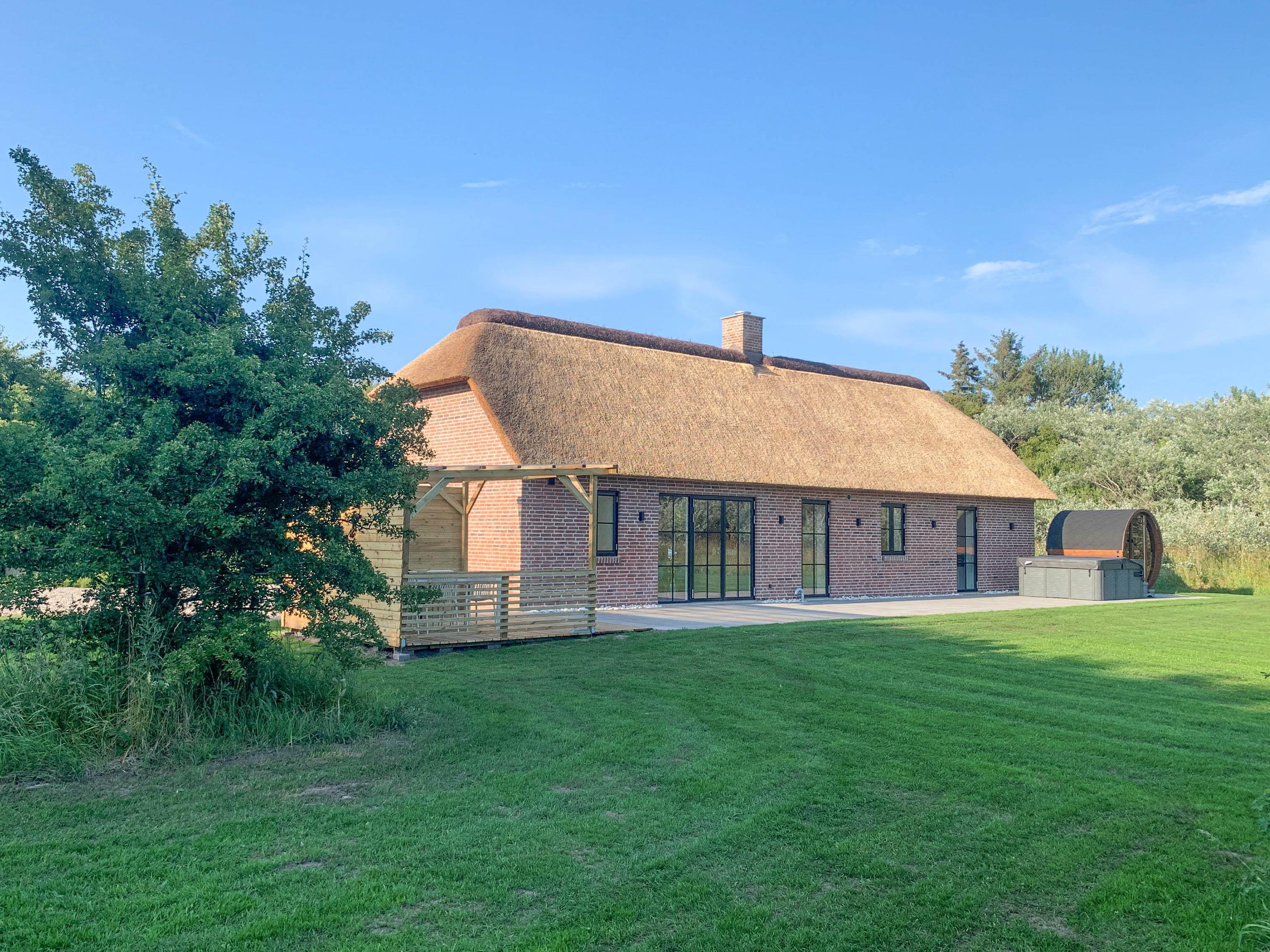 Ein neues, exklusives Ferienhaus im klassischen Stil – mit Reetdach, Kamin, Außen-Whirlpool und Sauna – nur einen kurzen Spaziergang vom Meer entfernt.