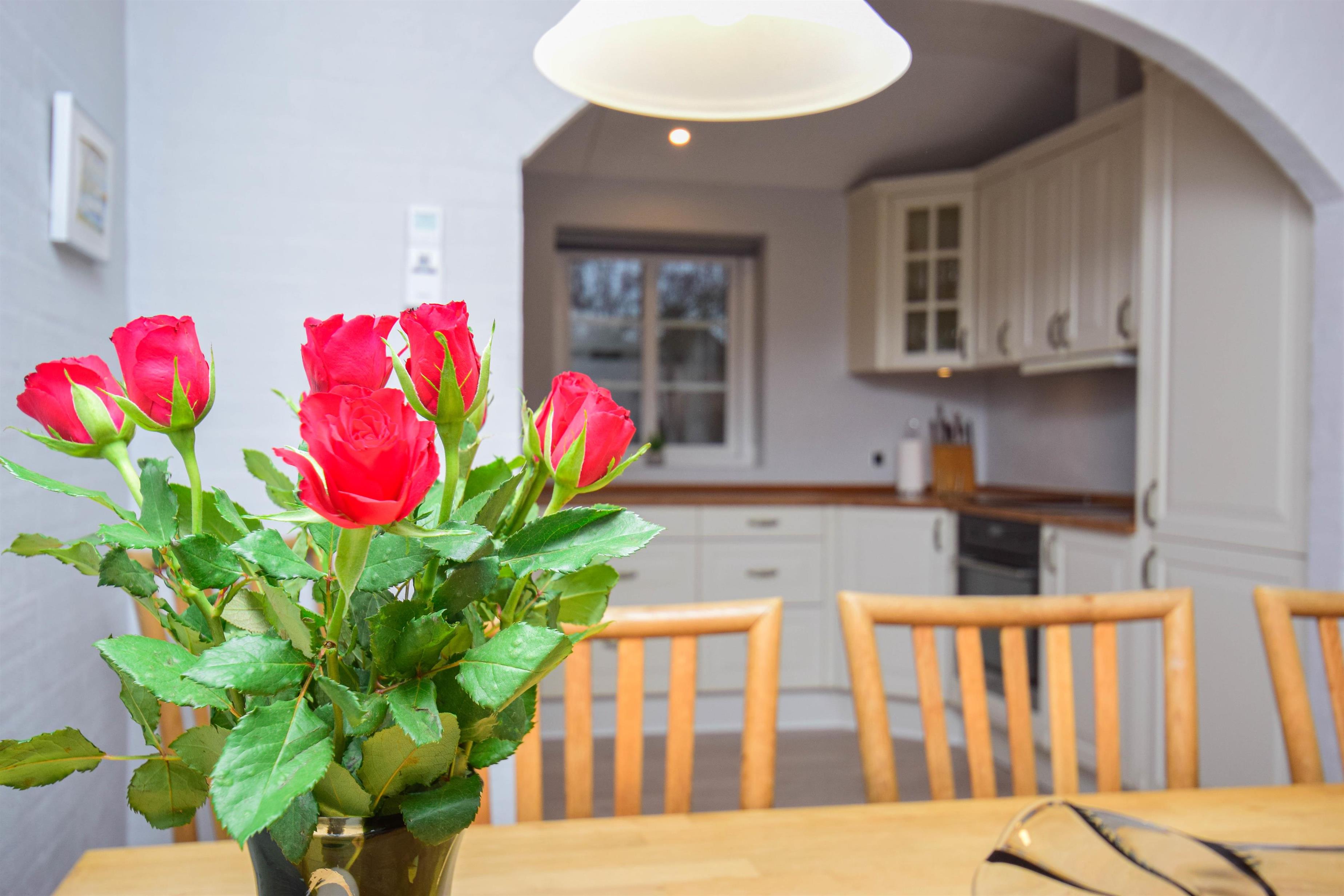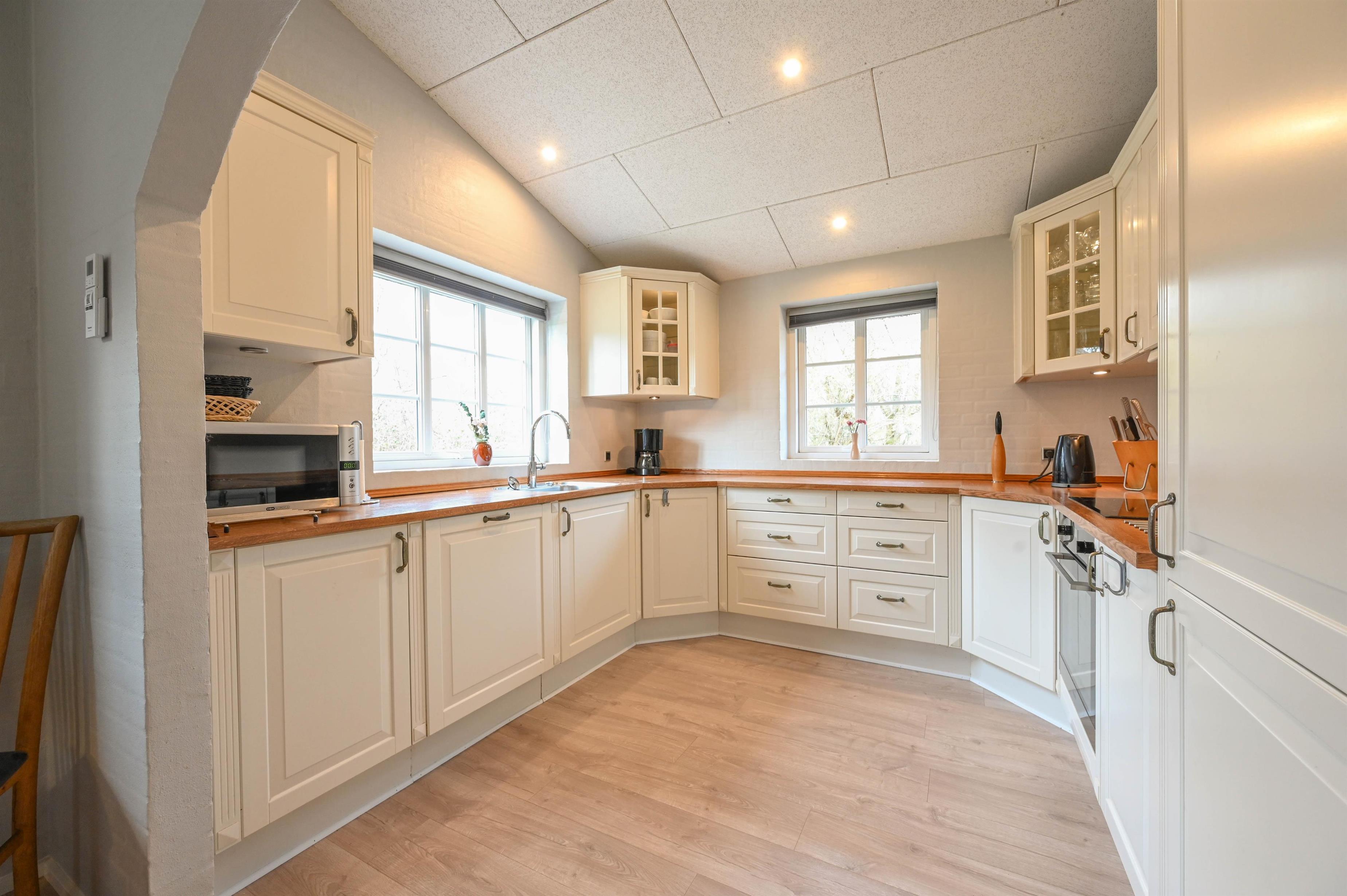 Die offene Wohnküche mit Essbereich und gemütlicher Sitzecke ist der natürliche Mittelpunkt des Hauses, und der Holzofen sorgt an kühleren Tagen für wohlige Wärme und eine gemütliche Atmosphäre.