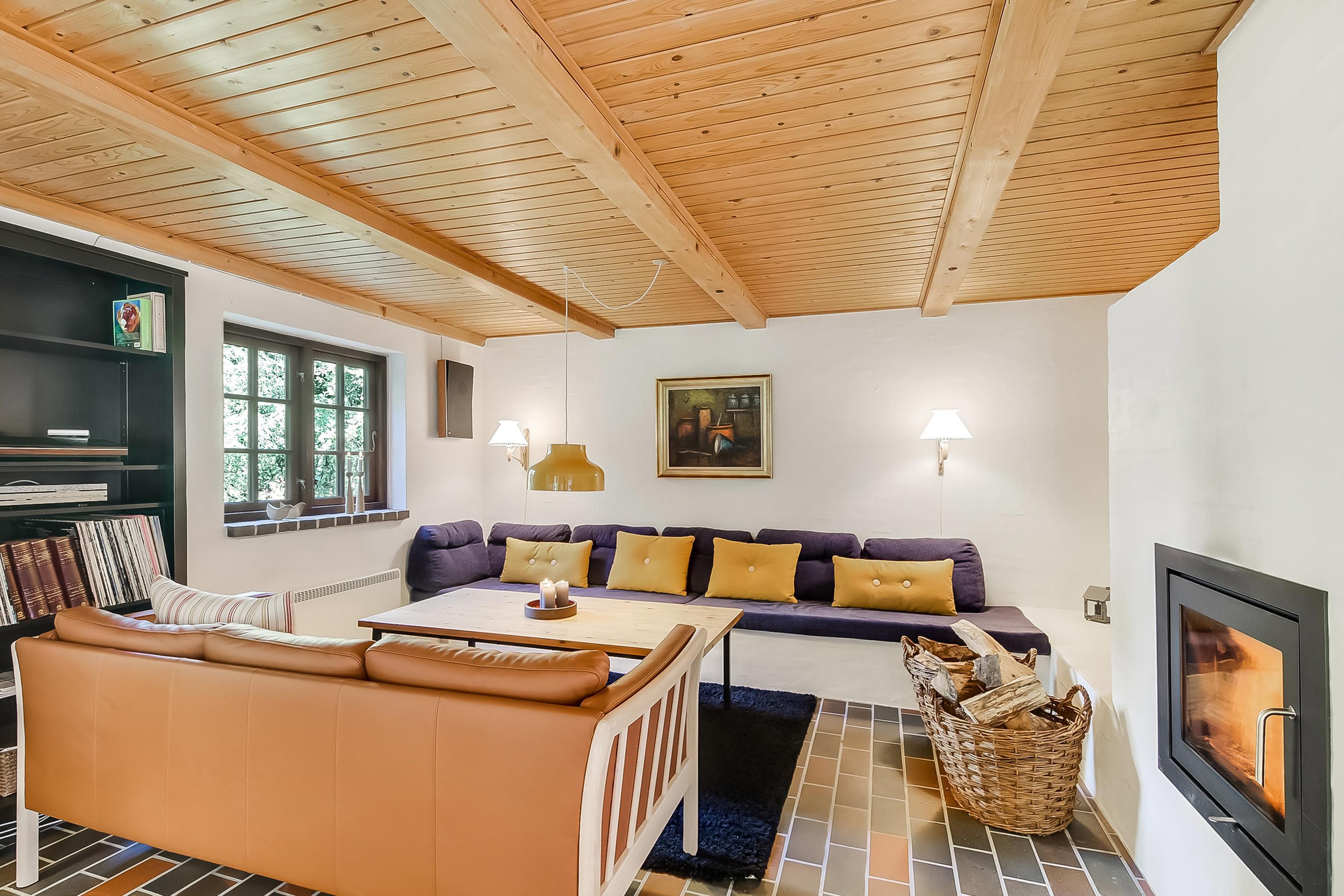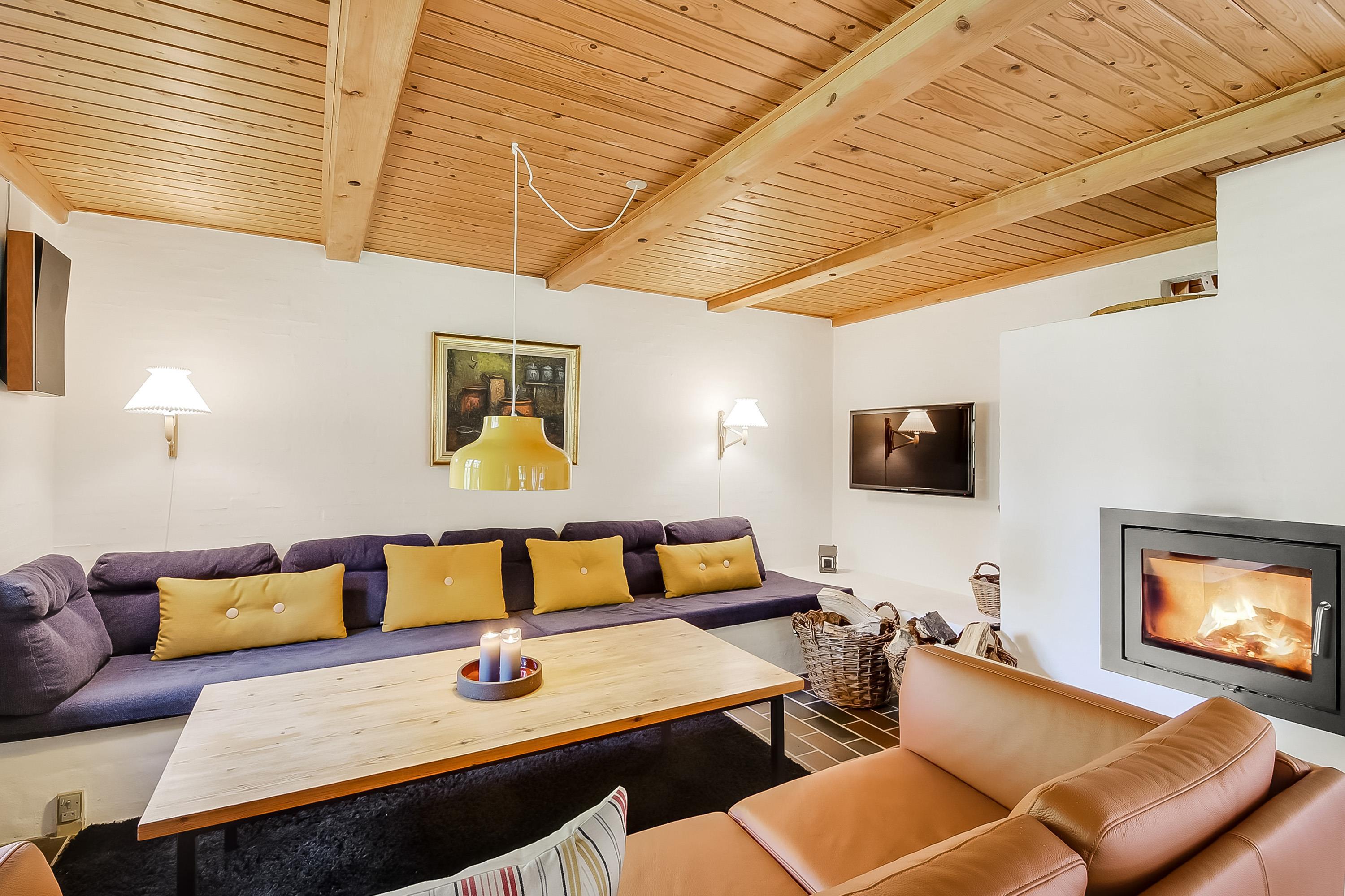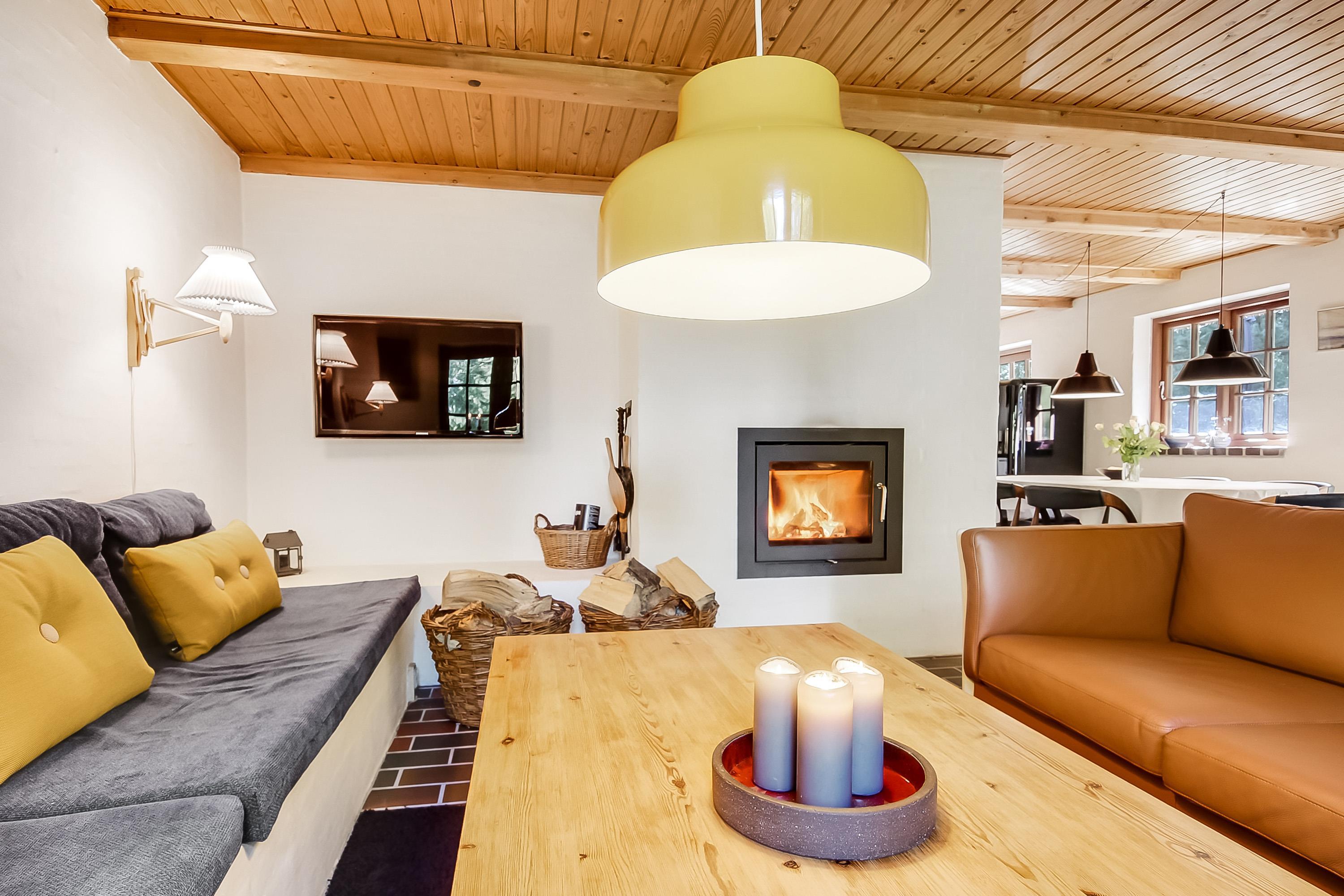 Im hellen Wohnzimmer findet ihr eine gemütliche Essecke, bequeme Möbel und einen Kaminofen mit Glaseinsatz, der an kühlen Tagen für Wärme und Stimmung sorgt.