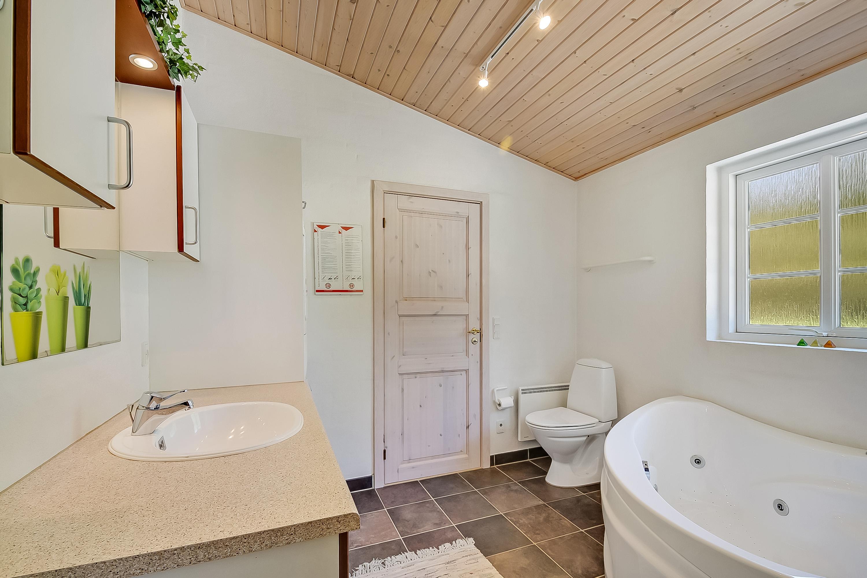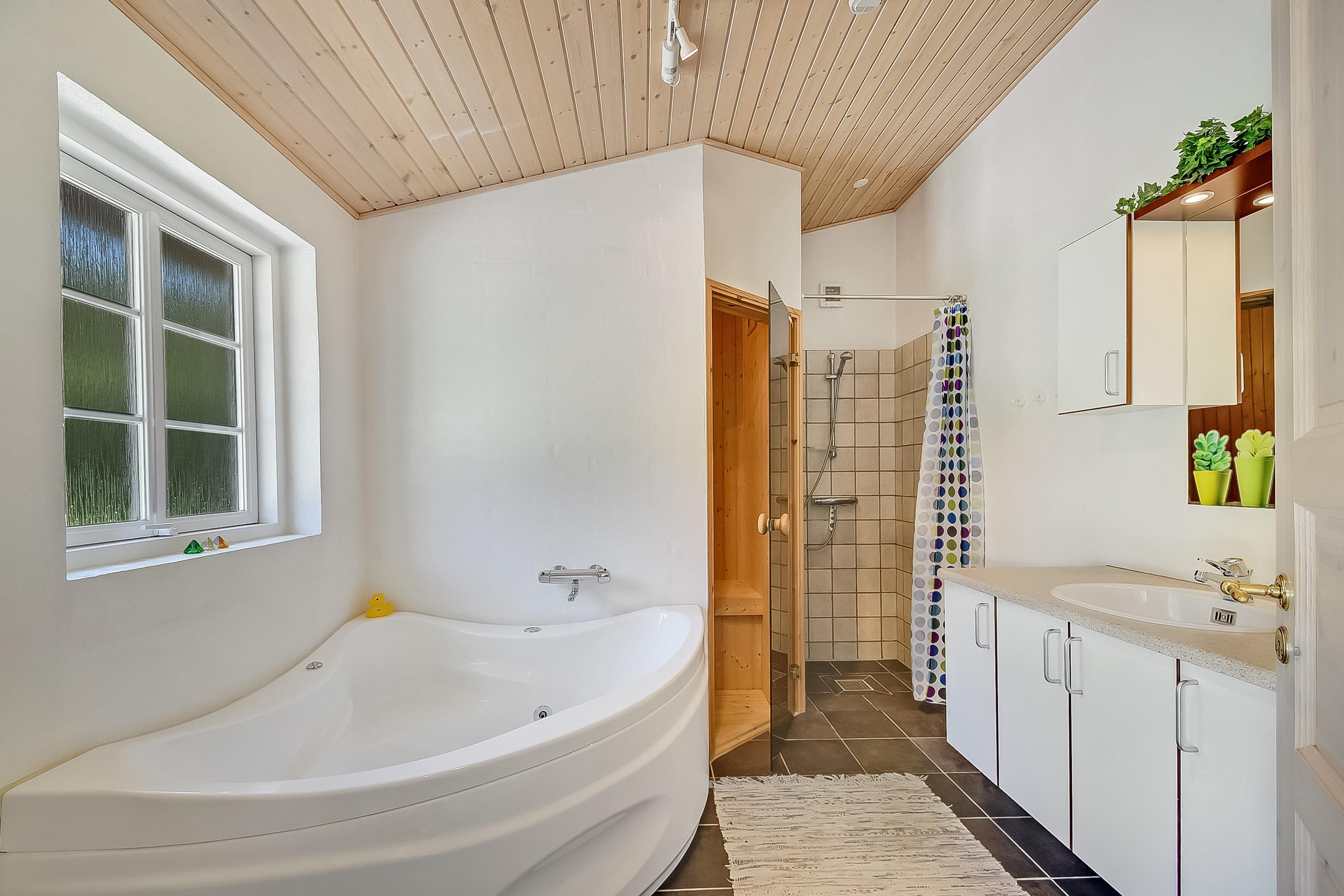 Badezimmer mit Whirlpool, Sauna, Fußbodenheizung, Waschmaschine und Trockner